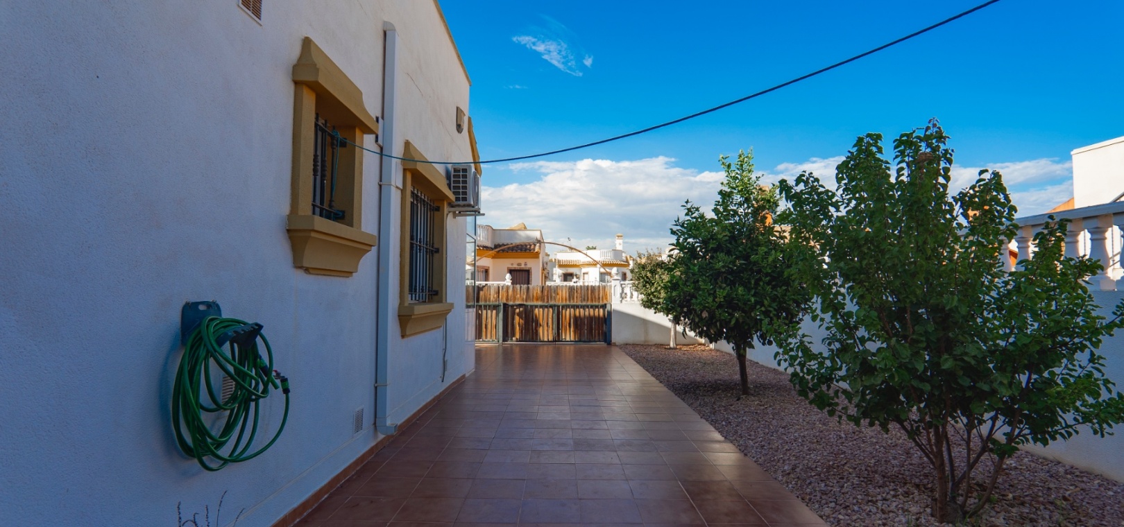 Betreten Sie diesen einladenden einstöckigen Bungalow in El Raso, ein Anwesen, das Komfort, Bequemlichkeit und mediterranen Lebensstil vereint. Gelegen auf einem großzügigen 210 m² großen Grundstück am Ende der Straße mit nur einer Seite Nachbarn, bietet dieses Haus sowohl Privatsphäre als auch eine freundliche Gemeinschaftsatmosphäre.