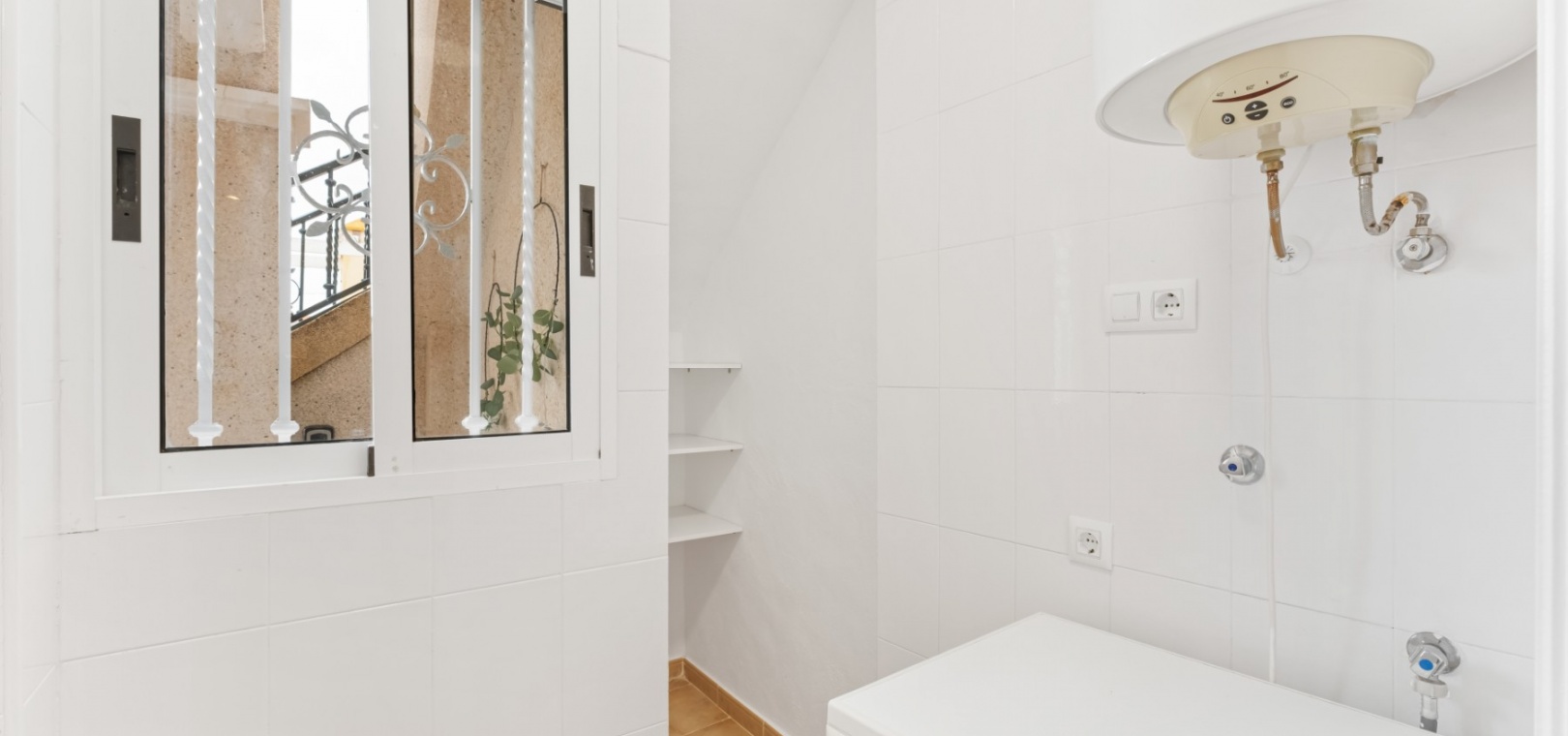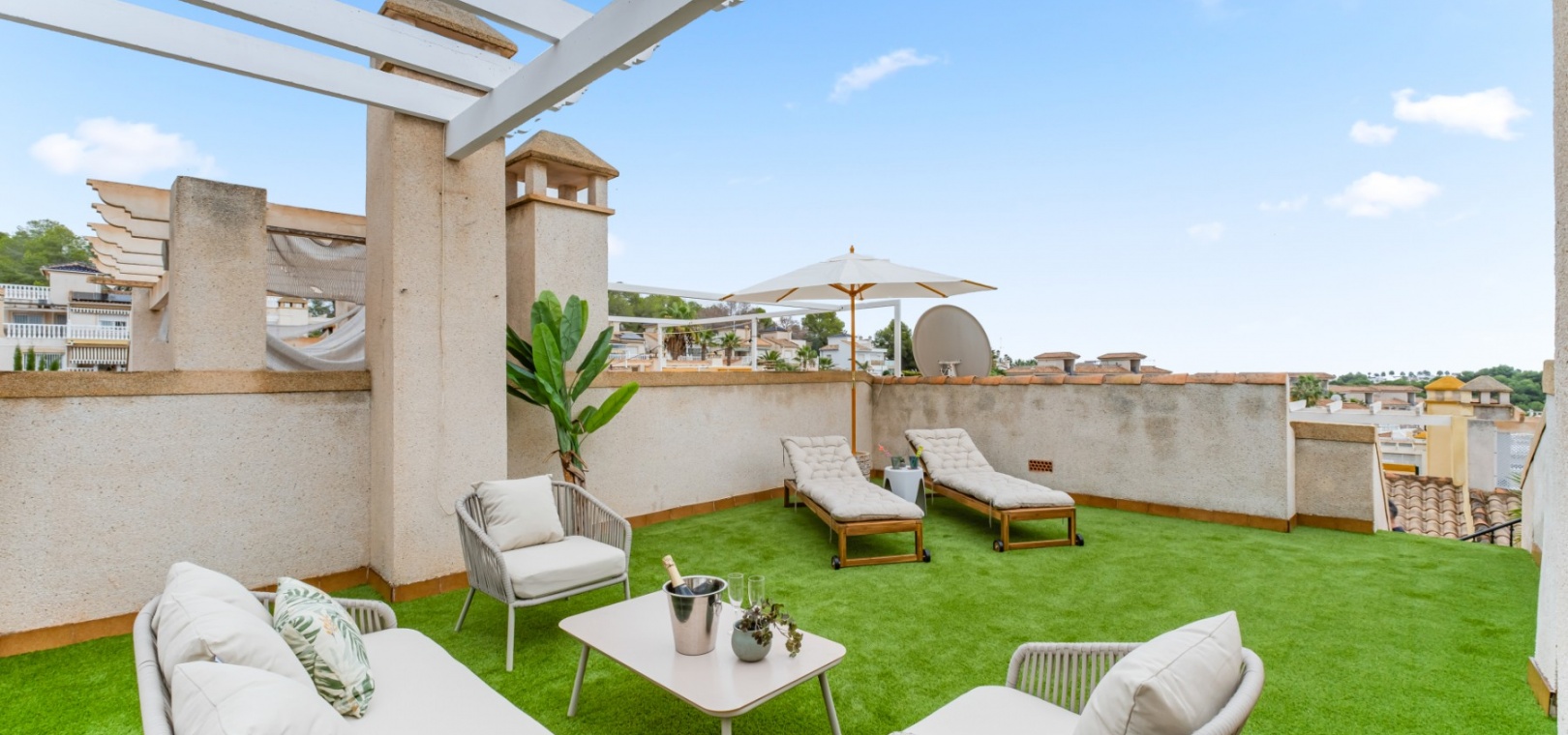 Draußen erwartet Sie eine sonnige Terrasse – ideal für den Morgenkaffee – und eine private Dachterrasse mit Kunstrasen, die zum Entspannen und für Unterhaltung einlädt. Die Immobilie verfügt außerdem über eine Klimaanlage, Zugang zu einem gepflegten Gemeinschaftspool und ist komplett möbliert und bezugsfertig.