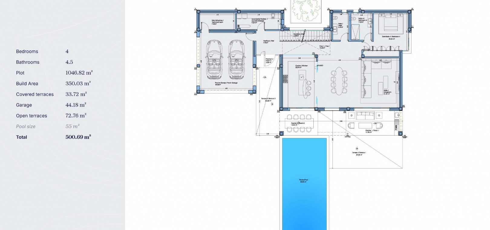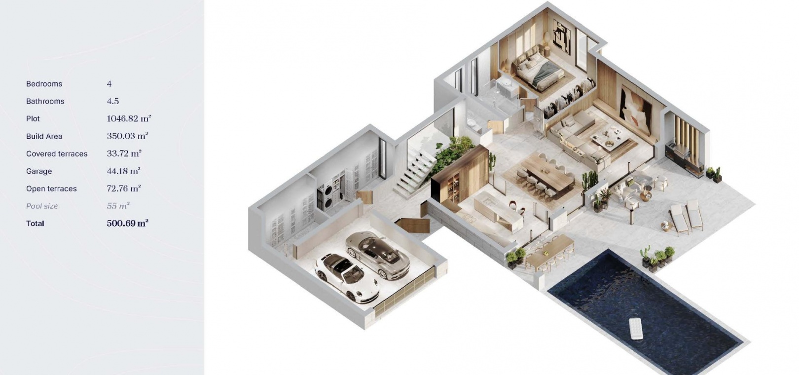 Jede Residenz wurde auf einem Grundstück von über 1.000 m² erbaut und erstreckt sich über zwei Ebenen. Sie verfügt über 4 oder 5 Schlafzimmer, einen privaten Swimmingpool und großzügige Terrassen, die sich perfekt für das Leben im Freien eignen. Einige Villen bieten sogar einen atemberaubenden Meerblick vom Obergeschoss aus. Die Fertigstellung ist für Anfang 2026 geplant, sodass Sie Ihren Traum vom Leben am Mittelmeer verwirklichen können.