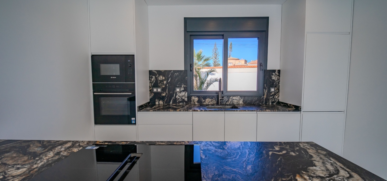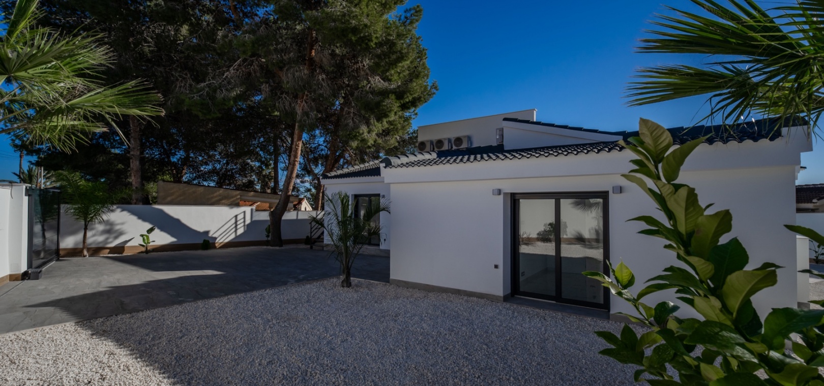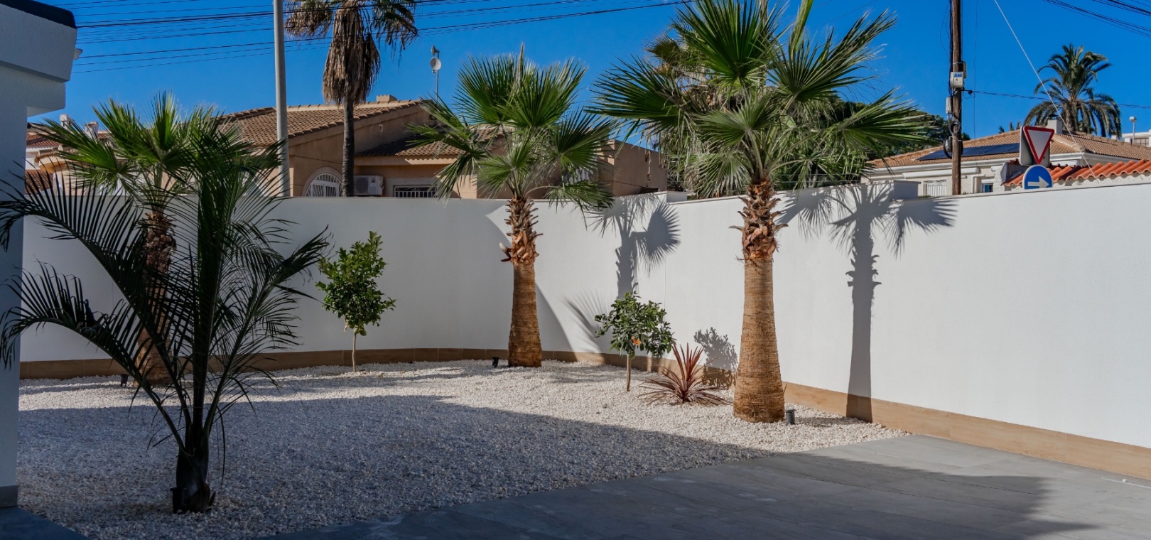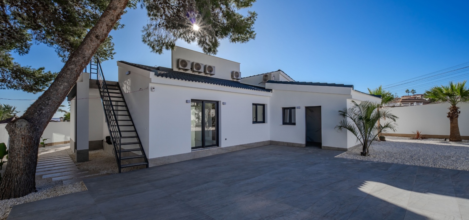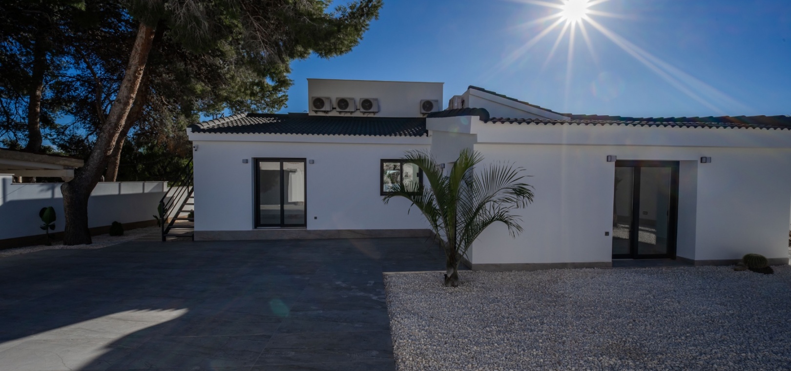 Atemberaubende, komplett sanierte Bungalowvilla in Ciudad Quesada (Alicante) – Die perfekte Verbindung von modernem Luxus und mediterraner Eleganz. In der begehrten Gegend von Ciudad Quesada (Alicante) und nur wenige Schritte vom lebhaften Stadtzentrum entfernt, wurde diese exquisite Bungalowvilla mit außergewöhnlicher Liebe zum Detail komplett saniert. Traditioneller mediterraner Charme trifft auf ein modernes, elegantes Design. Das Anwesen bietet Luxus, Komfort und Privatsphäre in einer der begehrtesten Lagen der Costa Blanca. Auf einem 650 m² großen Privatgrundstück gelegen, bietet die Villa 180 m² wunderschön gestaltete Wohnfläche und ist bezugsfertig. Die Ausstattung entspricht höchsten Standards – hier wurde an nichts gespart. Außenbereich: Hinter dem elektrischen Einfahrtstor erwartet Sie ein stilvoller, pflegeleichter mediterraner Garten, der das Haus perfekt einrahmt. Der private Swimmingpool grenzt an großzügige Terrassen, die zum Sonnenbaden, Essen oder für gesellige Stunden einladen. Das beeindruckende, große Solarium auf dem Dach bietet einen weiten Ausblick und einen exklusiven Bereich zum Entspannen, für Feiern oder um das milde Mikroklima von Alicante zu genießen. Raumaufteilung: Das Interieur besticht durch ein helles, offenes Raumkonzept mit viel Tageslicht. Vier bis fünf geräumige Schlafzimmer, alle als Suiten gestaltet, verfügen über vier luxuriöse Badezimmer en suite. Die Schlafzimmer sind mit Einbauschränken ausgestattet, die individuell nach den Wünschen der Kunden angepasst werden können. Die moderne offene Küche bietet hochwertige Geräte und beeindruckende Naturstein-Arbeitsplatten. Fußbodenheizung sorgt im gesamten Haus für angenehme Temperaturen. Klimaanlage (warm/kalt) ist in jedem Zimmer vorhanden. Die Kombination aus Raumaufteilung, Licht und edlen Materialien schafft ein komfortables und elegantes Wohnambiente. Weitere Merkmale: Ein fortschrittliches Smart-Home-System steuert Beleuchtung, Klima und Sicherheit. Separater Wasch- und Abstellraum. Hochwertige Ausstattung im gesamten Haus, darunter Designerleuchten, edle Fliesen und hochwertige Schreinerarbeiten. Bezugsfertiger Luxus, makellos renoviert. Lage: Nur wenige Minuten vom Stadtzentrum von Ciudad Quesada mit seinen Restaurants, Supermärkten, Dienstleistungen und Freizeiteinrichtungen entfernt, bietet diese Villa die ideale Balance zwischen Komfort, Privatsphäre und modernem mediterranem Wohnstil.