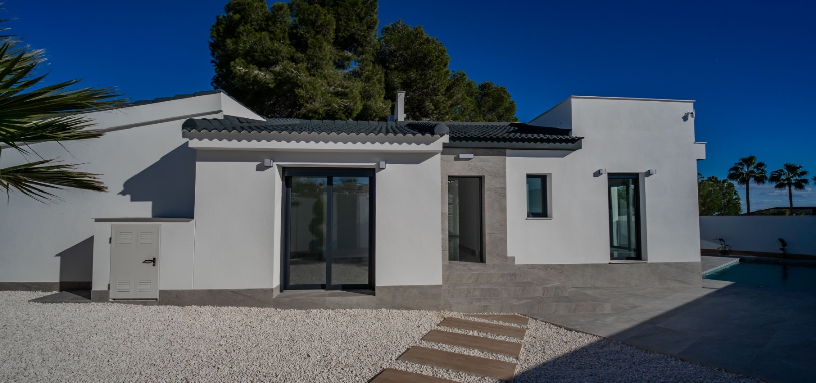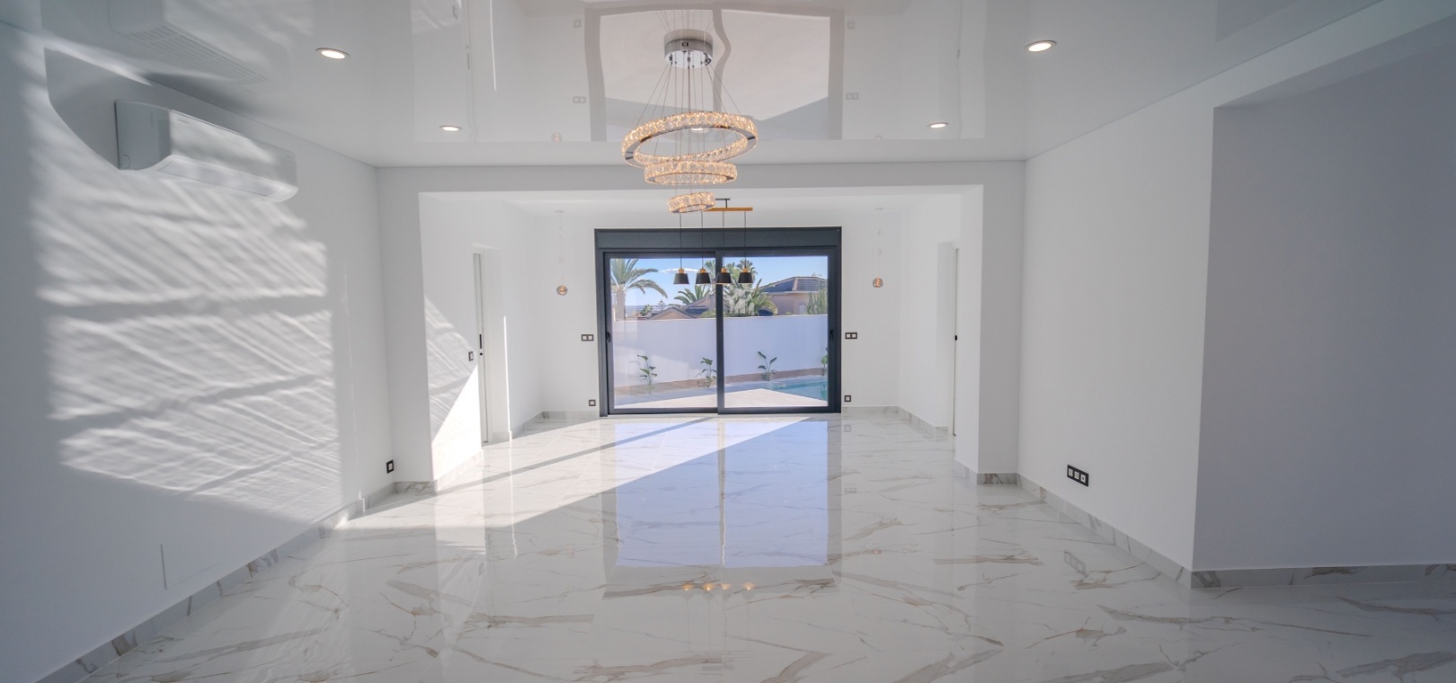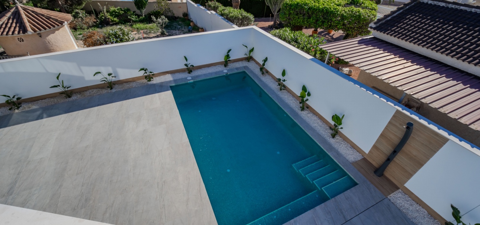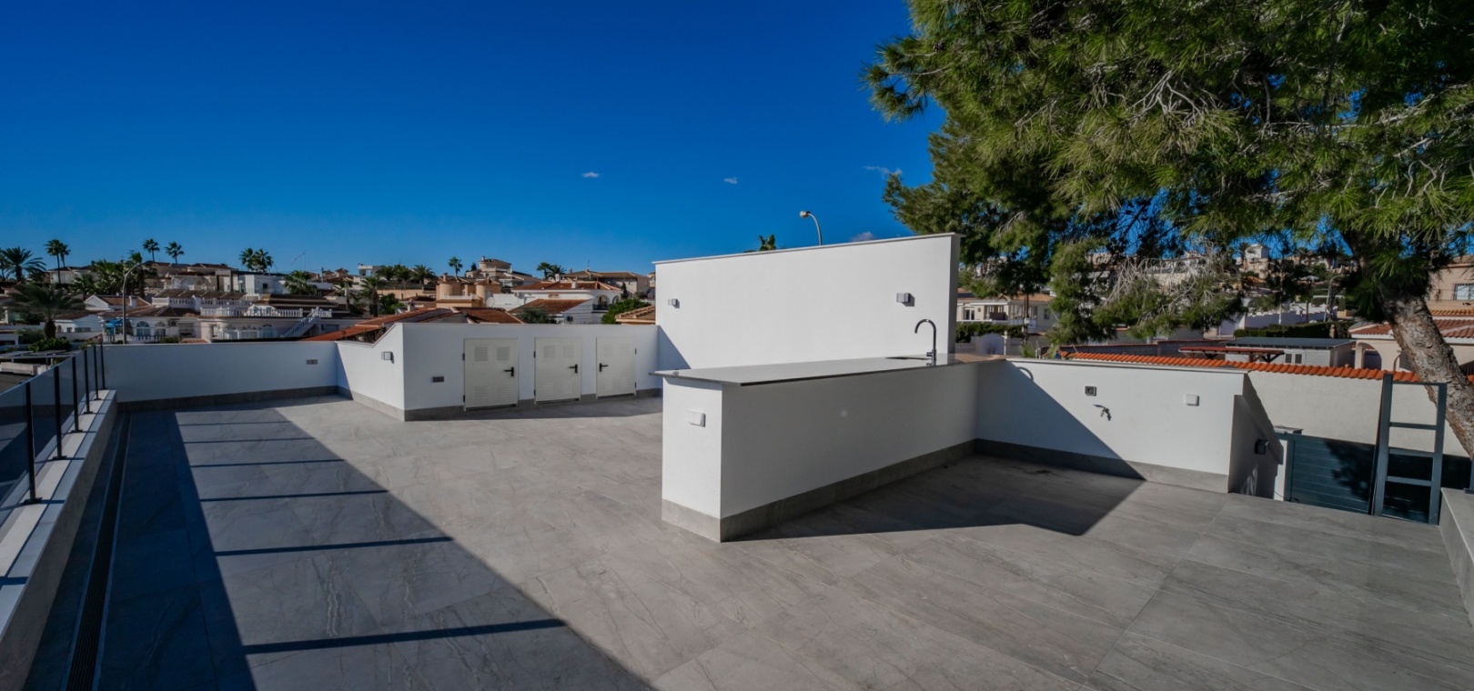 Atemberaubende, komplett sanierte Bungalowvilla in Ciudad Quesada (Alicante) – Die perfekte Verbindung von modernem Luxus und mediterraner Eleganz. In der begehrten Gegend von Ciudad Quesada (Alicante) und nur wenige Schritte vom lebhaften Stadtzentrum entfernt, wurde diese exquisite Bungalowvilla mit außergewöhnlicher Liebe zum Detail komplett saniert. Traditioneller mediterraner Charme trifft auf ein modernes, elegantes Design. Das Anwesen bietet Luxus, Komfort und Privatsphäre in einer der begehrtesten Lagen der Costa Blanca. Auf einem 650 m² großen Privatgrundstück gelegen, bietet die Villa 180 m² wunderschön gestaltete Wohnfläche und ist bezugsfertig. Die Ausstattung entspricht höchsten Standards – hier wurde an nichts gespart. Außenbereich: Hinter dem elektrischen Einfahrtstor erwartet Sie ein stilvoller, pflegeleichter mediterraner Garten, der das Haus perfekt einrahmt. Der private Swimmingpool grenzt an großzügige Terrassen, die zum Sonnenbaden, Essen oder für gesellige Stunden einladen. Das beeindruckende, große Solarium auf dem Dach bietet einen weiten Ausblick und einen exklusiven Bereich zum Entspannen, für Feiern oder um das milde Mikroklima von Alicante zu genießen. Raumaufteilung: Das Interieur besticht durch ein helles, offenes Raumkonzept mit viel Tageslicht. Vier bis fünf geräumige Schlafzimmer, alle als Suiten gestaltet, verfügen über vier luxuriöse Badezimmer en suite. Die Schlafzimmer sind mit Einbauschränken ausgestattet, die individuell nach den Wünschen der Kunden angepasst werden können. Die moderne offene Küche bietet hochwertige Geräte und beeindruckende Naturstein-Arbeitsplatten. Fußbodenheizung sorgt im gesamten Haus für angenehme Temperaturen. Klimaanlage (warm/kalt) ist in jedem Zimmer vorhanden. Die Kombination aus Raumaufteilung, Licht und edlen Materialien schafft ein komfortables und elegantes Wohnambiente. Weitere Merkmale: Ein fortschrittliches Smart-Home-System steuert Beleuchtung, Klima und Sicherheit. Separater Wasch- und Abstellraum. Hochwertige Ausstattung im gesamten Haus, darunter Designerleuchten, edle Fliesen und hochwertige Schreinerarbeiten. Bezugsfertiger Luxus, makellos renoviert. Lage: Nur wenige Minuten vom Stadtzentrum von Ciudad Quesada mit seinen Restaurants, Supermärkten, Dienstleistungen und Freizeiteinrichtungen entfernt, bietet diese Villa die ideale Balance zwischen Komfort, Privatsphäre und modernem mediterranem Wohnstil.