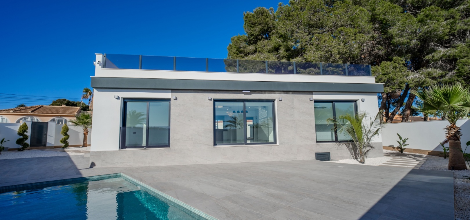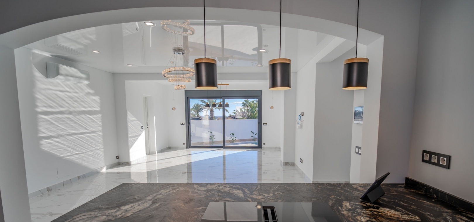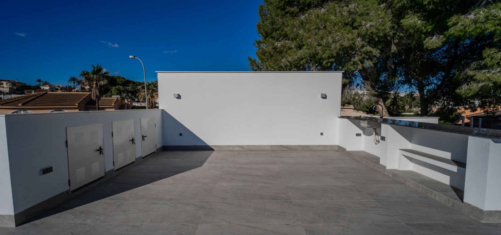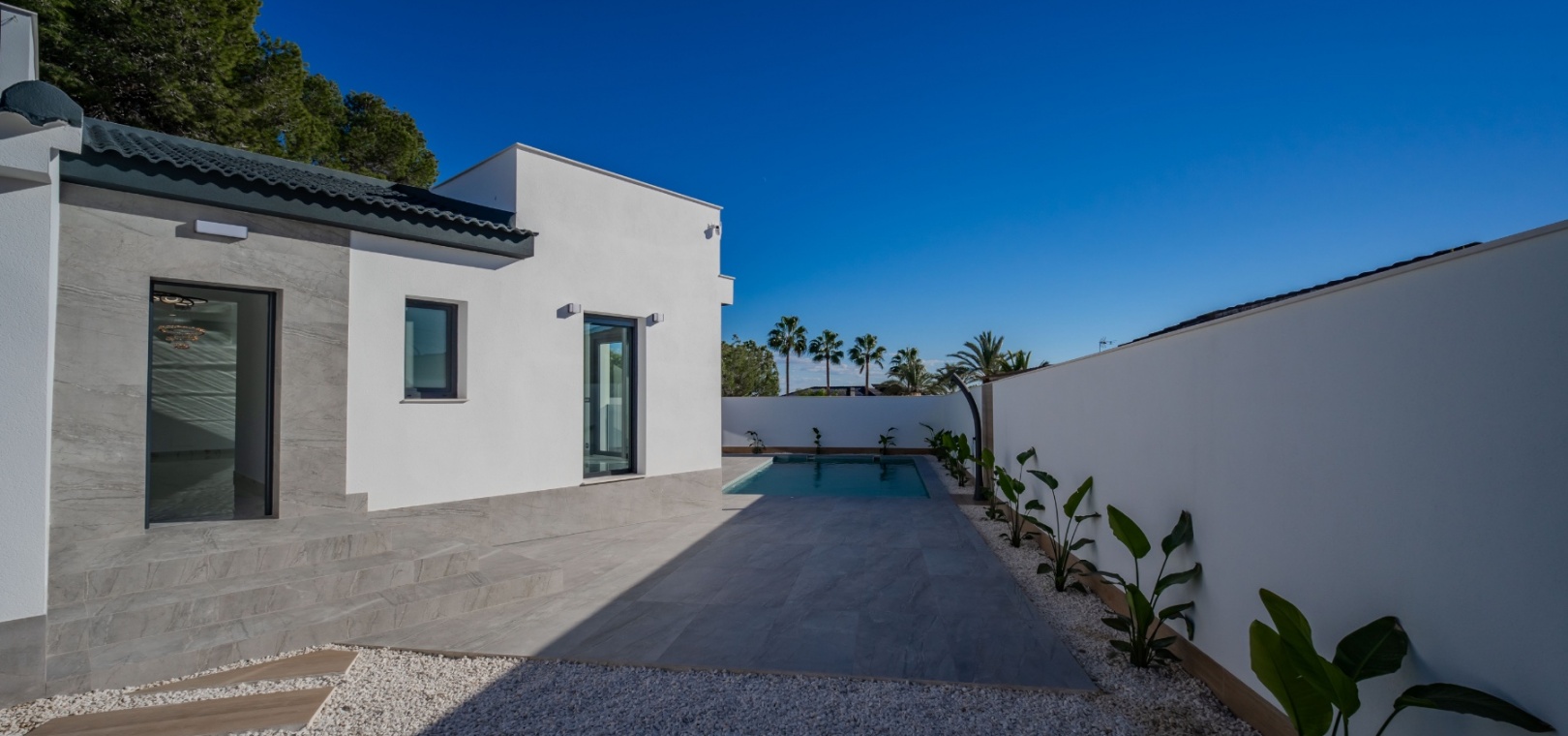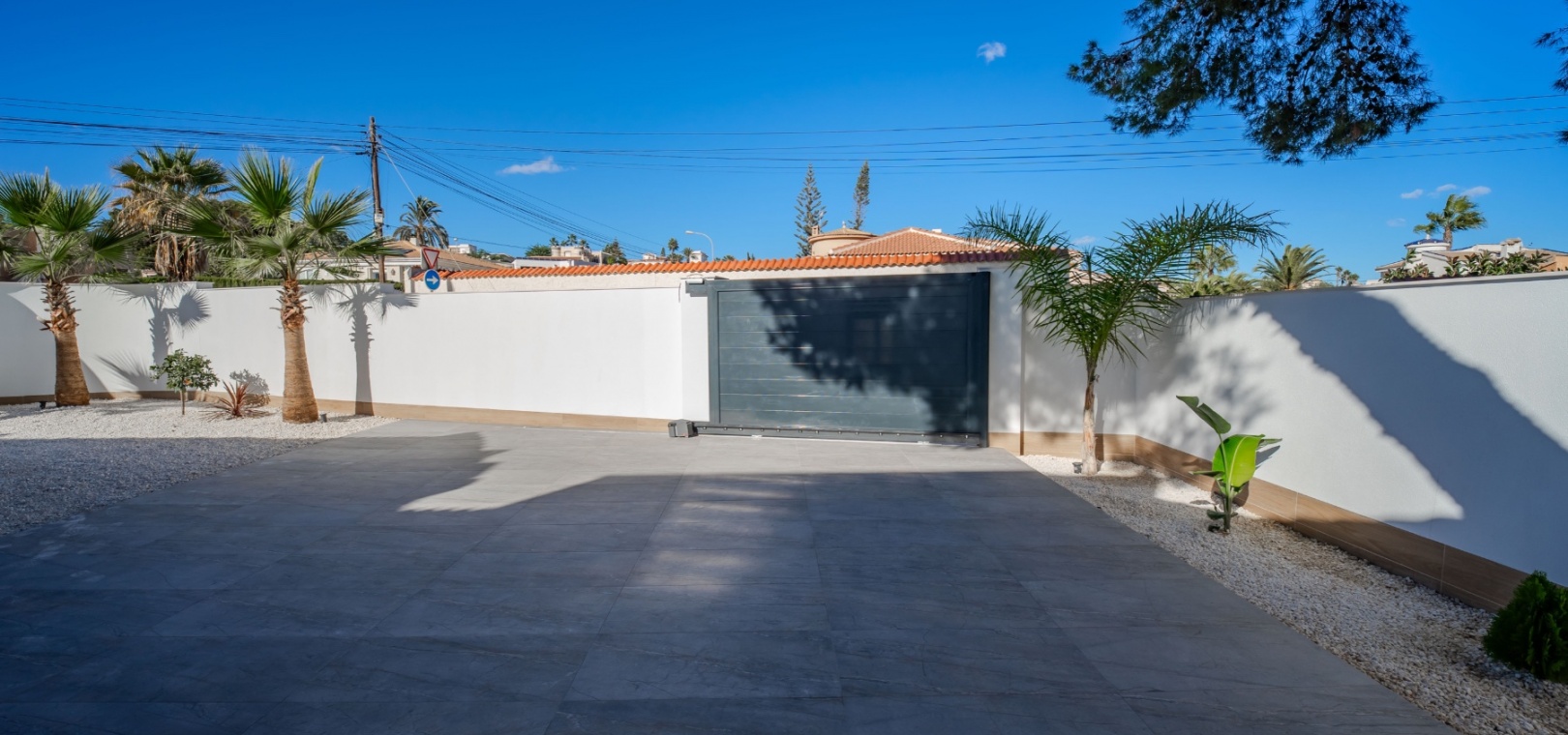 Atemberaubende, komplett sanierte Bungalowvilla in Ciudad Quesada (Alicante) – Die perfekte Verbindung von modernem Luxus und mediterraner Eleganz. In der begehrten Gegend von Ciudad Quesada (Alicante) und nur wenige Schritte vom lebhaften Stadtzentrum entfernt, wurde diese exquisite Bungalowvilla mit außergewöhnlicher Liebe zum Detail komplett saniert. Traditioneller mediterraner Charme trifft auf ein modernes, elegantes Design. Das Anwesen bietet Luxus, Komfort und Privatsphäre in einer der begehrtesten Lagen der Costa Blanca. Auf einem 650 m² großen Privatgrundstück gelegen, bietet die Villa 180 m² wunderschön gestaltete Wohnfläche und ist bezugsfertig. Die Ausstattung entspricht höchsten Standards – hier wurde an nichts gespart. Außenbereich: Hinter dem elektrischen Einfahrtstor erwartet Sie ein stilvoller, pflegeleichter mediterraner Garten, der das Haus perfekt einrahmt. Der private Swimmingpool grenzt an großzügige Terrassen, die zum Sonnenbaden, Essen oder für gesellige Stunden einladen. Das beeindruckende, große Solarium auf dem Dach bietet einen weiten Ausblick und einen exklusiven Bereich zum Entspannen, für Feiern oder um das milde Mikroklima von Alicante zu genießen. Raumaufteilung: Das Interieur besticht durch ein helles, offenes Raumkonzept mit viel Tageslicht. Vier bis fünf geräumige Schlafzimmer, alle als Suiten gestaltet, verfügen über vier luxuriöse Badezimmer en suite. Die Schlafzimmer sind mit Einbauschränken ausgestattet, die individuell nach den Wünschen der Kunden angepasst werden können. Die moderne offene Küche bietet hochwertige Geräte und beeindruckende Naturstein-Arbeitsplatten. Fußbodenheizung sorgt im gesamten Haus für angenehme Temperaturen. Klimaanlage (warm/kalt) ist in jedem Zimmer vorhanden. Die Kombination aus Raumaufteilung, Licht und edlen Materialien schafft ein komfortables und elegantes Wohnambiente. Weitere Merkmale: Ein fortschrittliches Smart-Home-System steuert Beleuchtung, Klima und Sicherheit. Separater Wasch- und Abstellraum. Hochwertige Ausstattung im gesamten Haus, darunter Designerleuchten, edle Fliesen und hochwertige Schreinerarbeiten. Bezugsfertiger Luxus, makellos renoviert. Lage: Nur wenige Minuten vom Stadtzentrum von Ciudad Quesada mit seinen Restaurants, Supermärkten, Dienstleistungen und Freizeiteinrichtungen entfernt, bietet diese Villa die ideale Balance zwischen Komfort, Privatsphäre und modernem mediterranem Wohnstil.