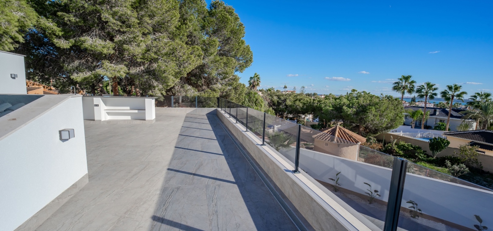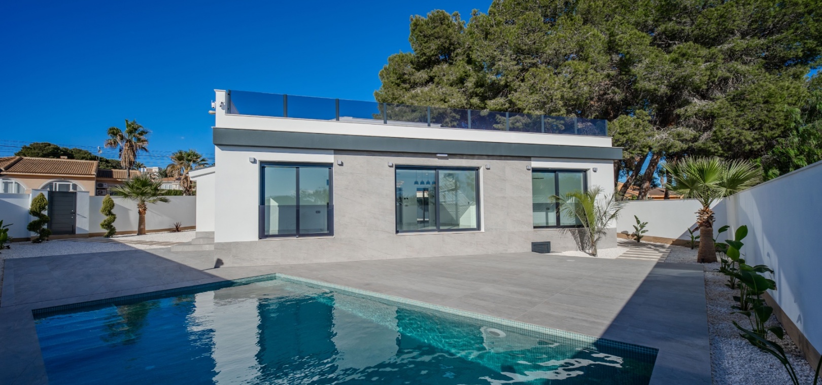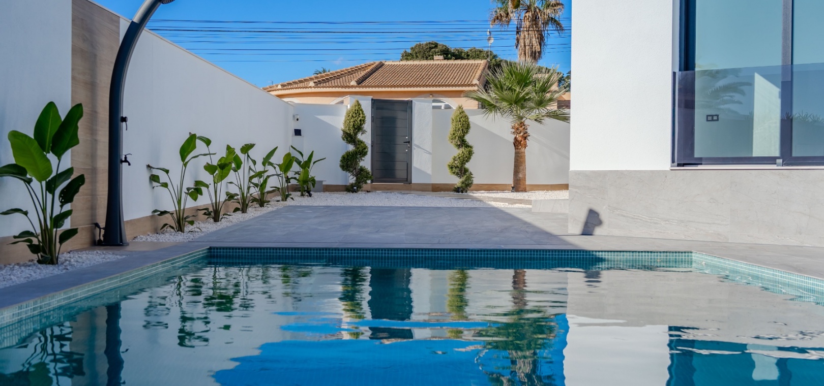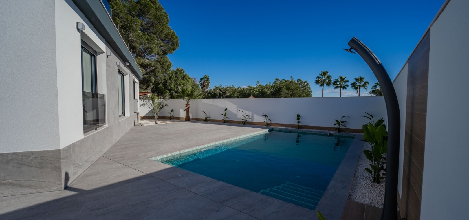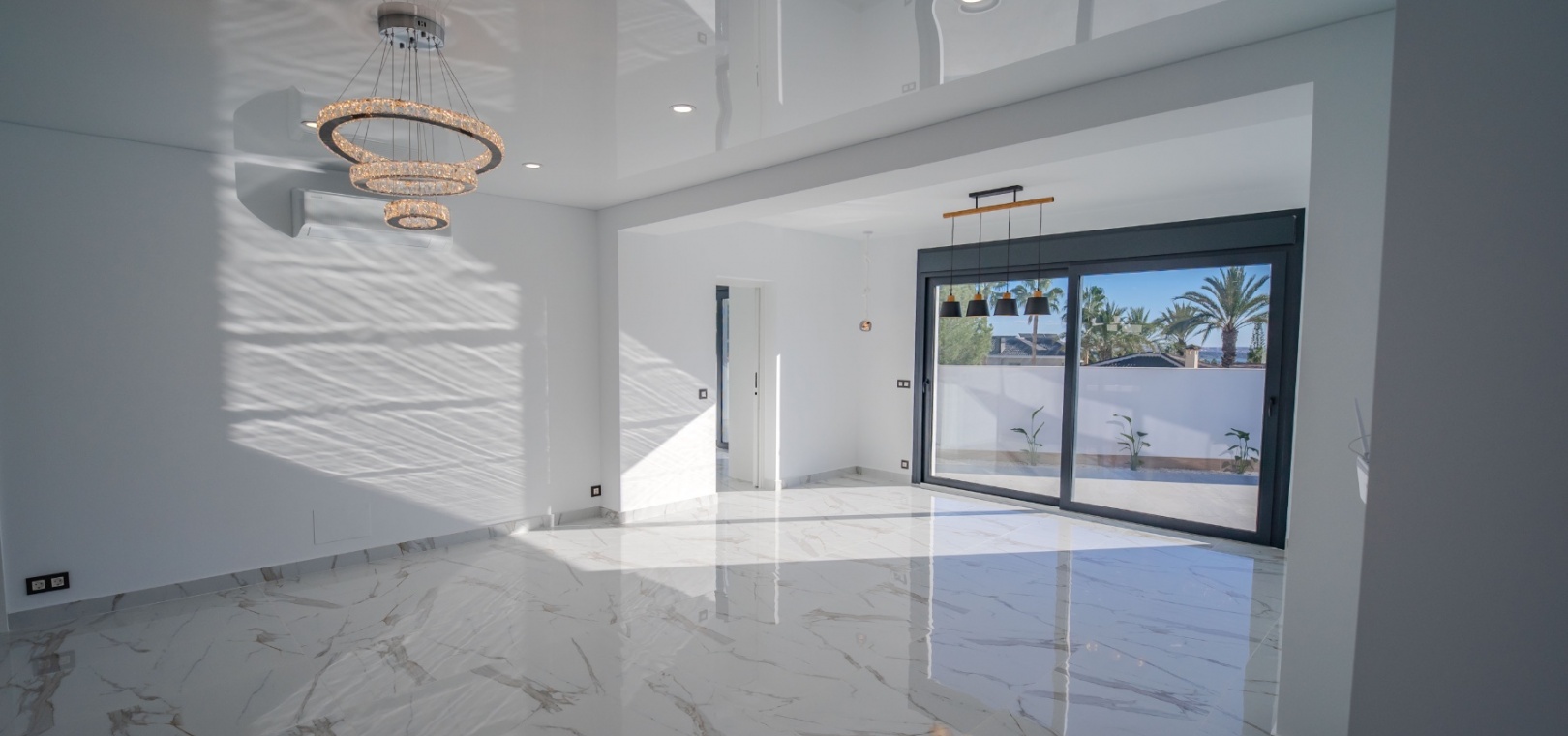 Atemberaubende, komplett sanierte Bungalowvilla in Ciudad Quesada (Alicante) – Die perfekte Verbindung von modernem Luxus und mediterraner Eleganz. In der begehrten Gegend von Ciudad Quesada (Alicante) und nur wenige Schritte vom lebhaften Stadtzentrum entfernt, wurde diese exquisite Bungalowvilla mit außergewöhnlicher Liebe zum Detail komplett saniert. Traditioneller mediterraner Charme trifft auf ein modernes, elegantes Design. Das Anwesen bietet Luxus, Komfort und Privatsphäre in einer der begehrtesten Lagen der Costa Blanca. Auf einem 650 m² großen Privatgrundstück gelegen, bietet die Villa 180 m² wunderschön gestaltete Wohnfläche und ist bezugsfertig. Die Ausstattung entspricht höchsten Standards – hier wurde an nichts gespart. Außenbereich: Hinter dem elektrischen Einfahrtstor erwartet Sie ein stilvoller, pflegeleichter mediterraner Garten, der das Haus perfekt einrahmt. Der private Swimmingpool grenzt an großzügige Terrassen, die zum Sonnenbaden, Essen oder für gesellige Stunden einladen. Das beeindruckende, große Solarium auf dem Dach bietet einen weiten Ausblick und einen exklusiven Bereich zum Entspannen, für Feiern oder um das milde Mikroklima von Alicante zu genießen. Raumaufteilung: Das Interieur besticht durch ein helles, offenes Raumkonzept mit viel Tageslicht. Vier bis fünf geräumige Schlafzimmer, alle als Suiten gestaltet, verfügen über vier luxuriöse Badezimmer en suite. Die Schlafzimmer sind mit Einbauschränken ausgestattet, die individuell nach den Wünschen der Kunden angepasst werden können. Die moderne offene Küche bietet hochwertige Geräte und beeindruckende Naturstein-Arbeitsplatten. Fußbodenheizung sorgt im gesamten Haus für angenehme Temperaturen. Klimaanlage (warm/kalt) ist in jedem Zimmer vorhanden. Die Kombination aus Raumaufteilung, Licht und edlen Materialien schafft ein komfortables und elegantes Wohnambiente. Weitere Merkmale: Ein fortschrittliches Smart-Home-System steuert Beleuchtung, Klima und Sicherheit. Separater Wasch- und Abstellraum. Hochwertige Ausstattung im gesamten Haus, darunter Designerleuchten, edle Fliesen und hochwertige Schreinerarbeiten. Bezugsfertiger Luxus, makellos renoviert. Lage: Nur wenige Minuten vom Stadtzentrum von Ciudad Quesada mit seinen Restaurants, Supermärkten, Dienstleistungen und Freizeiteinrichtungen entfernt, bietet diese Villa die ideale Balance zwischen Komfort, Privatsphäre und modernem mediterranem Wohnstil.