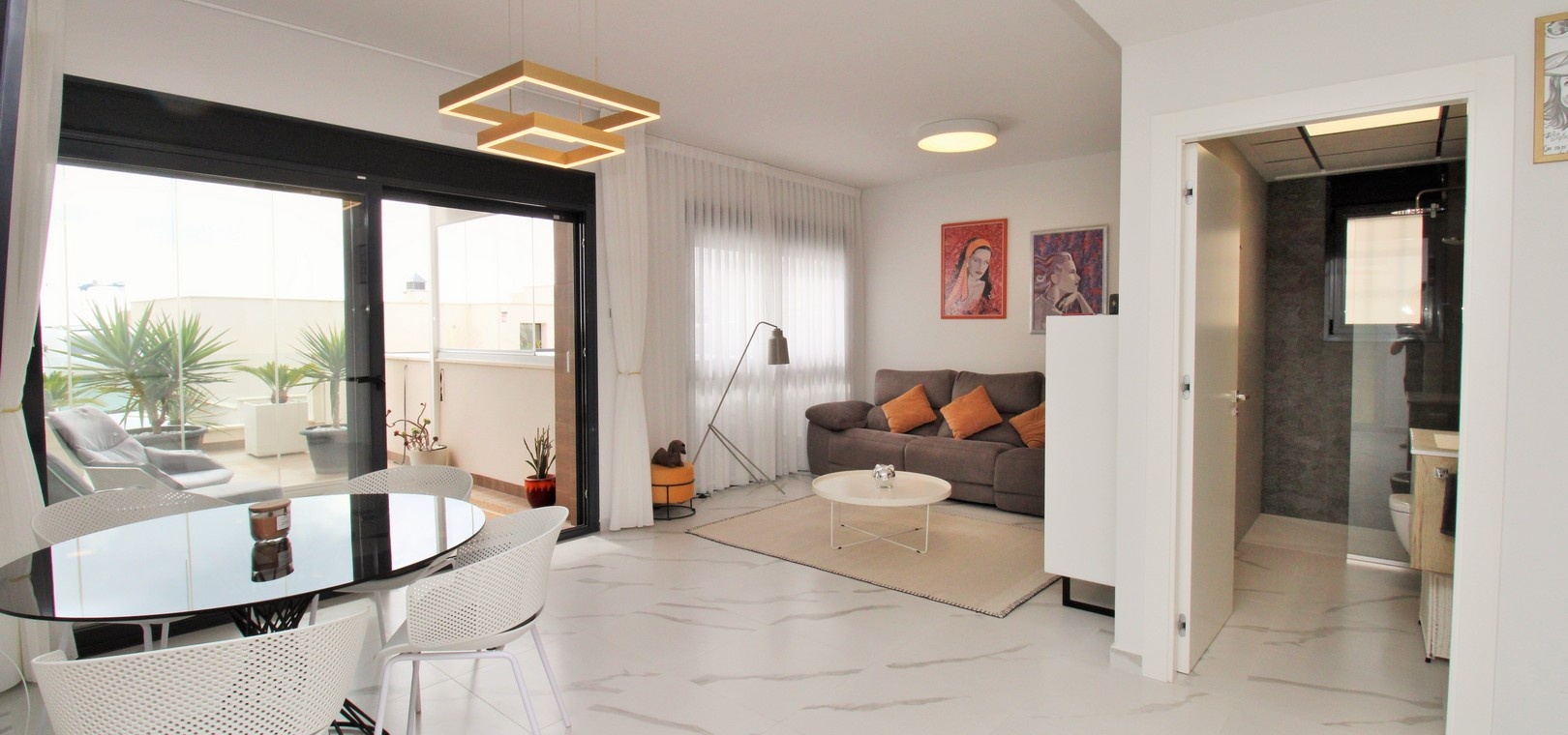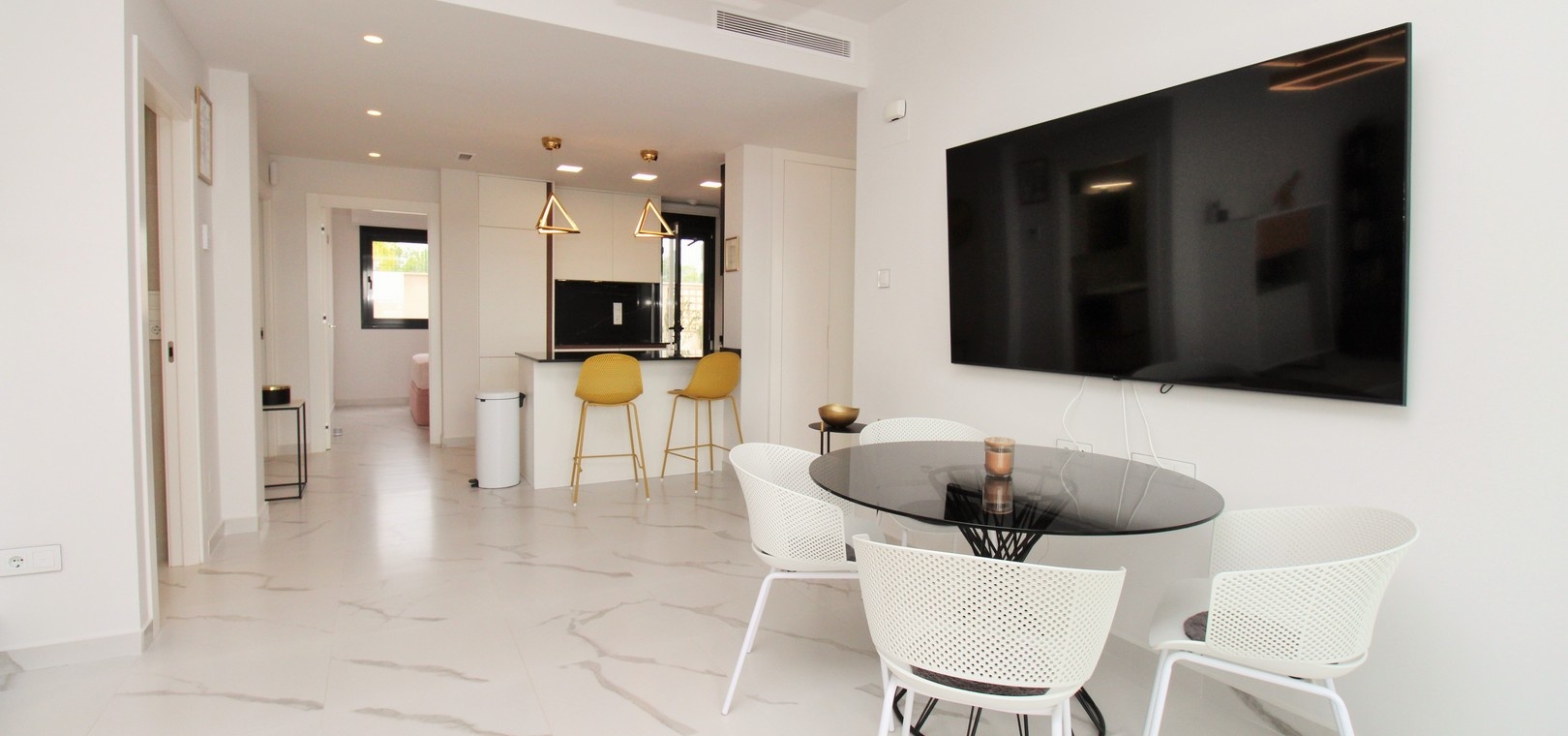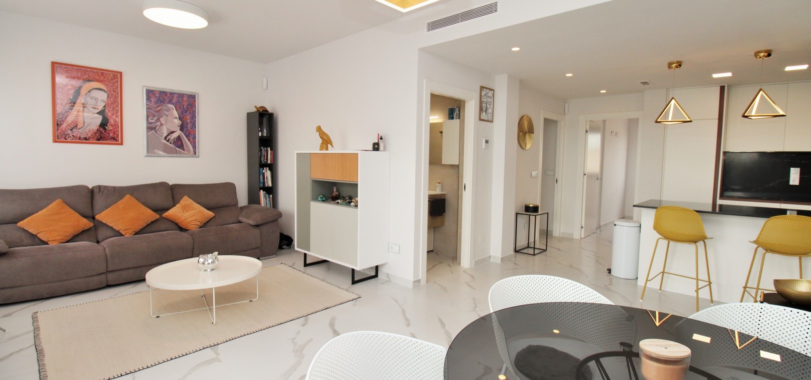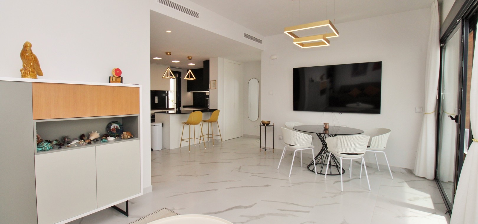 Die Wohnung bietet einen hellen, großzügigen Wohn-Essbereich mit offenem Grundriss, Marmorböden, eine moderne Einbauküche und direkten Zugang zur sonnigen Terrasse — perfekt, um die Sonne der Costa Blanca zu genießen.