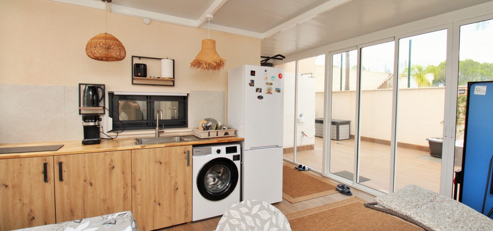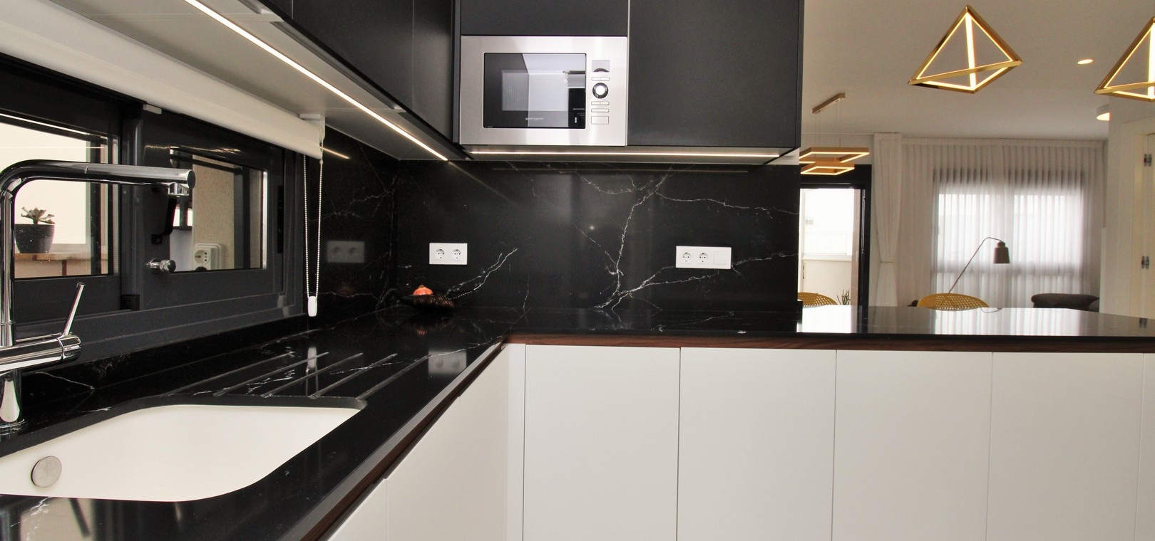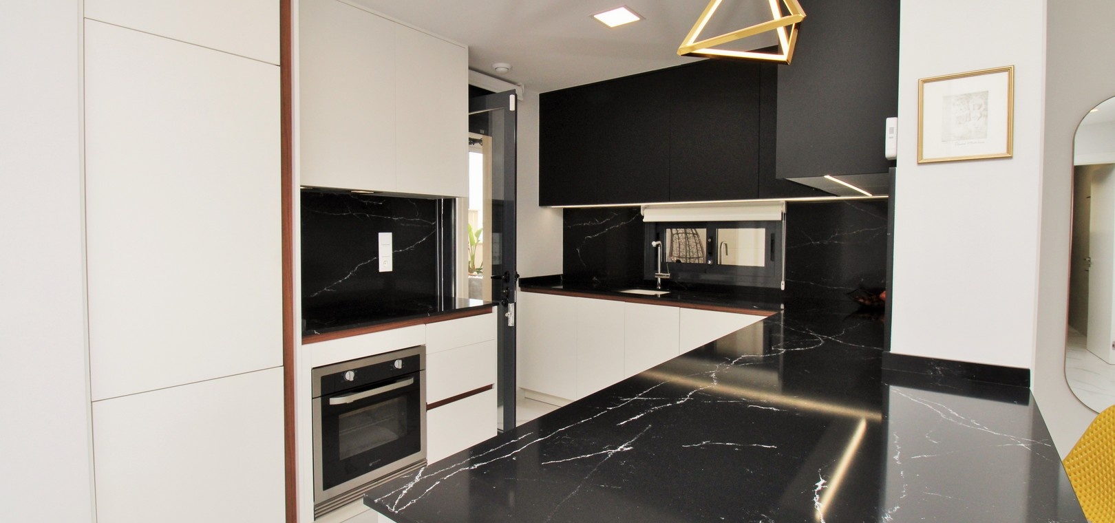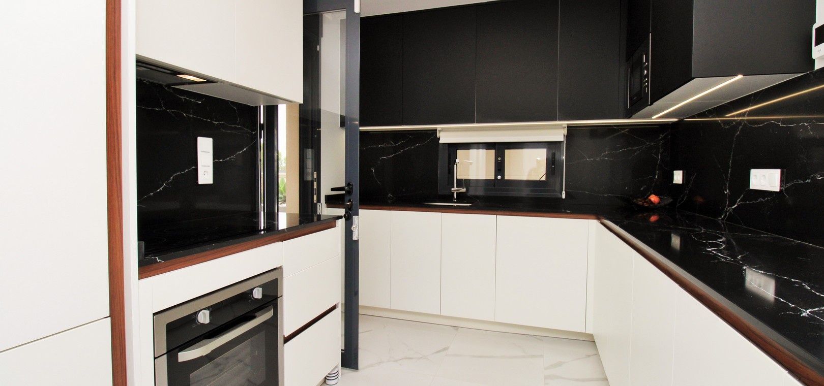 Die Wohnung bietet einen hellen, großzügigen Wohn-Essbereich mit offenem Grundriss, Marmorböden, eine moderne Einbauküche und direkten Zugang zur sonnigen Terrasse — perfekt, um die Sonne der Costa Blanca zu genießen.