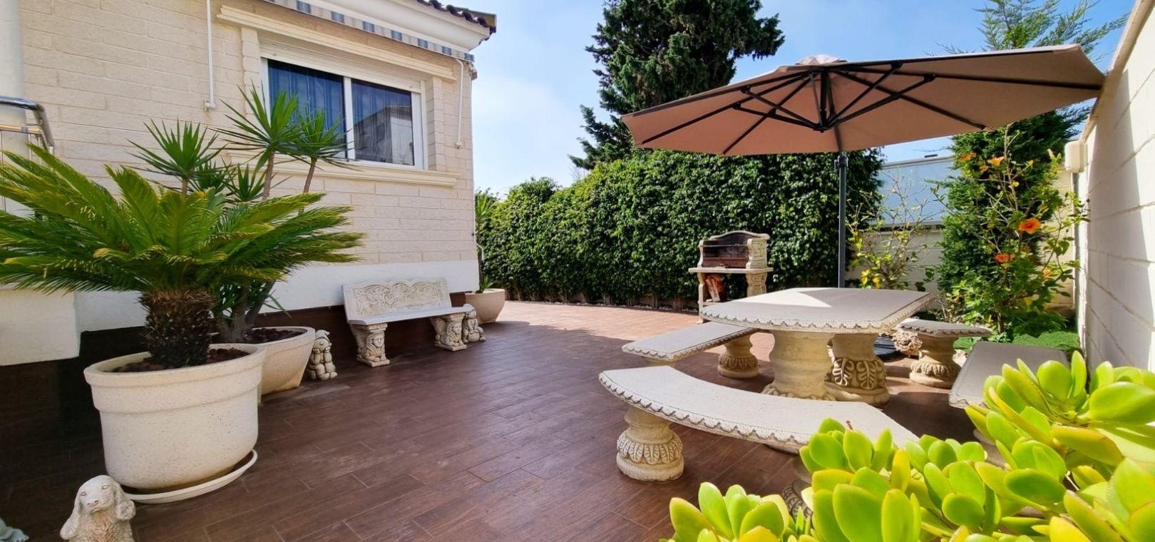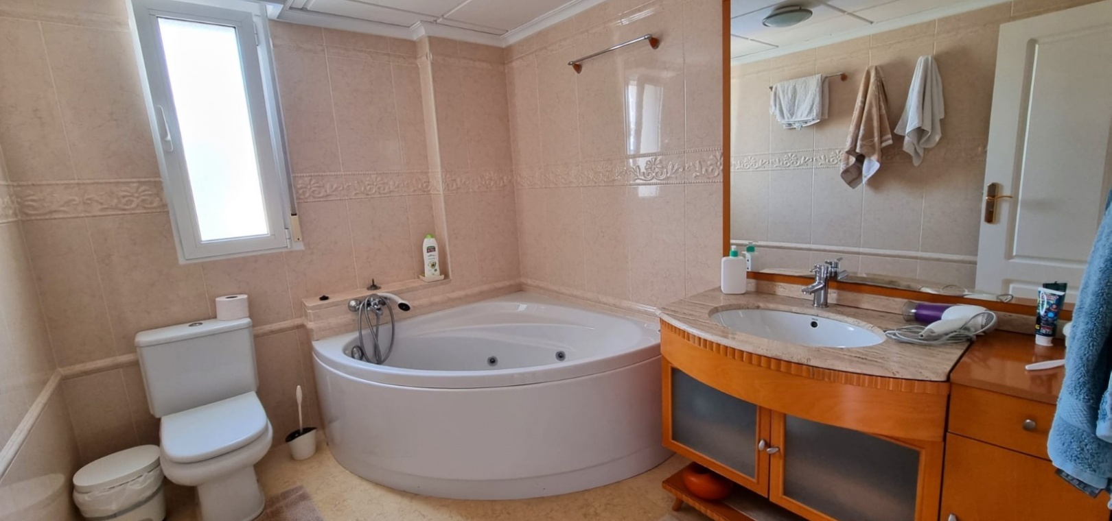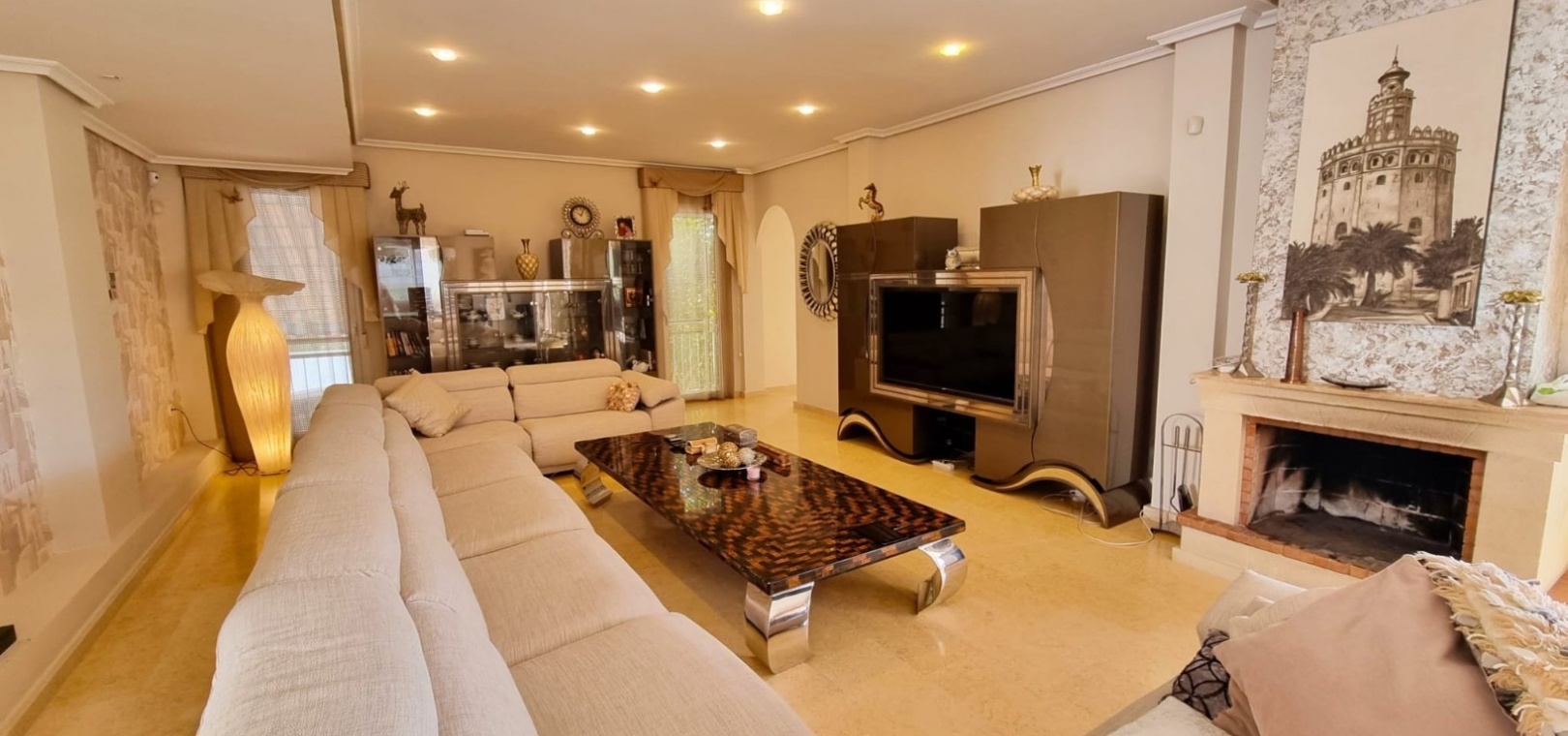 Diese außergewöhnliche Villa bietet die seltene Gelegenheit, ein geräumiges und elegantes Zuhause in einer der begehrtesten Lagen von Torrevieja zu erwerben. Das Anwesen erstreckt sich über drei Ebenen und besticht durch großzügige Wohnbereiche, Panoramablick und luxuriöse Annehmlichkeiten für Komfort und Entspannung. Grundriss: Hauptgeschoss: Diese Etage umfasst drei Schlafzimmer, zwei Badezimmer, ein Gäste-WC und ein Duschbad. Ein helles und luftiges Wohnzimmer sowie eine voll ausgestattete Küche vervollständigen den Raum. Sowohl der Wohnbereich als auch eines der Schlafzimmer öffnen sich direkt zu einer großen Terrasse – ideal, um die Natur zu genießen. Obergeschoss: Hier befinden sich zwei weitere Schlafzimmer, ein zusätzliches Badezimmer und ein charmanter Balkon mit atemberaubendem Blick auf das Mittelmeer und die Umgebung. Untergeschoss: Im Untergeschoss befinden sich ein geräumiger Gemeinschaftsraum, ein begehbarer Kleiderschrank (der in ein zusätzliches Schlafzimmer umgewandelt werden kann), ein Hauswirtschaftsraum und ein luxuriöser privater Wellnessbereich. Dieser umfasst eine finnische Sauna, ein türkisches Dampfbad und moderne Duschmöglichkeiten. Außenbereich: Auf einem großzügigen Grundstück gelegen, bietet die Villa vielfältige Möglichkeiten zur Entspannung und Unterhaltung im Freien. Ausstattung: Privater Swimmingpool mit sonniger Liegefläche, ausreichend Parkplätze für mehrere Fahrzeuge, Zugang zu einem Gemeinschaftsgarten und Tennisplatz innerhalb der Wohnanlage. Erstklassige Lage: Die Villa befindet sich in einem lebendigen und gut angebundenen Viertel und ist umgeben von einer großen Auswahl an Restaurants, Bars, Geschäften und Einrichtungen des täglichen Bedarfs. Der berühmte Strand La Mata mit seinem goldenen Sand und einladenden Strandbars, wo Sie das mediterrane Lebensgefühl in vollen Zügen genießen können, ist nur wenige Schritte entfernt. Lifestyle & Freizeit: Torrevieja ist eine lebhafte Küstenstadt mit ganzjährigem Unterhaltungs- und Freizeitangebot für alle Altersgruppen, darunter: Go-Kart, Bowling, Kinos und Einkaufszentren, mehrere erstklassige Golfplätze in der Umgebung, eine vielfältige Gastronomieszene mit exzellenten Restaurants und Bars, ein malerischer Hafen und ein dynamisches Stadtzentrum. Ihr Traumhaus erwartet Sie: Diese Villa bietet eine gelungene Kombination aus Raum, Stil und erstklassiger Lage und ist die perfekte Wahl für einen dauerhaften Wohnsitz oder einen luxuriösen Urlaub im Herzen von Torrevieja.