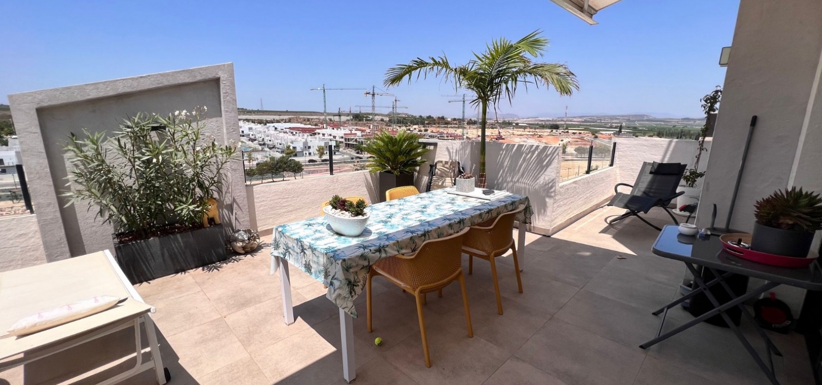 Das Anwesen bietet eine Wohnfläche von 70 m², aufgeteilt in zwei Schlafzimmer mit Einbauschränken, ein Badezimmer und eine Toilette, eine voll ausgestattete offene Küche und ein helles Wohnzimmer mit Zugang zu einer privaten Terrasse, ideal, um das schöne Wetter zu genießen. Sein größter Vorteil ist der großzügige Außenbereich: eine 58 m² große Terrasse, die an das Wohnzimmer angrenzt und auf ein 53 m² großes privates Solarium blickt! Mit spektakulärem Panoramablick auf die Umgebung!