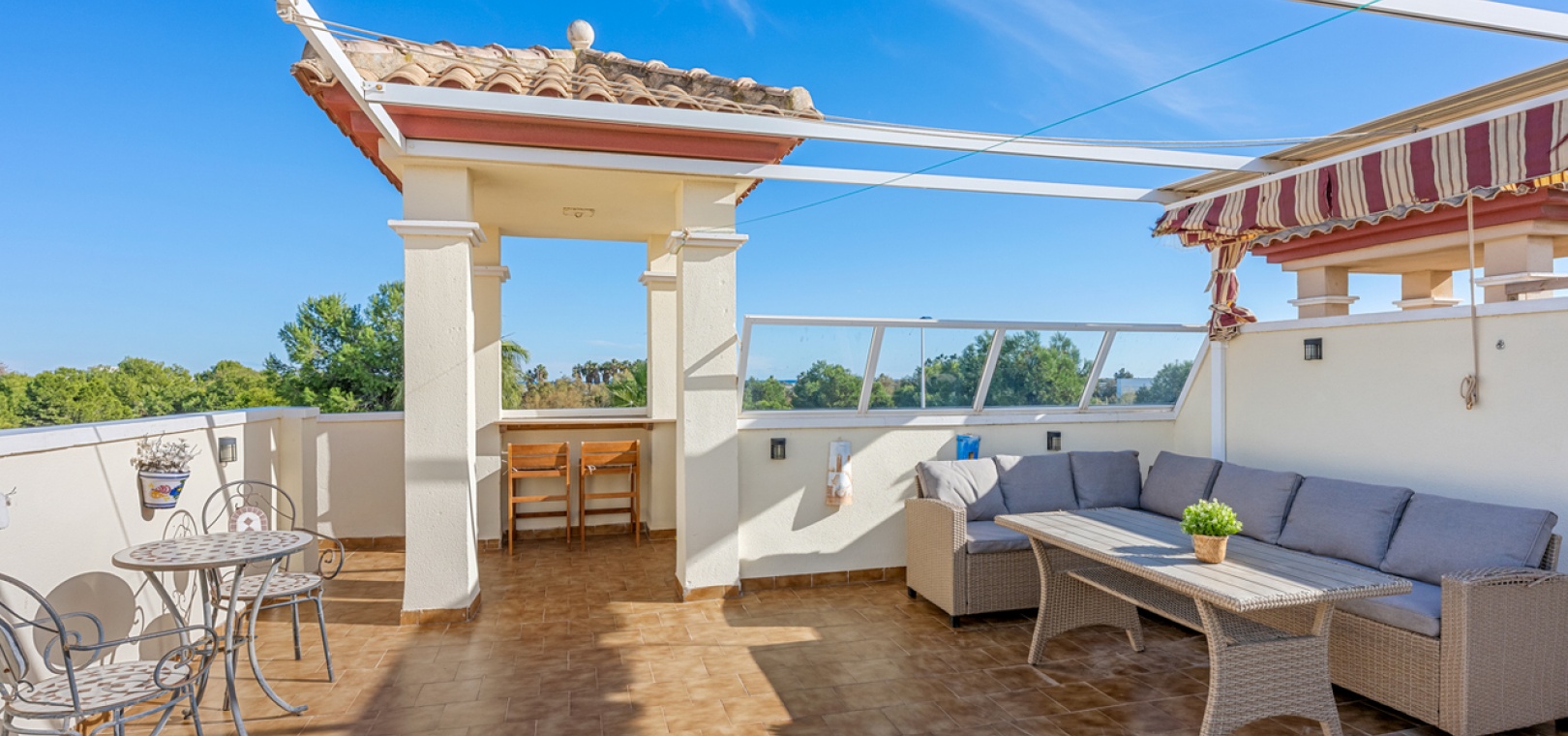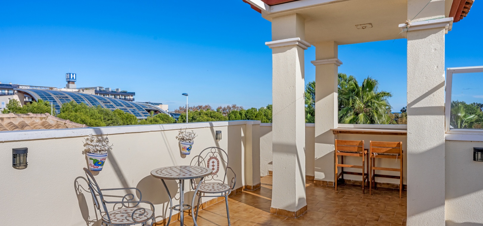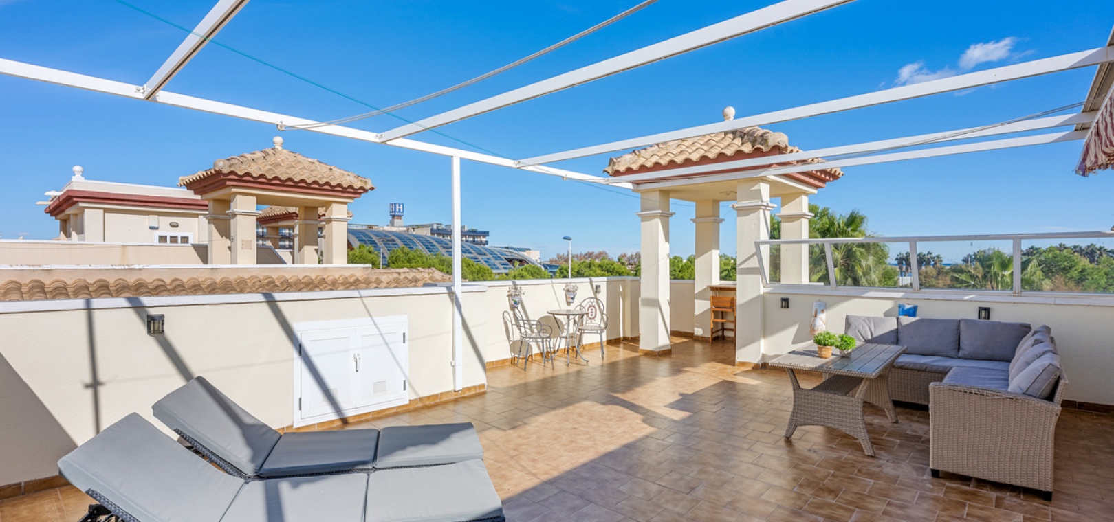 Die Wohnung wird teilmöbliert verkauft und verfügt über einen großzügigen Wohn- und Essbereich , eine separate, voll ausgestattete moderne Küche mit Hauswirtschaftsraum , drei Schlafzimmer und ein stilvolles Familienbad . Eine 7 m² große Terrasse bietet Blick auf den Park, während die private Dachterrasse/das Solarium (54 m²) ganztägig Sonne und Meerblick bietet – ideal zum Entspannen, für gesellige Stunden oder zum Essen im Freien.