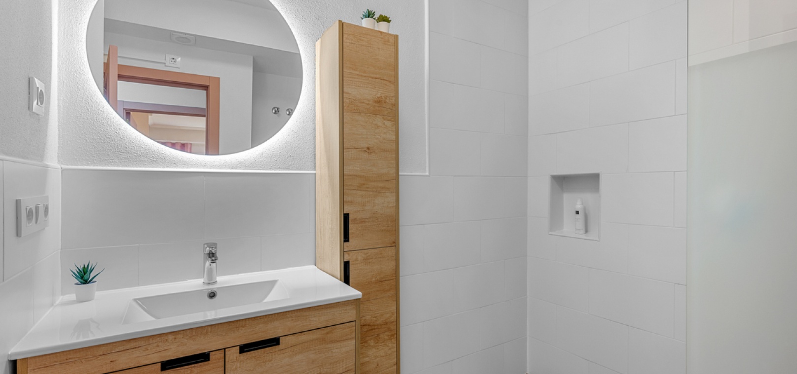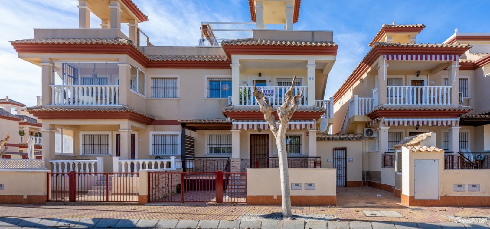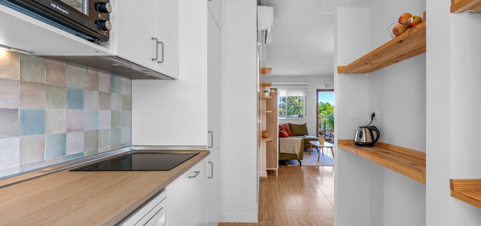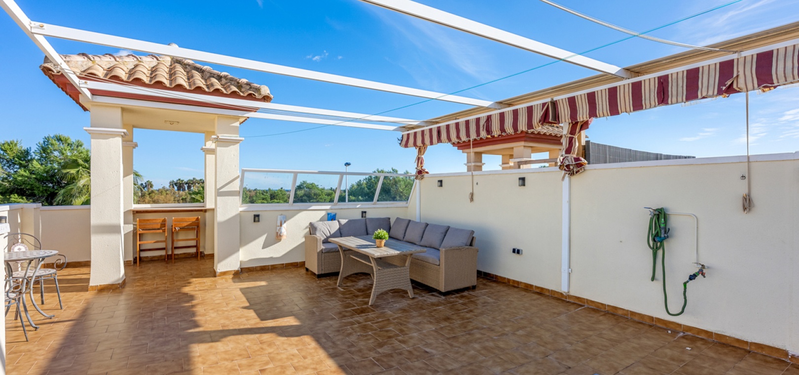 Die Wohnung wird teilmöbliert verkauft und verfügt über einen großzügigen Wohn- und Essbereich , eine separate, voll ausgestattete moderne Küche mit Hauswirtschaftsraum , drei Schlafzimmer und ein stilvolles Familienbad . Eine 7 m² große Terrasse bietet Blick auf den Park, während die private Dachterrasse/das Solarium (54 m²) ganztägig Sonne und Meerblick bietet – ideal zum Entspannen, für gesellige Stunden oder zum Essen im Freien.