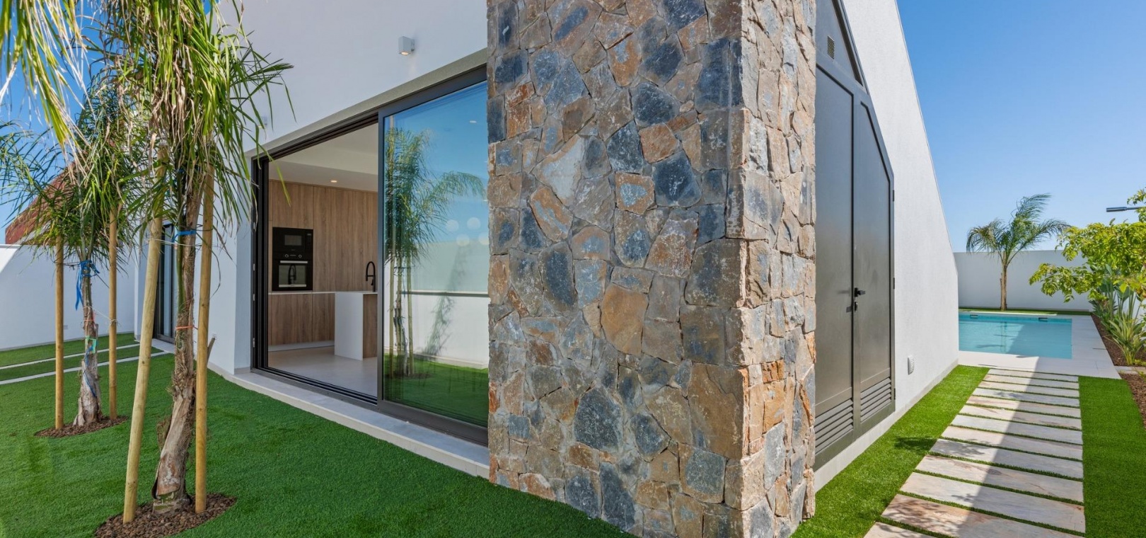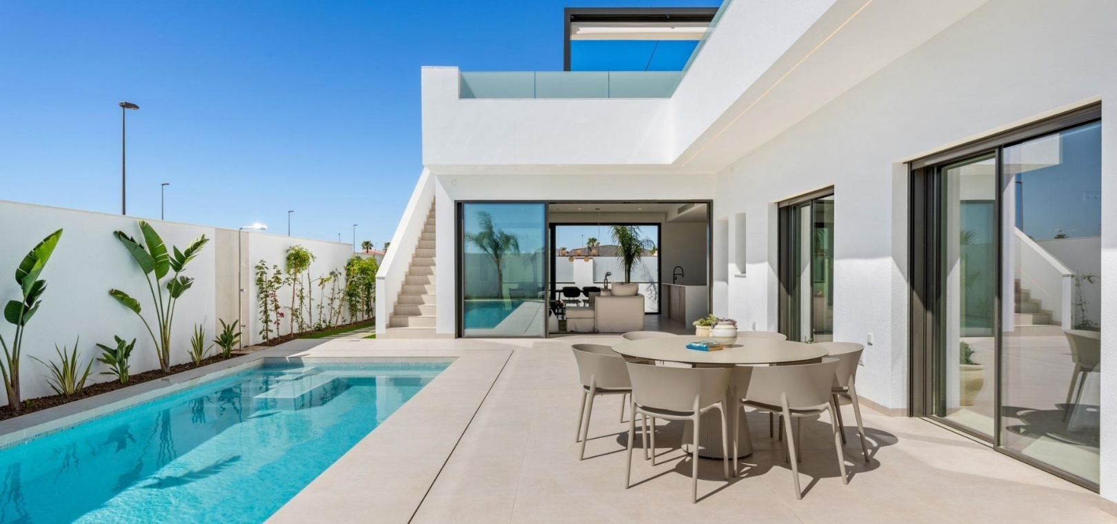 Jede Villa verfügt über einen privaten Swimmingpool mit blauen Keramikfliesen, integrierten Stufen und weißer LED-Beleuchtung. Der Pool ist für die Installation einer Wärmepumpe vorbereitet. Die Kombination aus effizienter Klimatisierung, moderner Bauweise und durchdachtem Design sorgt das ganze Jahr über für Komfort.