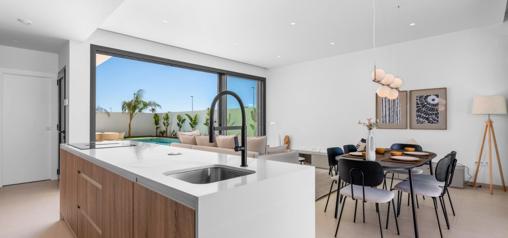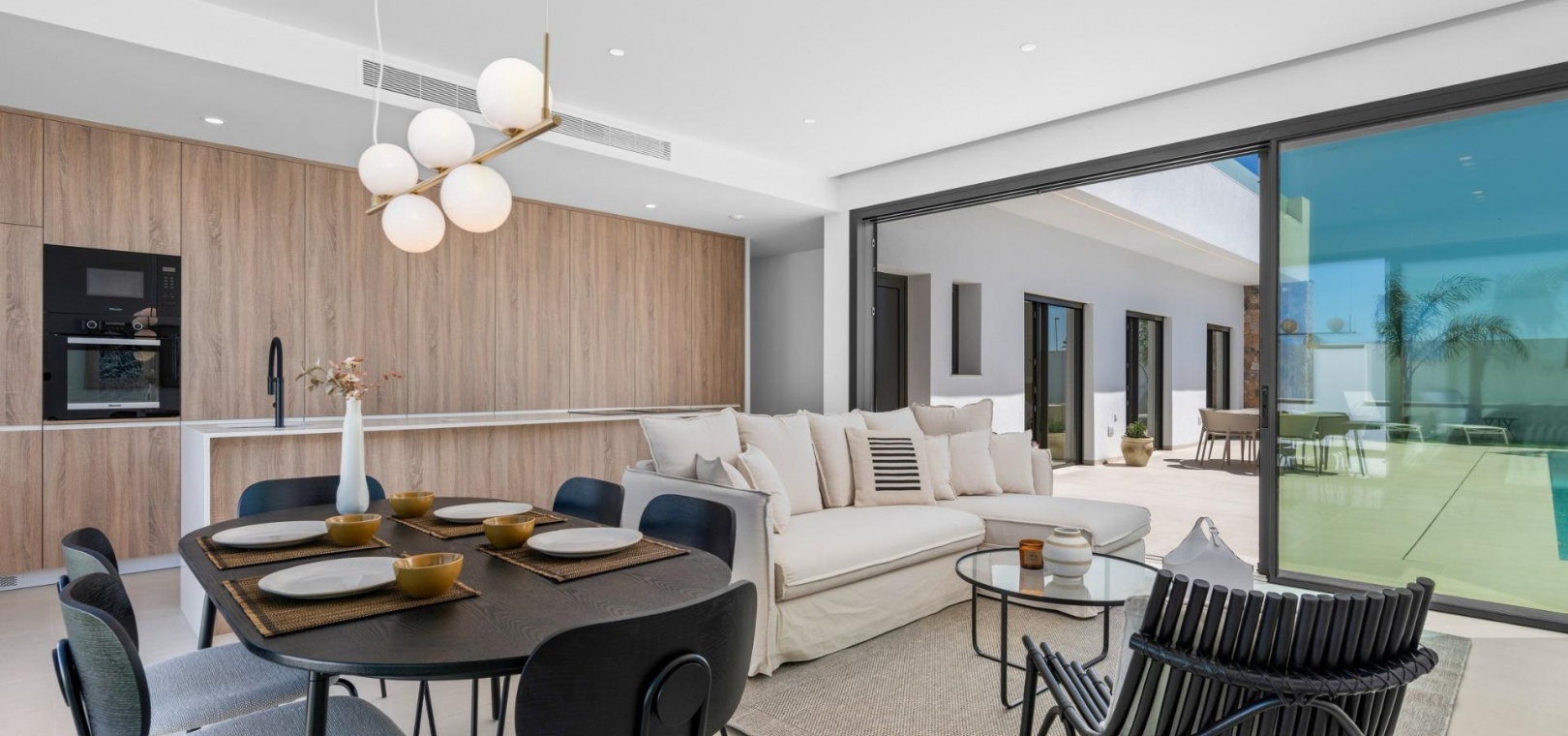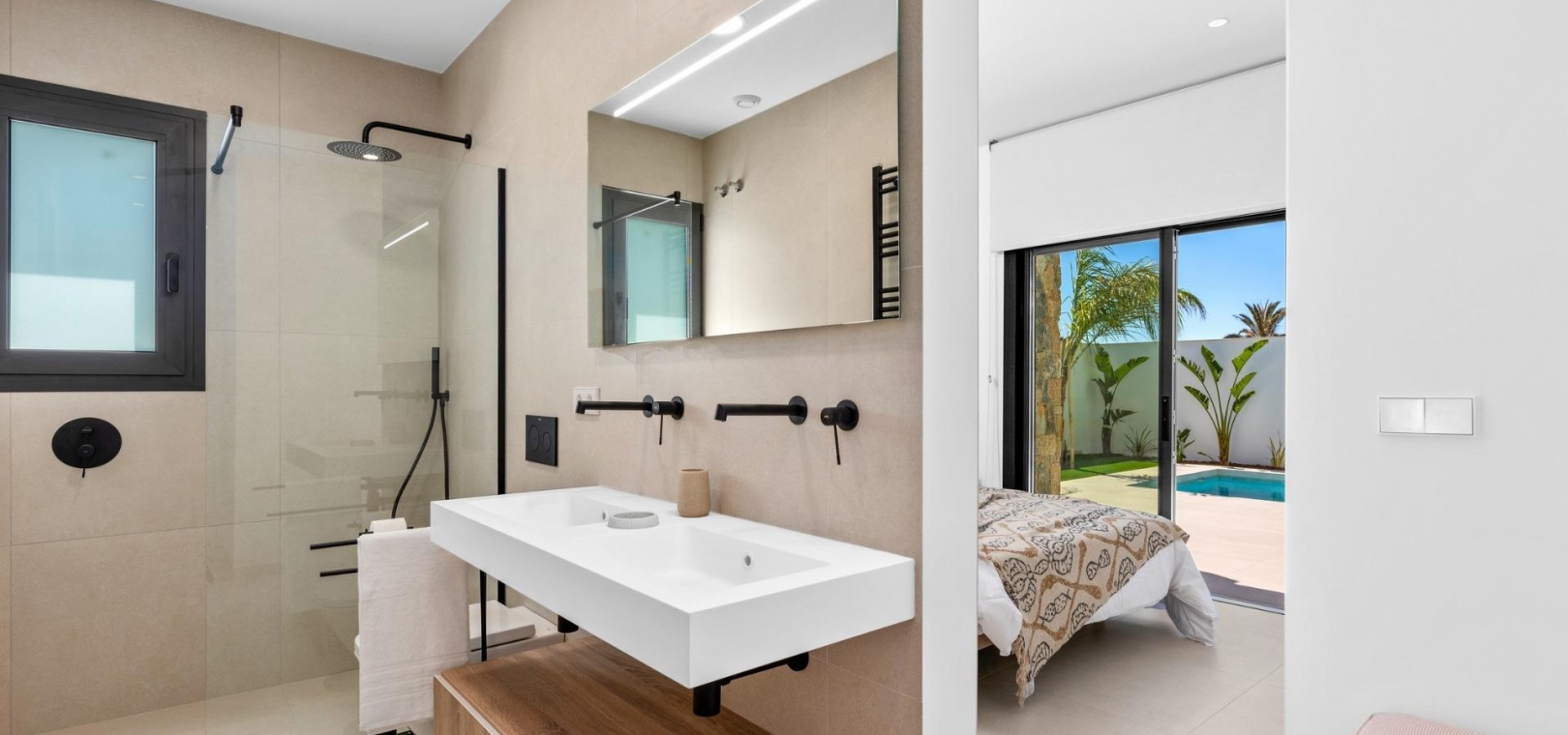 Diese Villen sind mit hochwertigen Materialien gebaut und mit modernen Ausstattungsmerkmalen versehen. Die voll ausgestatteten Küchen sind in weißer Hochglanz- oder Holzoptik erhältlich und verfügen über Quarz-Arbeitsplatten, Edelstahlspüle, Induktionskochfeld mit integriertem Dunstabzug, Backofen, Mikrowelle, Waschmaschine, integrierten Kühlschrank und Geschirrspüler. Die Badezimmer sind mit Möbeln, Spiegeln, Beleuchtung und elektrischen Handtuchwärmern ausgestattet. Zu den weiteren Ausstattungsmerkmalen gehören elektrische Jalousien in den Schlafzimmern, LED-Beleuchtung im gesamten Objekt und eine komplette Klimaanlage von Fujitsu.