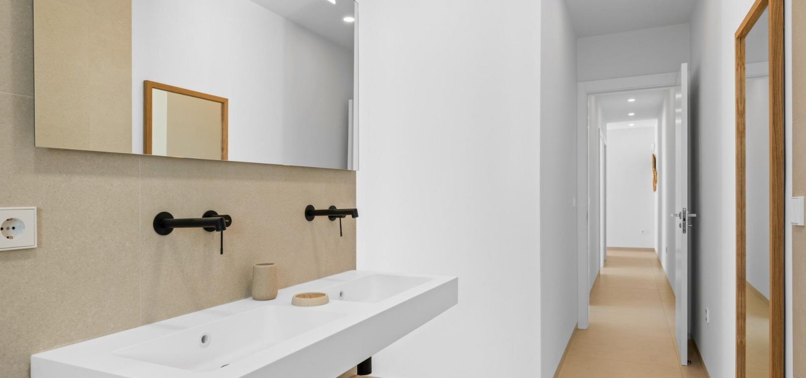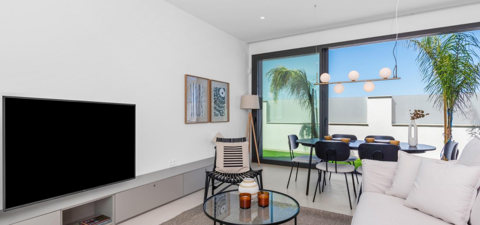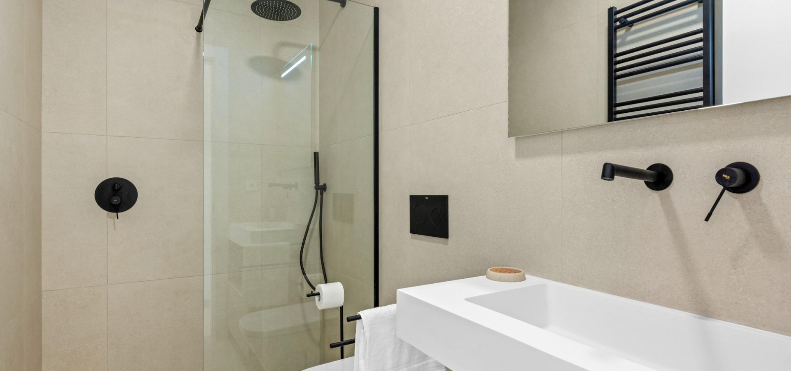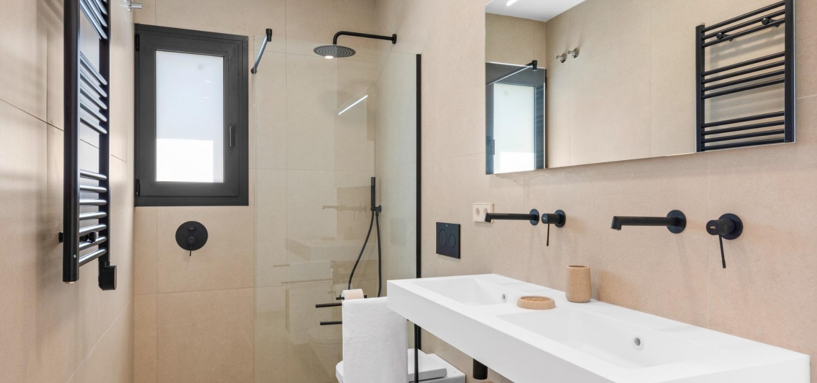 Diese Villen sind mit hochwertigen Materialien gebaut und mit modernen Ausstattungsmerkmalen versehen. Die voll ausgestatteten Küchen sind in weißer Hochglanz- oder Holzoptik erhältlich und verfügen über Quarz-Arbeitsplatten, Edelstahlspüle, Induktionskochfeld mit integriertem Dunstabzug, Backofen, Mikrowelle, Waschmaschine, integrierten Kühlschrank und Geschirrspüler. Die Badezimmer sind mit Möbeln, Spiegeln, Beleuchtung und elektrischen Handtuchwärmern ausgestattet. Zu den weiteren Ausstattungsmerkmalen gehören elektrische Jalousien in den Schlafzimmern, LED-Beleuchtung im gesamten Objekt und eine komplette Klimaanlage von Fujitsu.