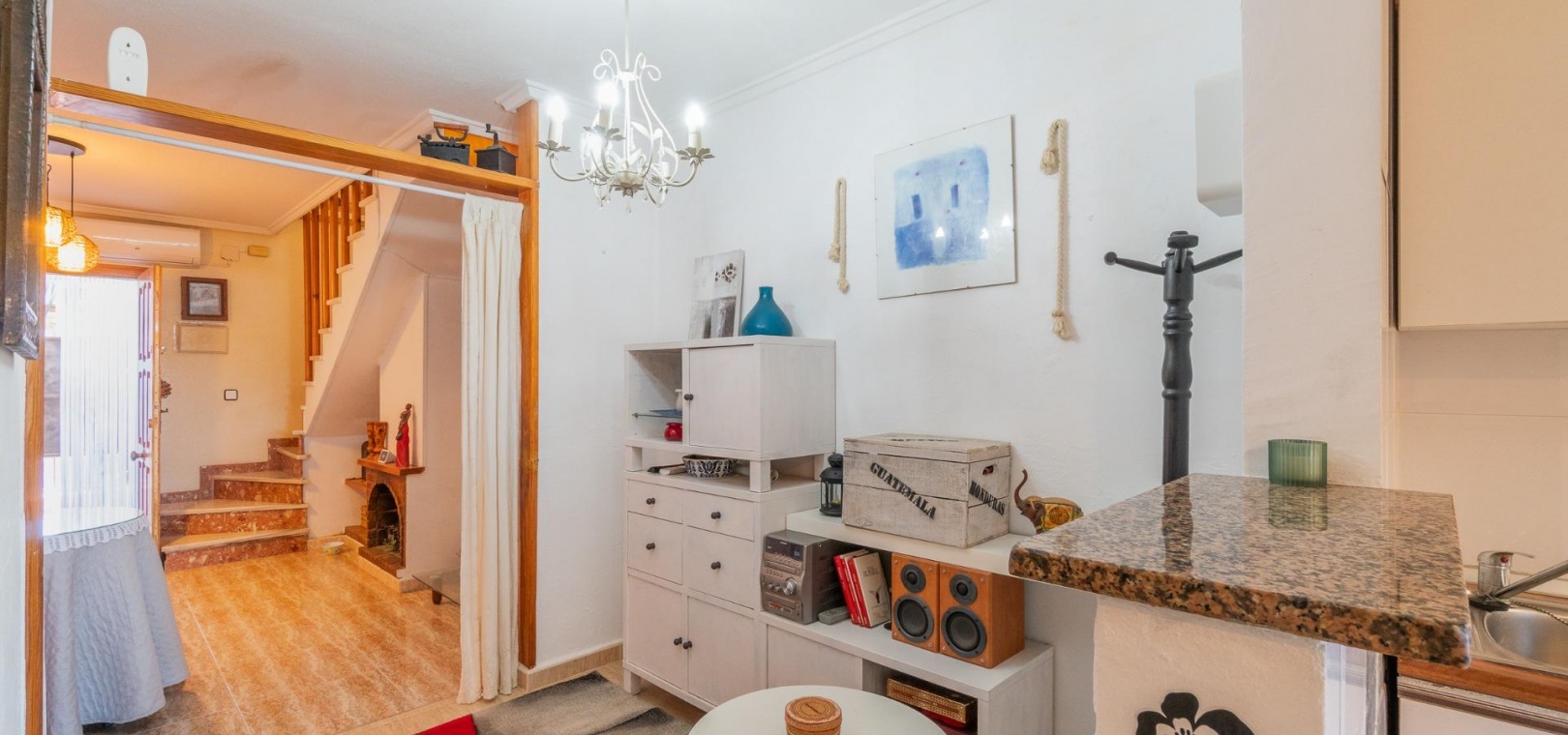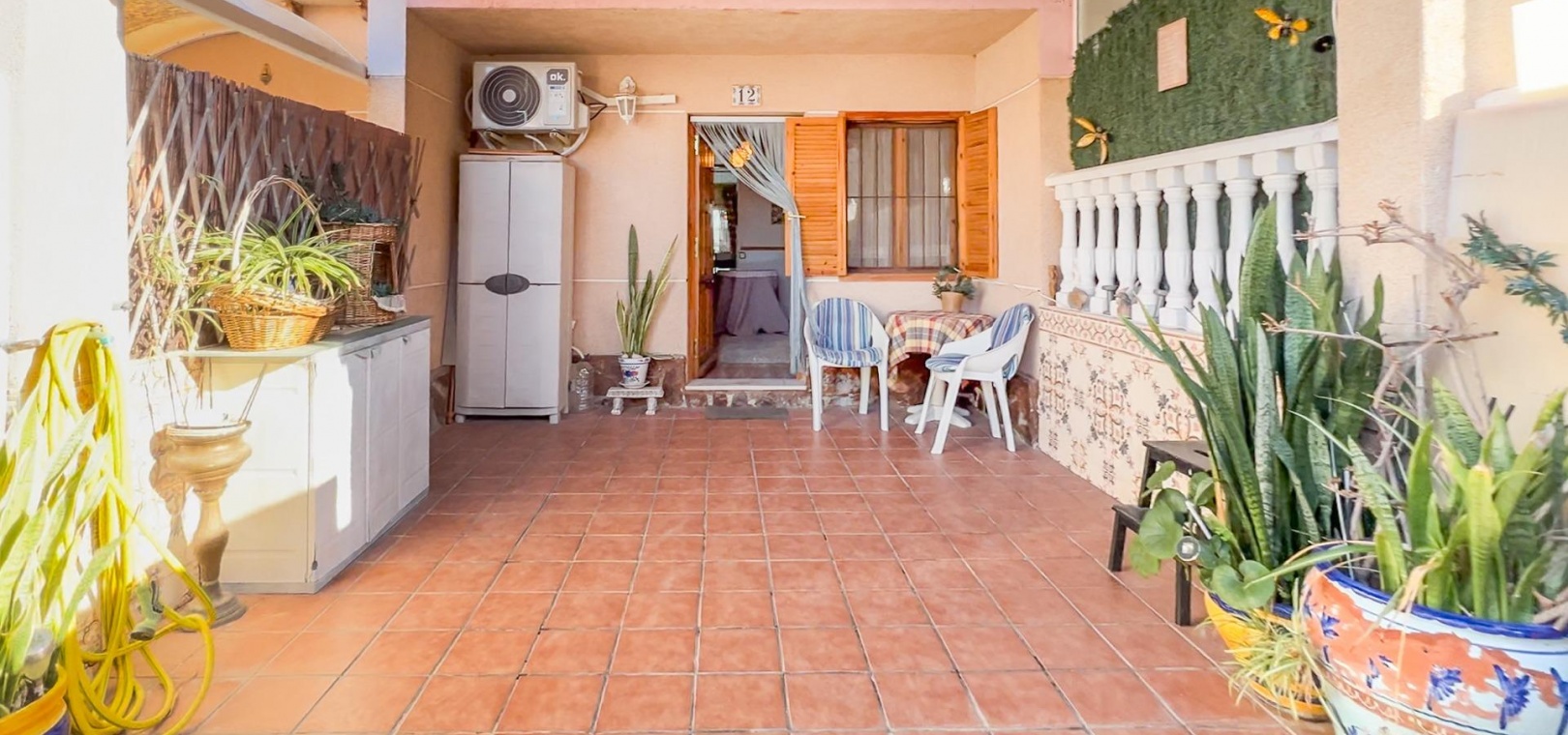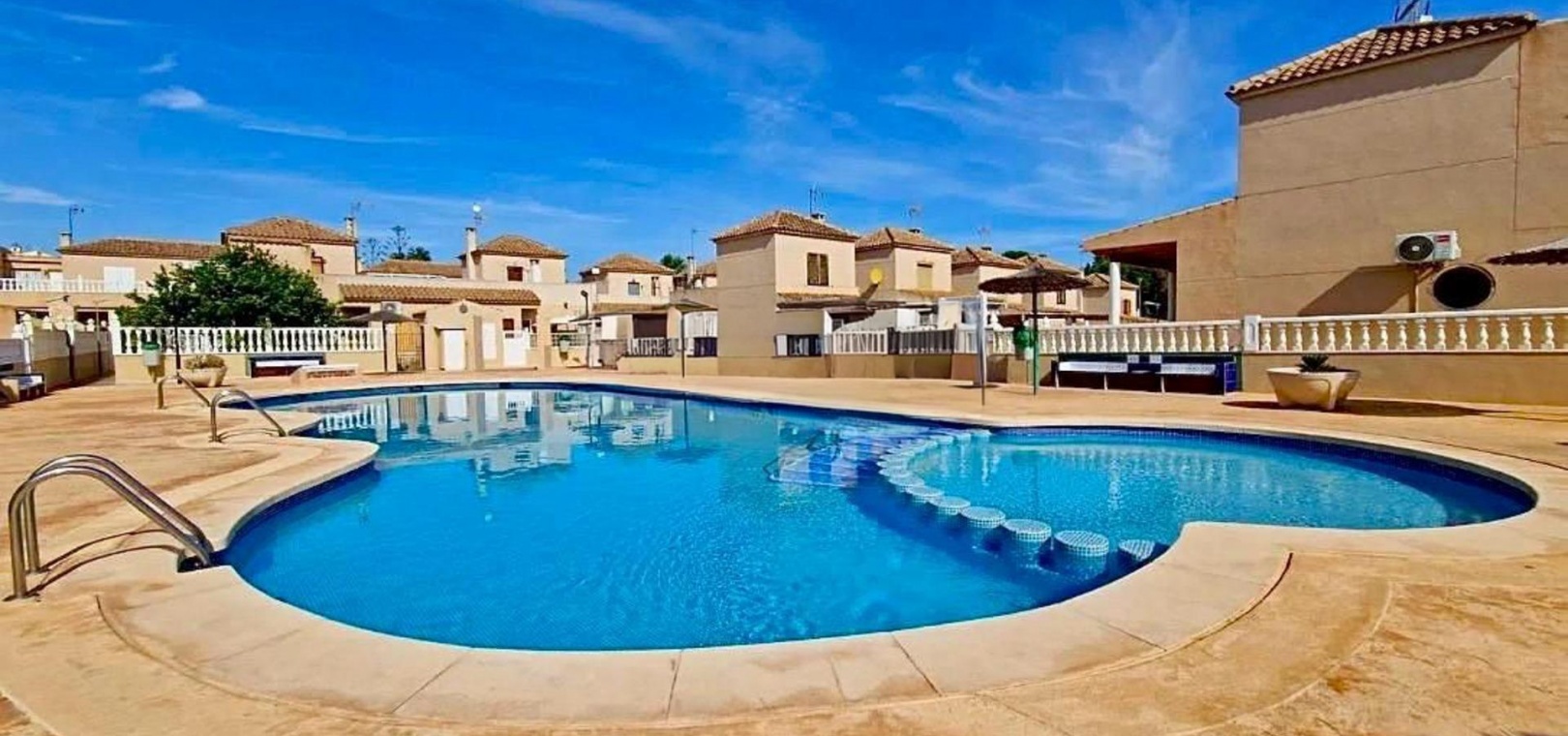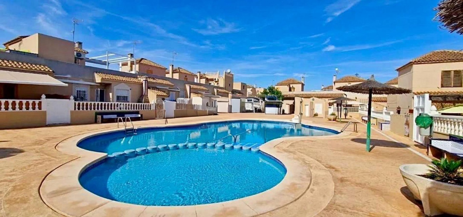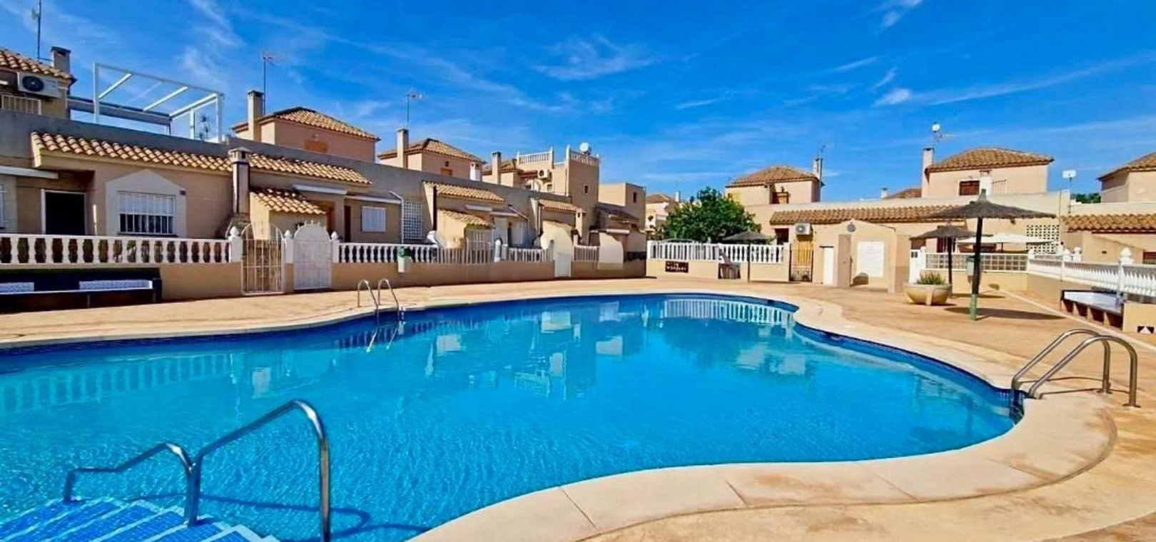 Entdecken Sie dieses charmante Reihenhaus in der begehrten Gegend Los Balcones in Torrevieja. Mit einer Wohnfläche von ca. 60 m2, inklusive der erweiterten Küche, bietet diese Immobilie dank ihrer Südausrichtung optimalen Komfort und sonnige, mediterrane Atmosphäre.~~Sie verfügt über eine großzügige, 30 m2 große private Terrasse, ideal zum Entspannen oder für unvergessliche Momente mit Freunden und Familie.~~Im Erdgeschoss befinden sich ein helles Wohn-Esszimmer, perfekt für gesellige Runden, eine funktionale Küche und ein Gäste-WC.~~Im ersten Stock befinden sich zwei Schlafzimmer, jeweils mit Zugang zu einer eigenen Terrasse, von der aus Sie den Blick auf die Natur genießen können.~~Zusätzlich steht Ihnen ein Gemeinschaftspool zur Verfügung, und Sie können Ihr Auto auf dem Grundstück parken.~~Die strategisch günstige Lage in der Nähe des Meeres (nur 1500 Meter entfernt) sowie wichtiger Einrichtungen wie Schulen, Krankenhäusern und Einkaufszentren bietet Ihnen Ruhe und Komfort zugleich.~~Es ist komplett möbliert und bezugsfertig: Bringen Sie einfach Ihre Koffer mit! Verpassen Sie nicht diese einmalige Gelegenheit, dieses charmante Küstenrefugium zu erwerben.