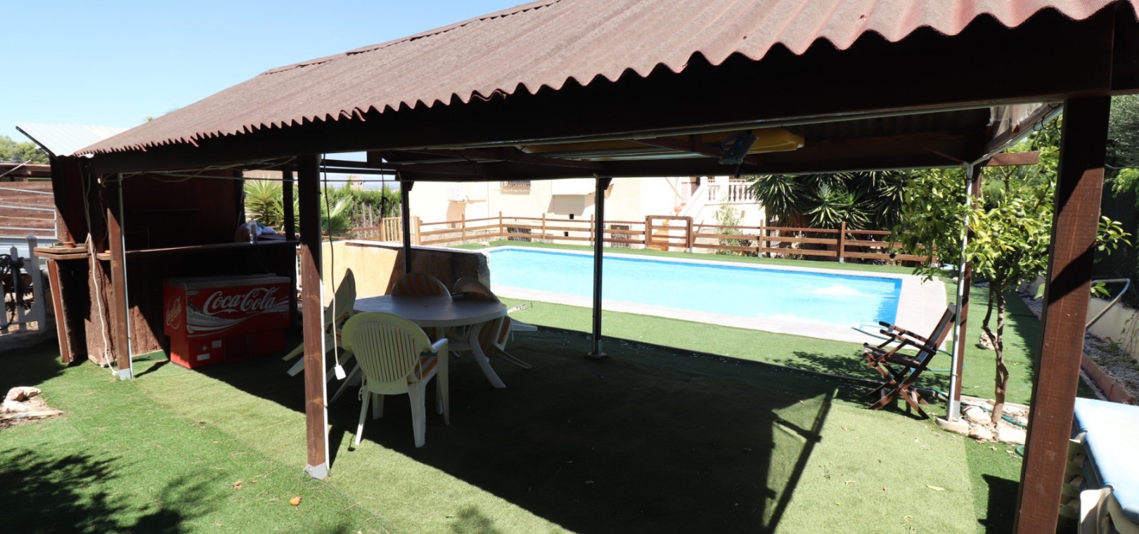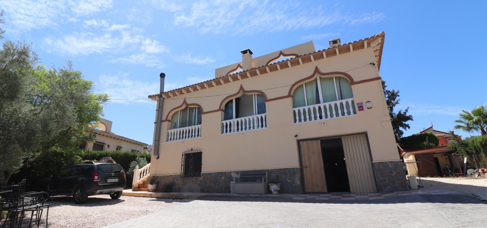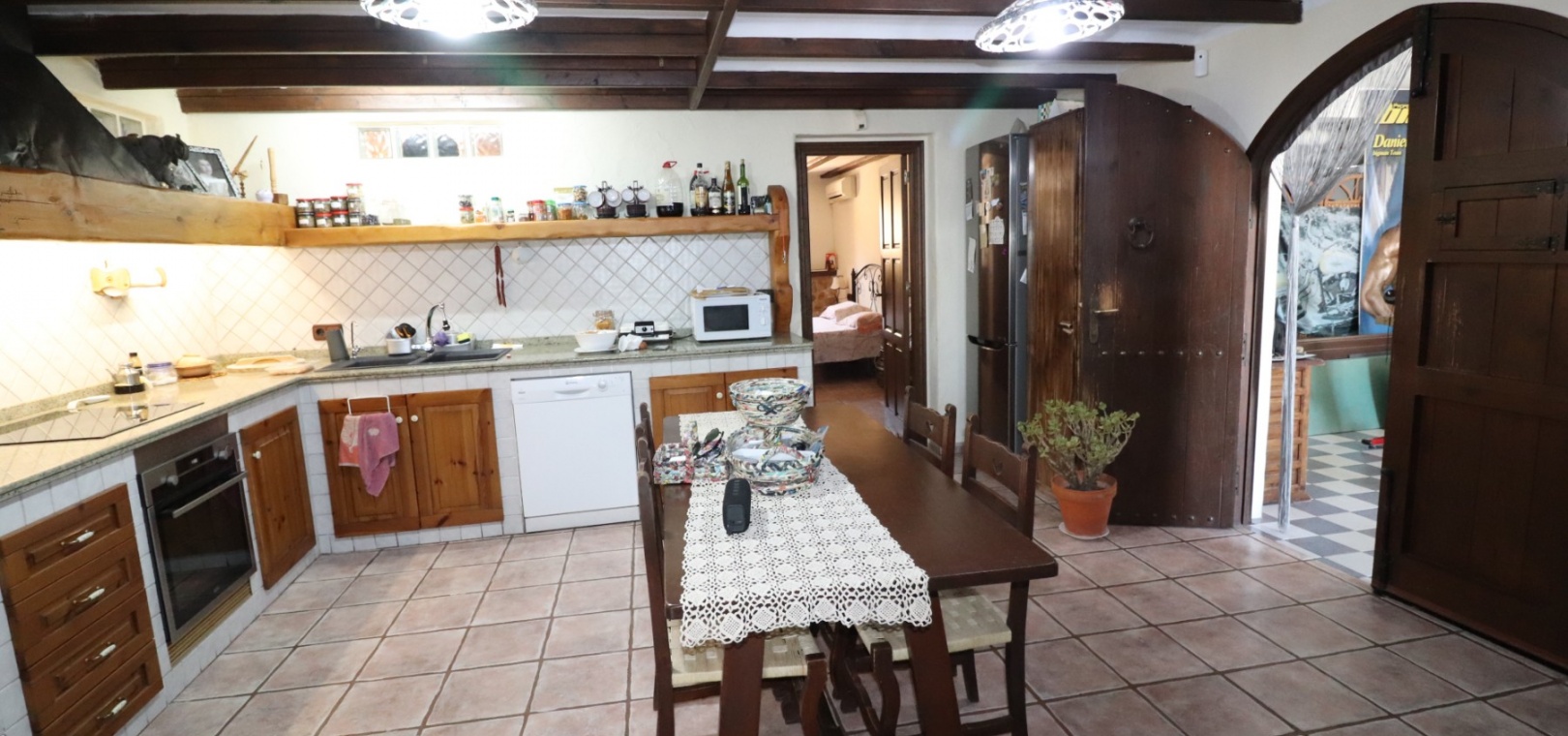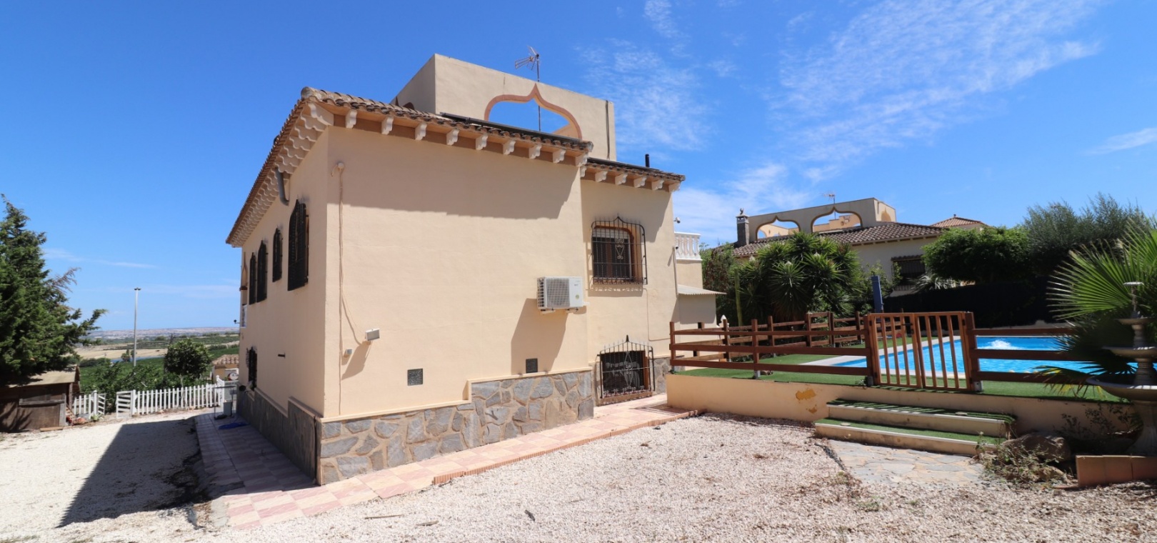 Diese charaktervolle, nach Osten ausgerichtete, freistehende Villa mit drei Schlafzimmern liegt in Lomas de la Juliana, einer renommierten Urbanisation zwischen dem Dorf Algorfa und dem 5-Sterne-Hotel & Spa-Resort La Finca Golf, die nur wenige Autominuten entfernt sind. Hier finden Sie Annehmlichkeiten wie Bars, Restaurants, Geschäfte, Banken, eine Apotheke, ein medizinisches Zentrum... Die Strände von Guardamar oder Orihuela Costa sind mit dem Auto etwa 20 Minuten entfernt. Das Anwesen strotzt vor Charakter, nimmt ein 1140 m² großes Grundstück ein und erstreckt sich über zwei Ebenen. Das Erdgeschoss, das fast durchgehend mit Balken versehen ist, profitiert von einem Wohnzimmer mit Eckkamin; einer geräumigen Einbauküche/Esszimmer mit wunderschönen Bogentüren aus Massivholz, die in einen weiteren Raum führen, den Sie ganz an Ihre eigenen Bedürfnisse anpassen können; einem Doppelzimmer mit Einbauschränken; einem Einzelschlafzimmer mit begehbarem Kleiderschrank und Zugang zu einem weiteren Raum, der als Schlafzimmer genutzt werden könnte; einem Familienduschraum. Eine Treppe führt vom Küchenbereich zum Hauptwohnbereich, der auch über eine Außentreppe zur verglasten Haupteingangsterrasse zugänglich ist, die in den Hauptwohnbereich führt; separate Einbauküche; zwei Doppelschlafzimmer, Hauptschlafzimmer mit eigenem Bad; Einzelschlafzimmer; weiteres Familienbadezimmer. Von der gewölbten, überdachten Terrasse führen Stufen hinunter zum Poolbereich, außerdem gibt es Außentreppen hinauf zum Solarium, wo Sie die schöne Aussicht auf die Landschaft und die Berge genießen können. Der angelegte Garten mit einer Vielzahl von Pflanzen, Bäumen und Sträuchern verfügt außerdem über einen 10 x 5 großen Privatpool, einen Parkplatz abseits der Straße; Nebengebäude, die Aufmerksamkeit erfordern. Sie müssen sich diese eigenwillige Villa einfach ansehen, um zu schätzen, was sie zu bieten hat.
