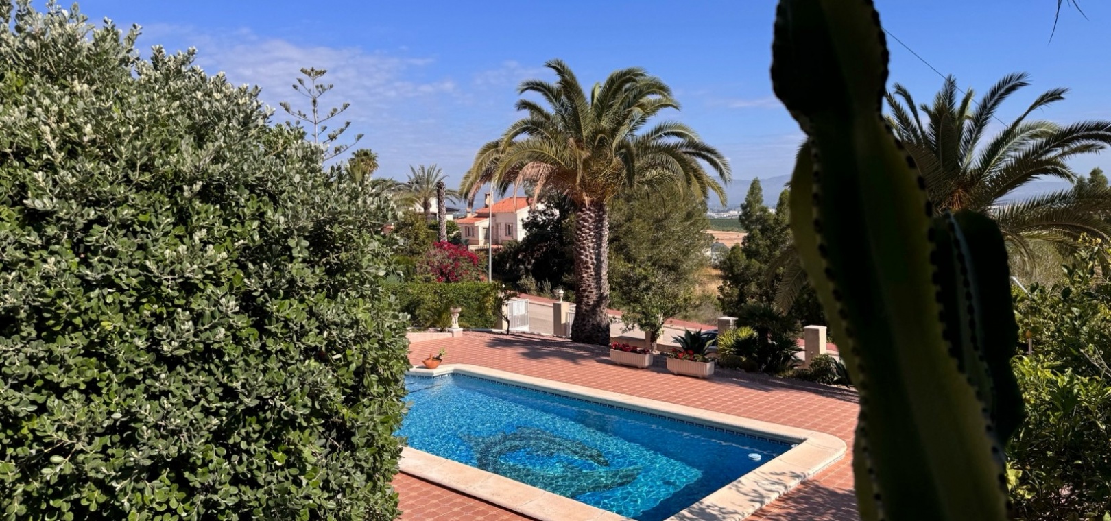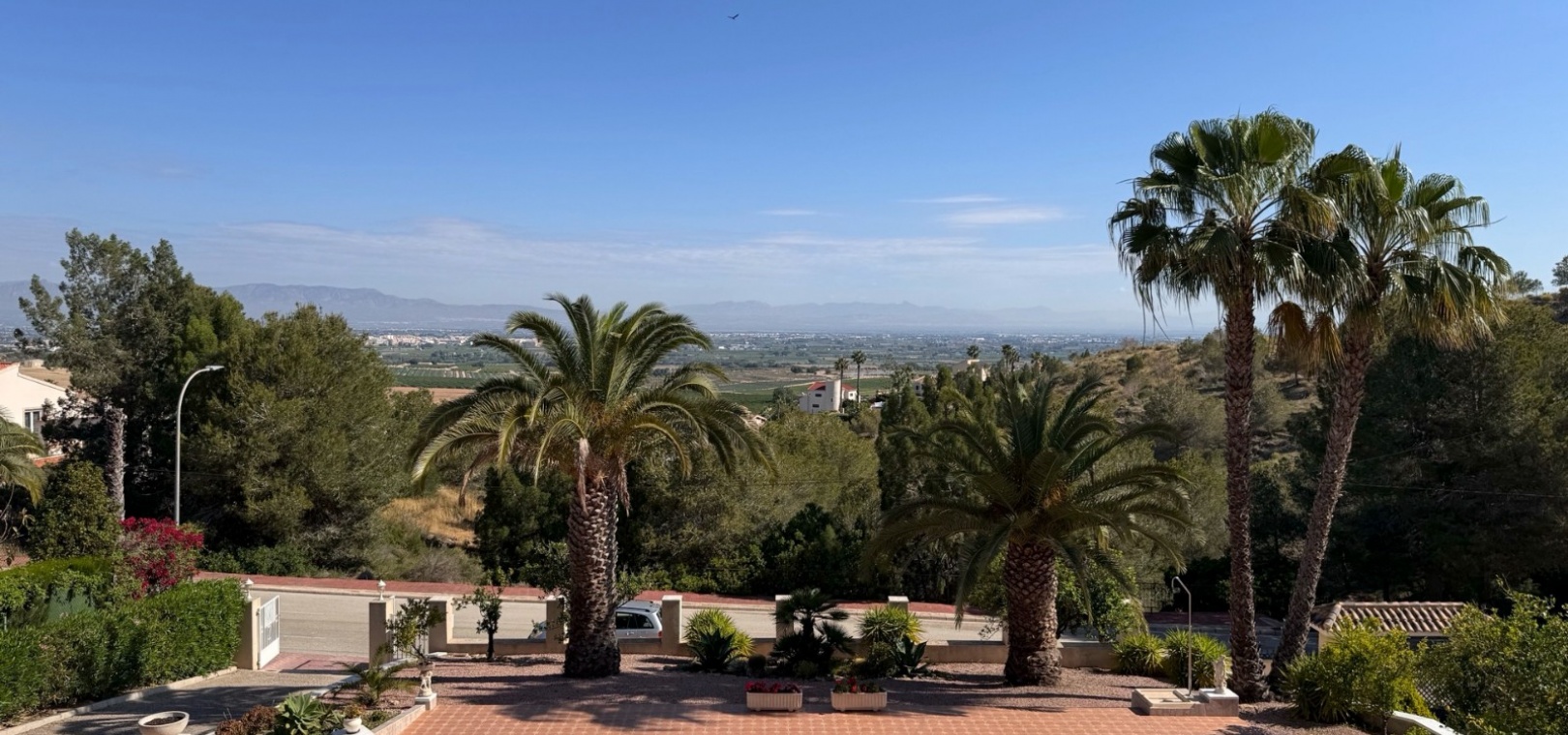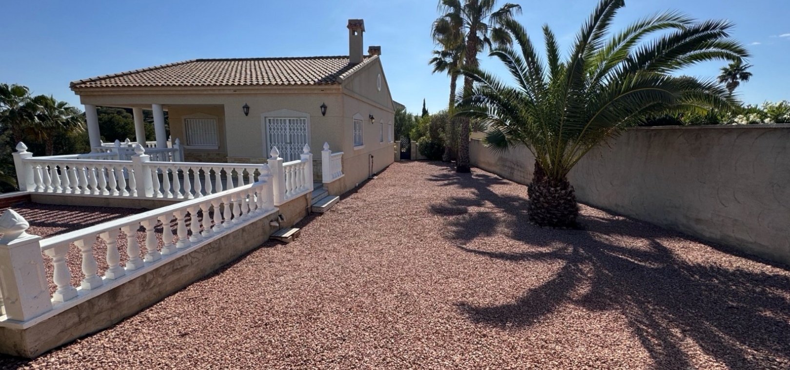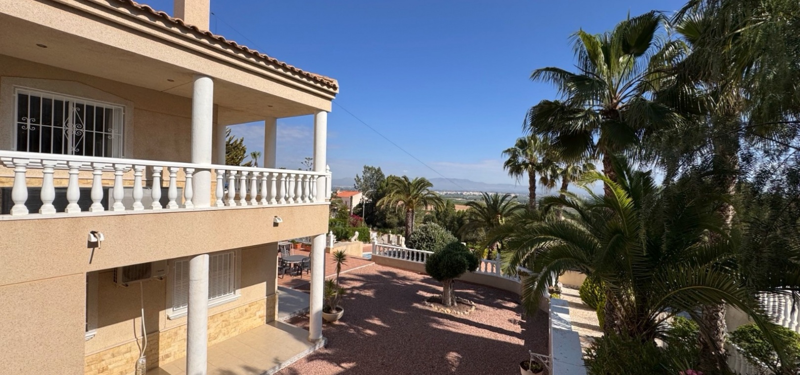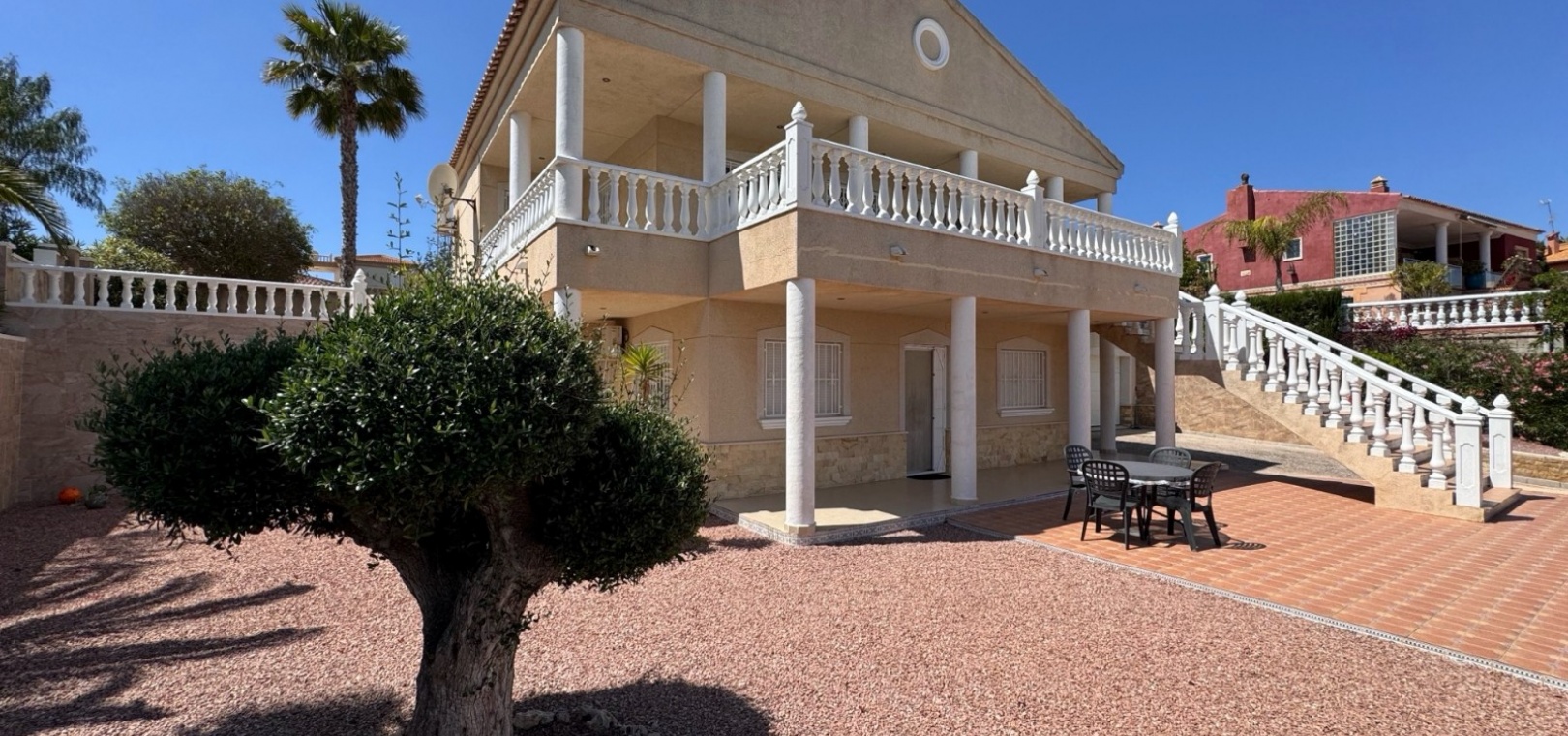 Diese imposante, freistehende Villa mit 216 m², drei Schlafzimmern und einer Wohnfläche von 216 m² befindet sich in Lomas de La Juliana in einer sehr gefragten Wohngegend mit einem Tennisclub am Eingang und dem 5-Sterne-Hotel La Finca, einem Spa und einem Golfplatz direkt vor der Haustür, wo Sie auch eine Vielzahl von Restaurants und Geschäften finden. Die wichtigsten Supermarktketten finden Sie in Almoradi und Benijofar, die nur 5 Autominuten entfernt sind. Die Strände entlang der Küste sind mit dem Auto etwa 20 Minuten entfernt. Dieses außergewöhnliche Haus steht auf einem 1220 m² großen, privaten, landschaftlich gestalteten Grundstück mit der umfassendsten Aussicht, die Sie in der Gegend finden werden. Der Hauptwohnbereich der Villa ist über eine Außentreppe zu einem überdachten Terrassenbereich in L-Form zugänglich, von dem aus Sie in den schönen, hellen Wohnbereich gelangen, der über Schiebetüren und drei Fenstersätze, einen offenen Kamin, eine unglaubliche Einbauküche/Frühstücksraum, ein Doppelschlafzimmer und ein Familienduschbad verfügt. Das Erdgeschoss des Anwesens ist von außen zugänglich und besteht aus einem Wohnzimmer, einem Torbogen zur Einbauküche, einem Badezimmer und zwei Doppelschlafzimmern. Der Garten ist mit Kieselsteinen und Fliesen ausgelegt und hat eine lange Auffahrt, die zu einer Garage und einem Carport führt. Der Poolbereich ist gefliest und von vielen ausgewachsenen Bäumen, Büschen und Palmen umgeben. Zu den Extras gehören Fußbodenheizung im gesamten Erdgeschoss, Klimaanlage, Einbauschränke in allen Schlafzimmern und ein Bewässerungssystem.