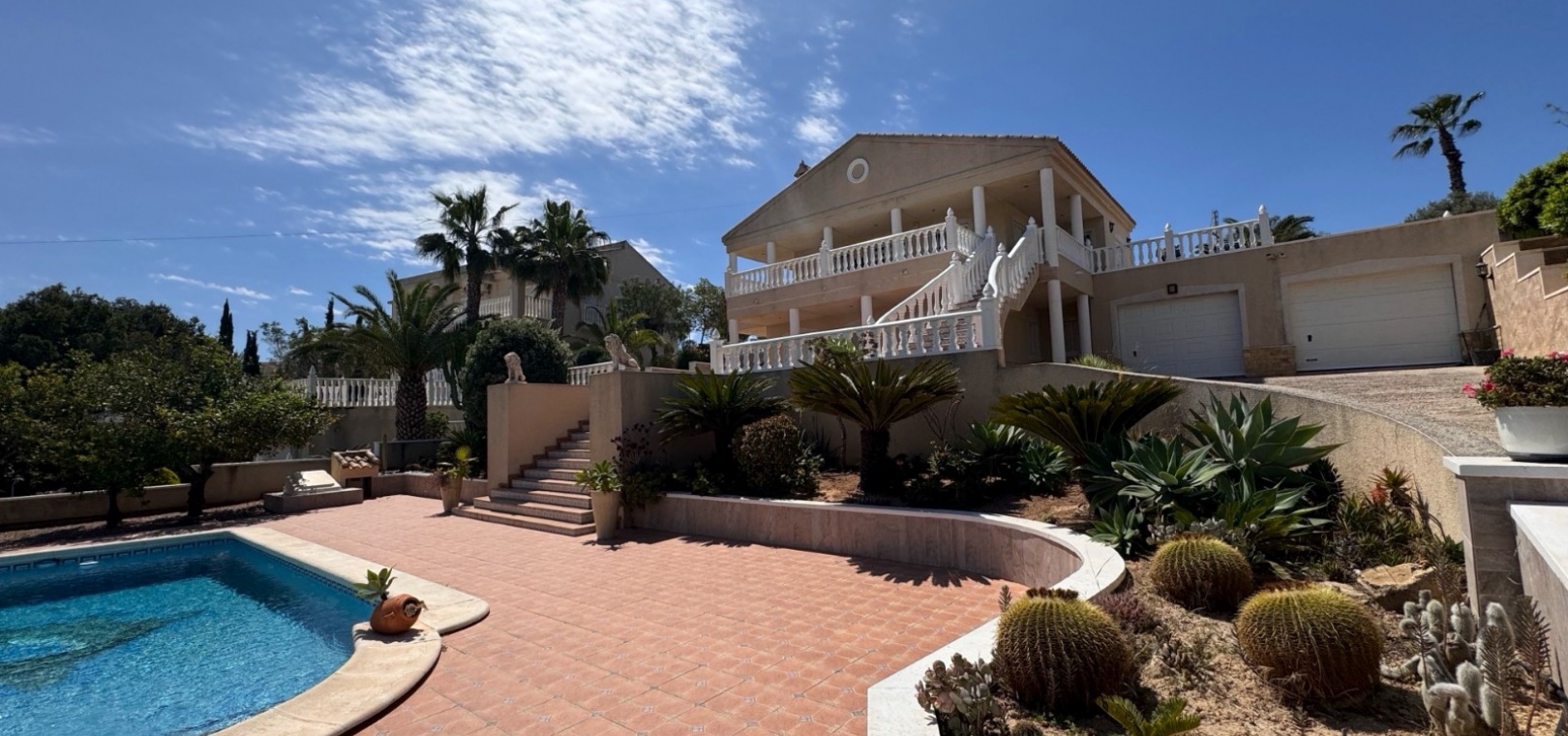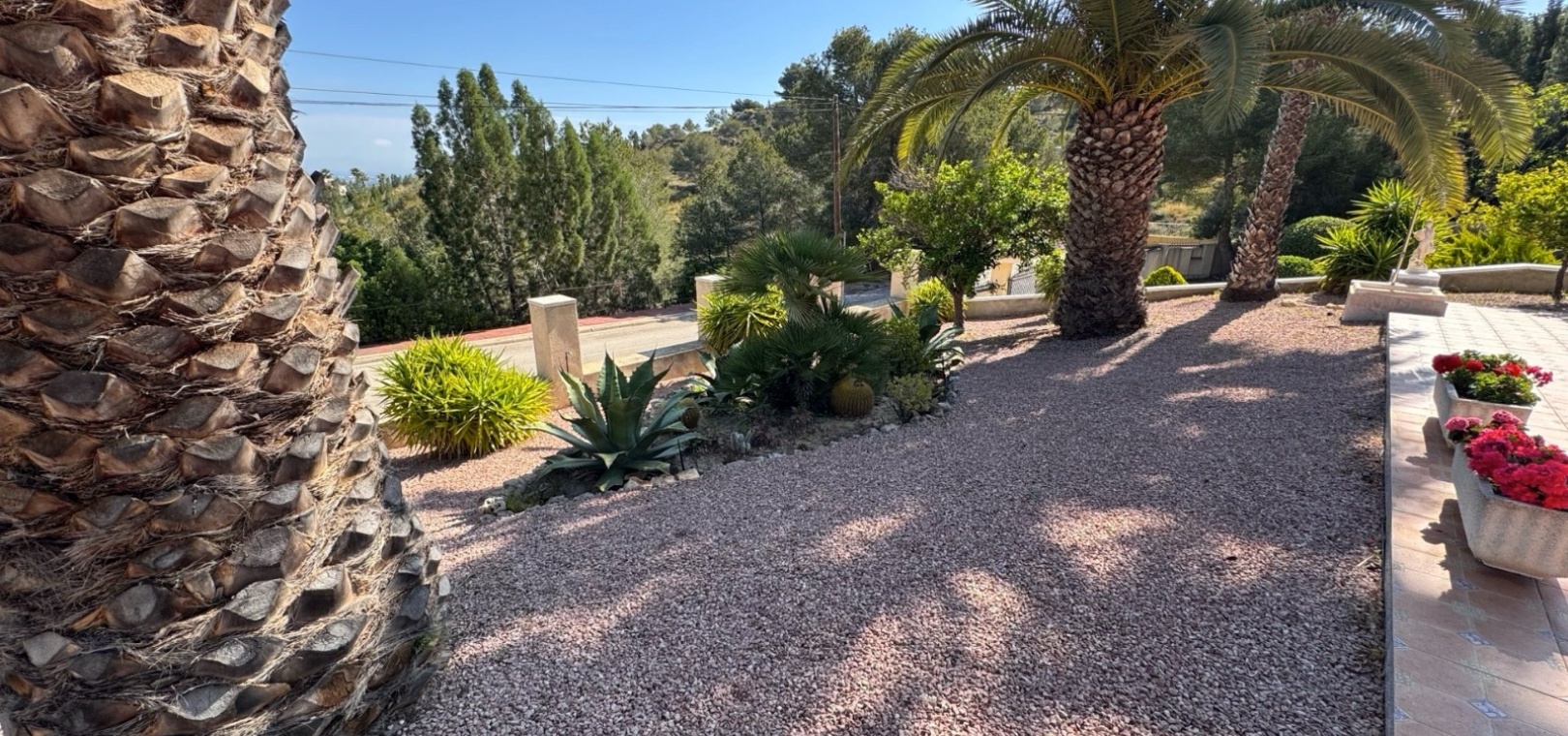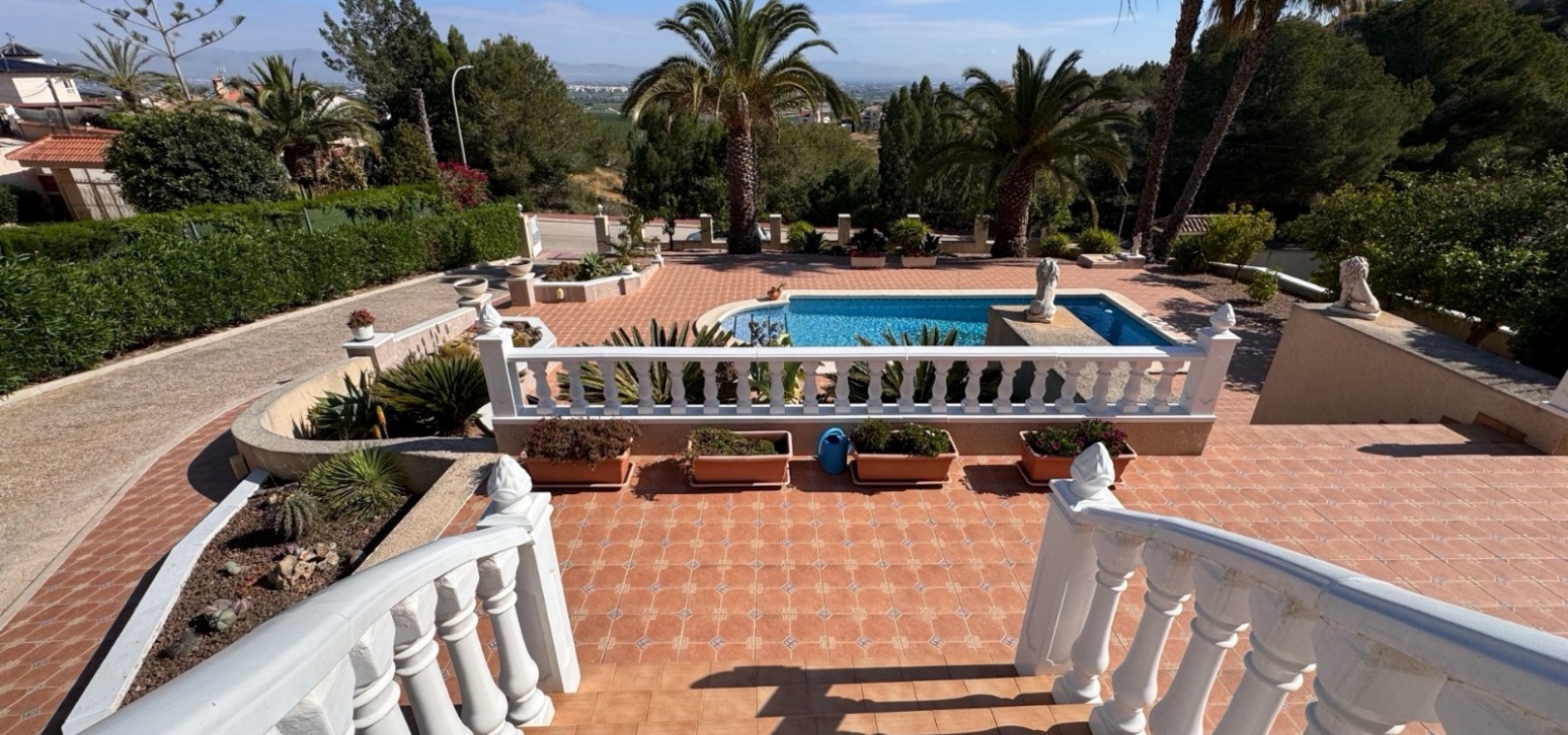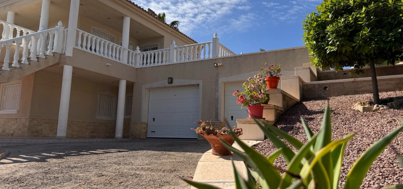 Diese imposante, freistehende Villa mit 216 m², drei Schlafzimmern und einer Wohnfläche von 216 m² befindet sich in Lomas de La Juliana in einer sehr gefragten Wohngegend mit einem Tennisclub am Eingang und dem 5-Sterne-Hotel La Finca, einem Spa und einem Golfplatz direkt vor der Haustür, wo Sie auch eine Vielzahl von Restaurants und Geschäften finden. Die wichtigsten Supermarktketten finden Sie in Almoradi und Benijofar, die nur 5 Autominuten entfernt sind. Die Strände entlang der Küste sind mit dem Auto etwa 20 Minuten entfernt. Dieses außergewöhnliche Haus steht auf einem 1220 m² großen, privaten, landschaftlich gestalteten Grundstück mit der umfassendsten Aussicht, die Sie in der Gegend finden werden. Der Hauptwohnbereich der Villa ist über eine Außentreppe zu einem überdachten Terrassenbereich in L-Form zugänglich, von dem aus Sie in den schönen, hellen Wohnbereich gelangen, der über Schiebetüren und drei Fenstersätze, einen offenen Kamin, eine unglaubliche Einbauküche/Frühstücksraum, ein Doppelschlafzimmer und ein Familienduschbad verfügt. Das Erdgeschoss des Anwesens ist von außen zugänglich und besteht aus einem Wohnzimmer, einem Torbogen zur Einbauküche, einem Badezimmer und zwei Doppelschlafzimmern. Der Garten ist mit Kieselsteinen und Fliesen ausgelegt und hat eine lange Auffahrt, die zu einer Garage und einem Carport führt. Der Poolbereich ist gefliest und von vielen ausgewachsenen Bäumen, Büschen und Palmen umgeben. Zu den Extras gehören Fußbodenheizung im gesamten Erdgeschoss, Klimaanlage, Einbauschränke in allen Schlafzimmern und ein Bewässerungssystem.