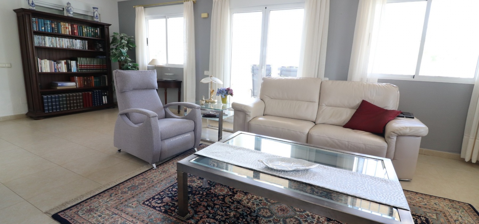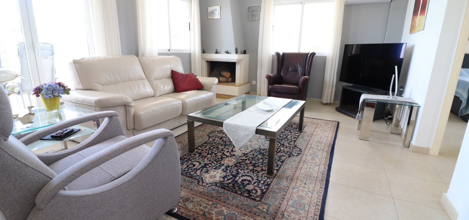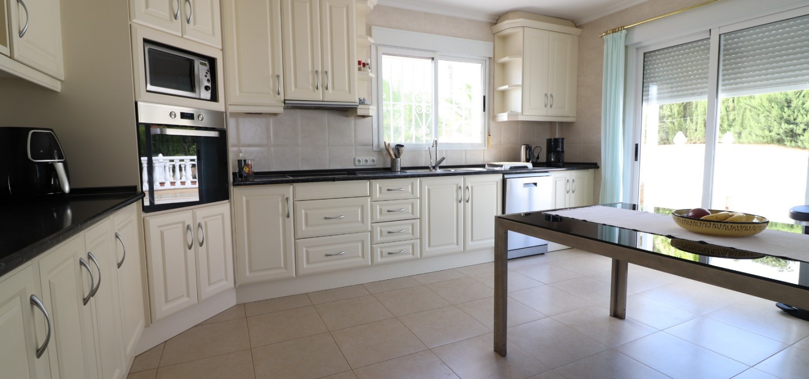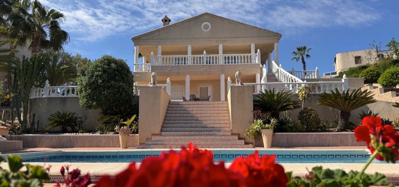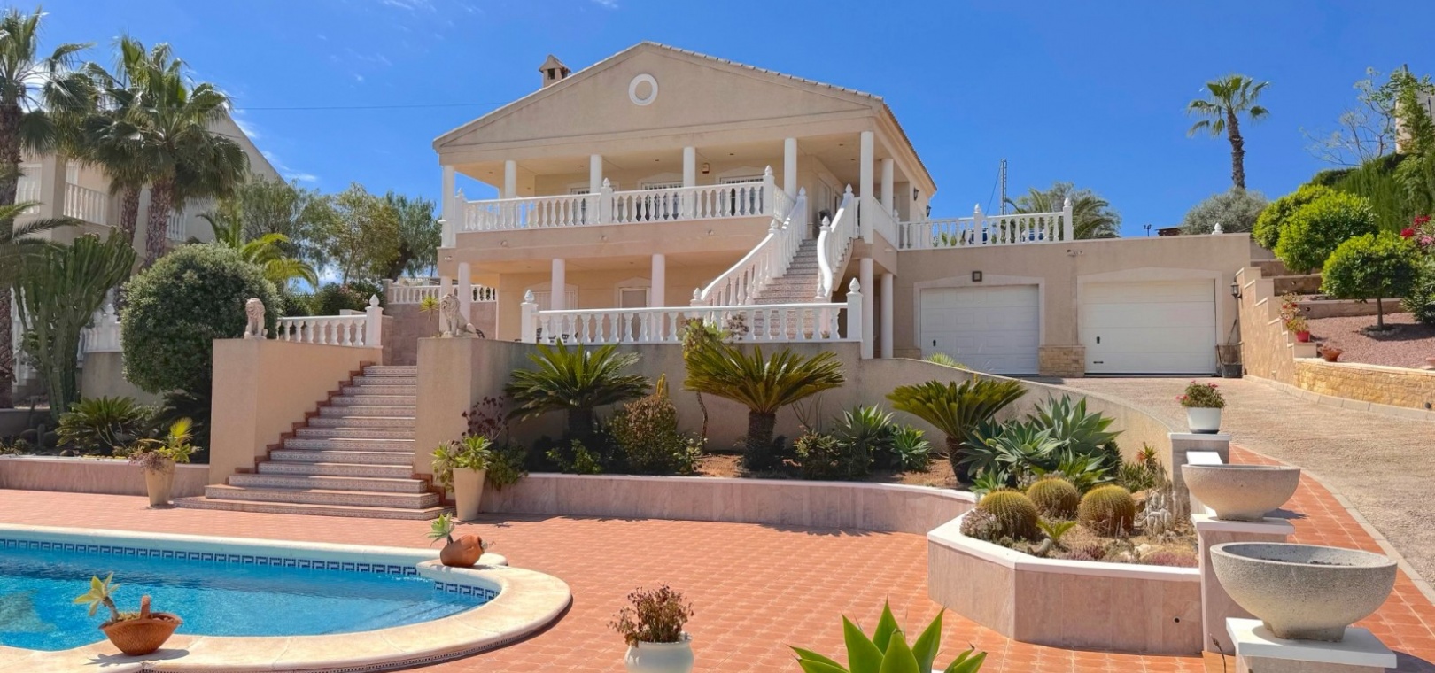 Diese imposante, freistehende Villa mit 216 m², drei Schlafzimmern und einer Wohnfläche von 216 m² befindet sich in Lomas de La Juliana in einer sehr gefragten Wohngegend mit einem Tennisclub am Eingang und dem 5-Sterne-Hotel La Finca, einem Spa und einem Golfplatz direkt vor der Haustür, wo Sie auch eine Vielzahl von Restaurants und Geschäften finden. Die wichtigsten Supermarktketten finden Sie in Almoradi und Benijofar, die nur 5 Autominuten entfernt sind. Die Strände entlang der Küste sind mit dem Auto etwa 20 Minuten entfernt. Dieses außergewöhnliche Haus steht auf einem 1220 m² großen, privaten, landschaftlich gestalteten Grundstück mit der umfassendsten Aussicht, die Sie in der Gegend finden werden. Der Hauptwohnbereich der Villa ist über eine Außentreppe zu einem überdachten Terrassenbereich in L-Form zugänglich, von dem aus Sie in den schönen, hellen Wohnbereich gelangen, der über Schiebetüren und drei Fenstersätze, einen offenen Kamin, eine unglaubliche Einbauküche/Frühstücksraum, ein Doppelschlafzimmer und ein Familienduschbad verfügt. Das Erdgeschoss des Anwesens ist von außen zugänglich und besteht aus einem Wohnzimmer, einem Torbogen zur Einbauküche, einem Badezimmer und zwei Doppelschlafzimmern. Der Garten ist mit Kieselsteinen und Fliesen ausgelegt und hat eine lange Auffahrt, die zu einer Garage und einem Carport führt. Der Poolbereich ist gefliest und von vielen ausgewachsenen Bäumen, Büschen und Palmen umgeben. Zu den Extras gehören Fußbodenheizung im gesamten Erdgeschoss, Klimaanlage, Einbauschränke in allen Schlafzimmern und ein Bewässerungssystem.