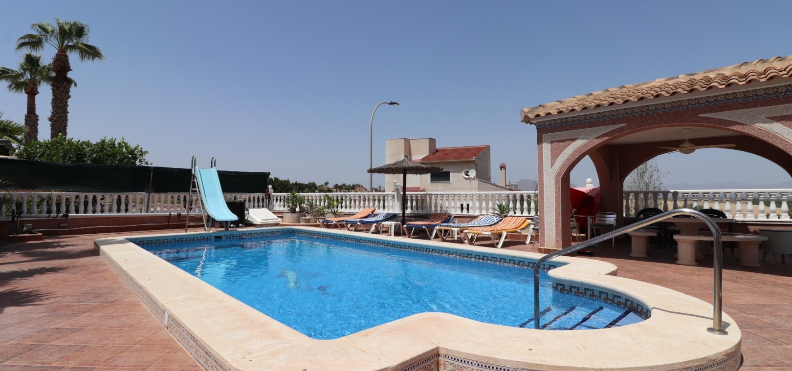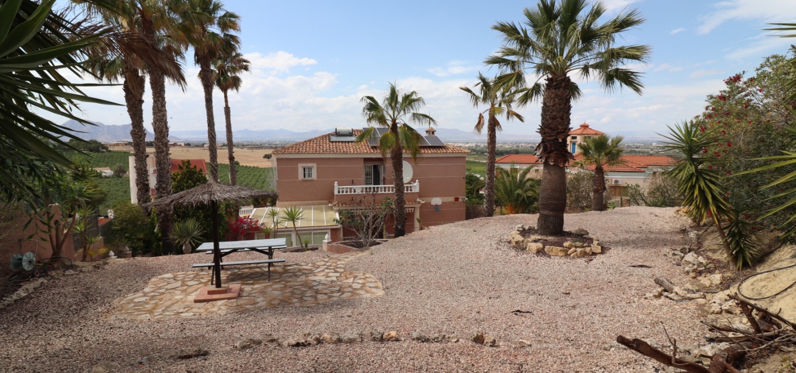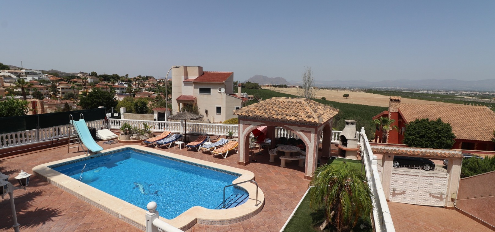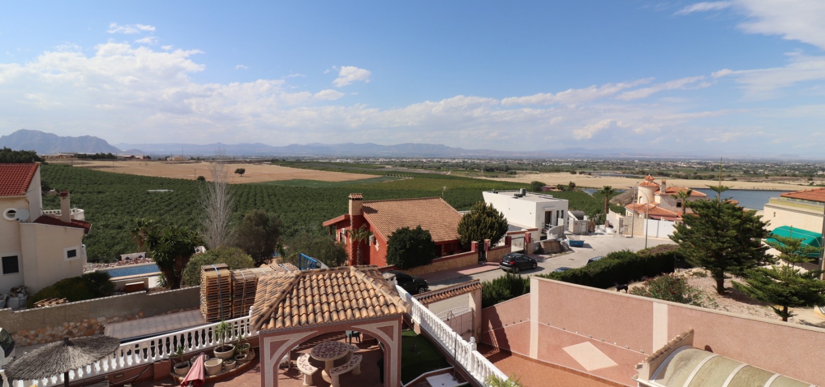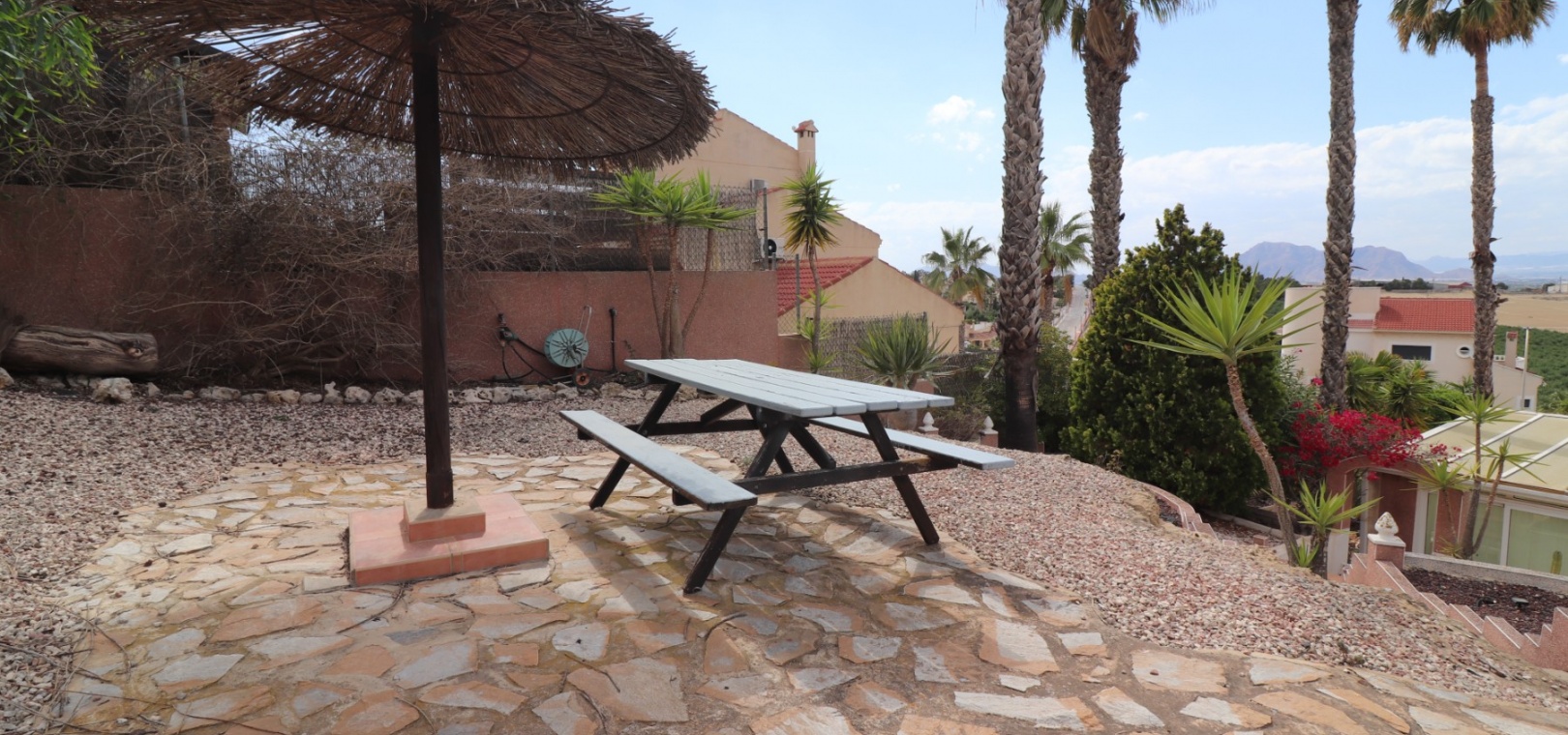 Diese äußerst geräumige, nach Westen ausgerichtete, freistehende Villa mit vier Schlafzimmern in Lomas de La Juliana befindet sich in einer prestigeträchtigen Urbanisation zwischen Algorfa Village und La Finca Golf Resort auf einem großzügigen Grundstück von 1251 m². Dieses atemberaubende Anwesen verfügt über vier Schlafzimmer und drei Badezimmer, darunter ein luxuriöses Hauptschlafzimmer mit eigenem Badezimmer, das über eine Eckbadewanne und eine Dusche verfügt. Sowohl das Hauptschlafzimmer als auch das vierte Schlafzimmer haben direkten Zugang zur Terrasse im ersten Stock. Darüber hinaus gibt es eine Toilette, einen Parkplatz abseits der Straße, einen Carport und eine Garage. Die Villa bietet eine verglaste Terrasse an der Vorderseite, von der Sie einen atemberaubenden Panoramablick auf die Landschaft, die Berge und den Sonnenuntergang genießen können. Der Wintergarten an der Rückseite bietet zusätzlichen Wohnraum, während die offene, voll ausgestattete Küche mit einem angrenzenden Hauswirtschaftsraum für zusätzlichen Komfort ausgestattet ist. Der geräumige Wohnbereich ist durchgehend mit Klimaanlage, Grills, einem Kamin und Einbauschränken für reichlich Stauraum ausgestattet. Das Äußere des Anwesens ist ebenso beeindruckend und verfügt über einen privaten beheizten Swimmingpool und einen festen Pavillon für schattige Mahlzeiten im Freien, perfekt für die Unterhaltung von Gästen. Es gibt auch einen Grillplatz und einen wunderschön angelegten Garten hinter dem Haus mit Terrassen, Bäumen, Sträuchern und Pflanzen. Das Anwesen verfügt über 8 Sonnenkollektoren und 1 Solar-Wasserkollektor, was zu seiner Energieeffizienz beiträgt. Sicherheit hat Priorität, da CCTV und ein Alarmsystem installiert sind. Die Lage dieser Villa bietet das Beste aus beiden Welten – eine ruhige Umgebung mit einem Tennisclub am Anfang der Urbanisation, aber nur 5 Autominuten von den nächsten Geschäften und Annehmlichkeiten und 15 Autominuten von den nächsten Stränden entfernt. Dieses Anwesen repräsentiert wahrhaftig einen luxuriösen Lebensstil im Herzen der Costa Blanca Süd. 412 m2 Baufläche, einfach Wow!!!