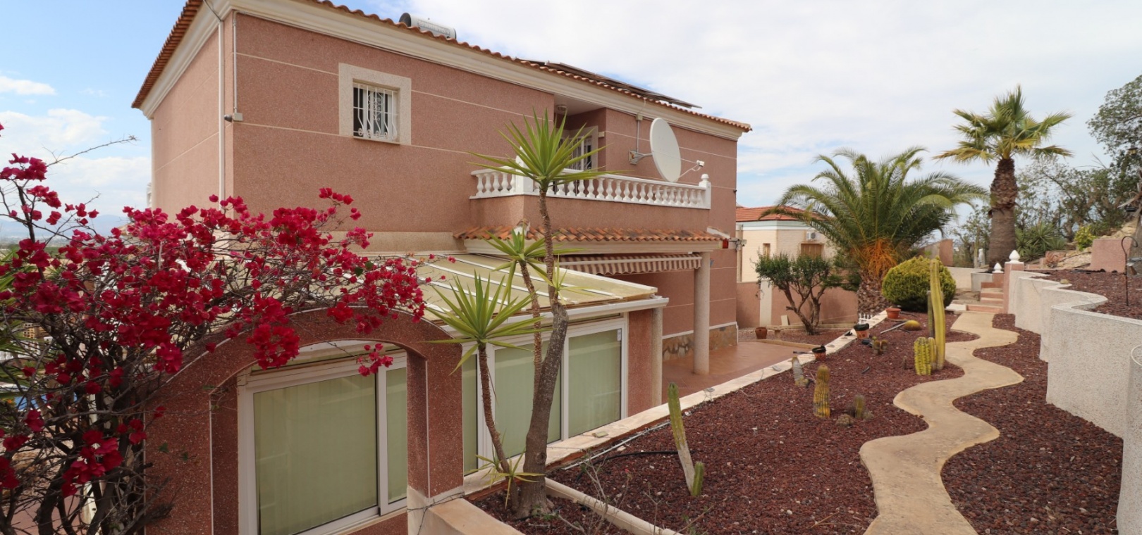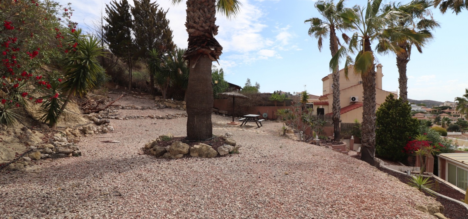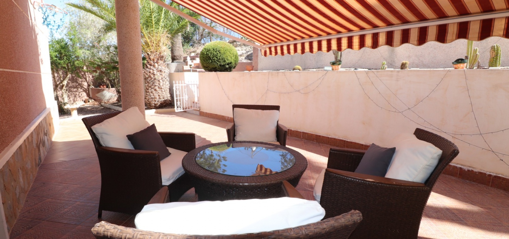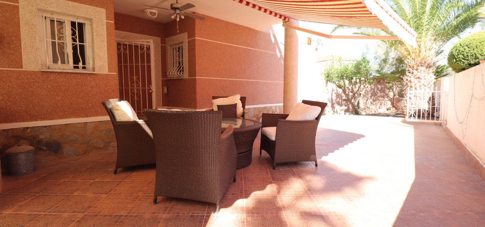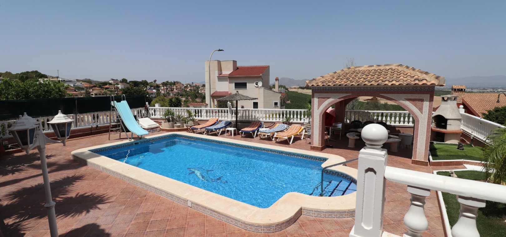 Diese äußerst geräumige, nach Westen ausgerichtete, freistehende Villa mit vier Schlafzimmern in Lomas de La Juliana befindet sich in einer prestigeträchtigen Urbanisation zwischen Algorfa Village und La Finca Golf Resort auf einem großzügigen Grundstück von 1251 m². Dieses atemberaubende Anwesen verfügt über vier Schlafzimmer und drei Badezimmer, darunter ein luxuriöses Hauptschlafzimmer mit eigenem Badezimmer, das über eine Eckbadewanne und eine Dusche verfügt. Sowohl das Hauptschlafzimmer als auch das vierte Schlafzimmer haben direkten Zugang zur Terrasse im ersten Stock. Darüber hinaus gibt es eine Toilette, einen Parkplatz abseits der Straße, einen Carport und eine Garage. Die Villa bietet eine verglaste Terrasse an der Vorderseite, von der Sie einen atemberaubenden Panoramablick auf die Landschaft, die Berge und den Sonnenuntergang genießen können. Der Wintergarten an der Rückseite bietet zusätzlichen Wohnraum, während die offene, voll ausgestattete Küche mit einem angrenzenden Hauswirtschaftsraum für zusätzlichen Komfort ausgestattet ist. Der geräumige Wohnbereich ist durchgehend mit Klimaanlage, Grills, einem Kamin und Einbauschränken für reichlich Stauraum ausgestattet. Das Äußere des Anwesens ist ebenso beeindruckend und verfügt über einen privaten beheizten Swimmingpool und einen festen Pavillon für schattige Mahlzeiten im Freien, perfekt für die Unterhaltung von Gästen. Es gibt auch einen Grillplatz und einen wunderschön angelegten Garten hinter dem Haus mit Terrassen, Bäumen, Sträuchern und Pflanzen. Das Anwesen verfügt über 8 Sonnenkollektoren und 1 Solar-Wasserkollektor, was zu seiner Energieeffizienz beiträgt. Sicherheit hat Priorität, da CCTV und ein Alarmsystem installiert sind. Die Lage dieser Villa bietet das Beste aus beiden Welten – eine ruhige Umgebung mit einem Tennisclub am Anfang der Urbanisation, aber nur 5 Autominuten von den nächsten Geschäften und Annehmlichkeiten und 15 Autominuten von den nächsten Stränden entfernt. Dieses Anwesen repräsentiert wahrhaftig einen luxuriösen Lebensstil im Herzen der Costa Blanca Süd. 412 m2 Baufläche, einfach Wow!!!