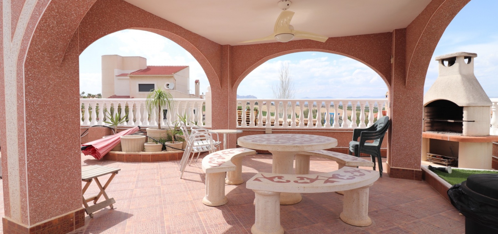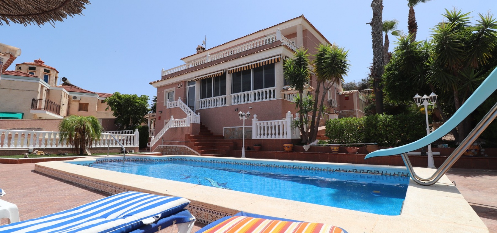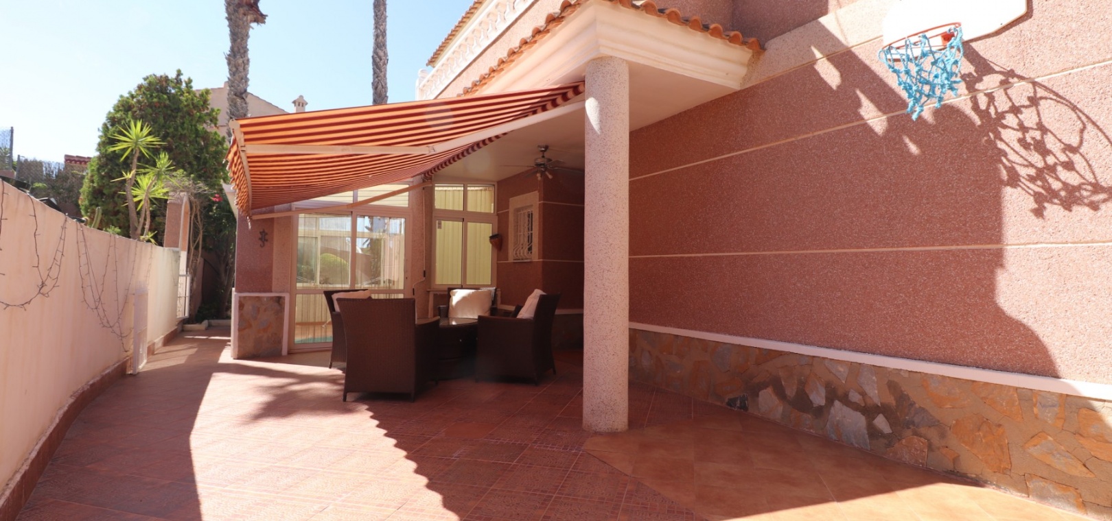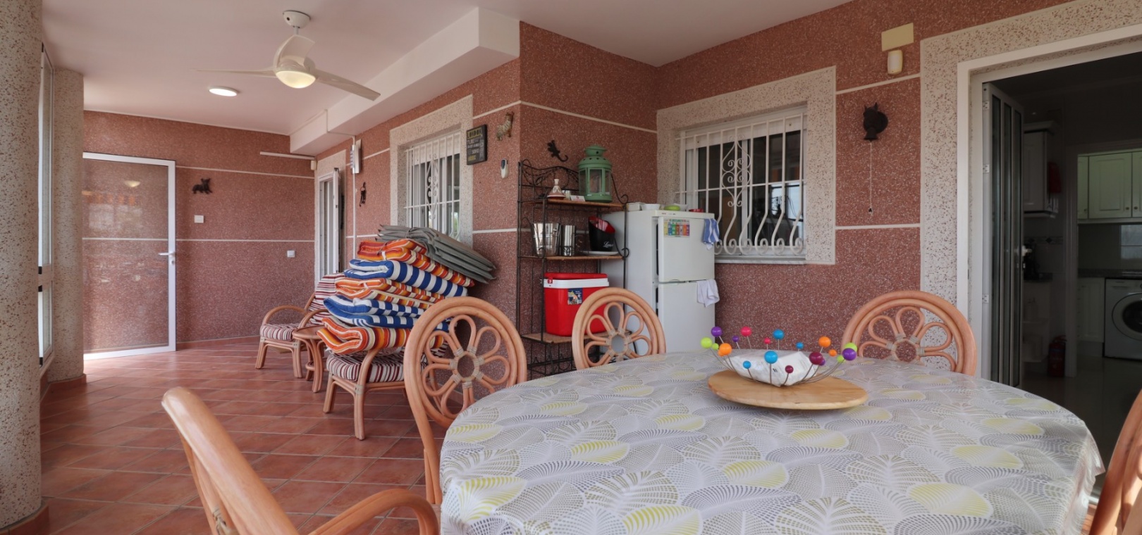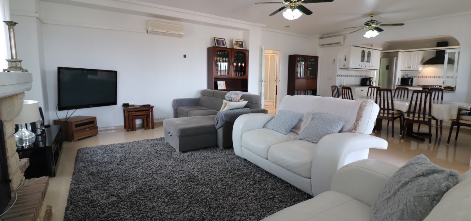 Diese äußerst geräumige, nach Westen ausgerichtete, freistehende Villa mit vier Schlafzimmern in Lomas de La Juliana befindet sich in einer prestigeträchtigen Urbanisation zwischen Algorfa Village und La Finca Golf Resort auf einem großzügigen Grundstück von 1251 m². Dieses atemberaubende Anwesen verfügt über vier Schlafzimmer und drei Badezimmer, darunter ein luxuriöses Hauptschlafzimmer mit eigenem Badezimmer, das über eine Eckbadewanne und eine Dusche verfügt. Sowohl das Hauptschlafzimmer als auch das vierte Schlafzimmer haben direkten Zugang zur Terrasse im ersten Stock. Darüber hinaus gibt es eine Toilette, einen Parkplatz abseits der Straße, einen Carport und eine Garage. Die Villa bietet eine verglaste Terrasse an der Vorderseite, von der Sie einen atemberaubenden Panoramablick auf die Landschaft, die Berge und den Sonnenuntergang genießen können. Der Wintergarten an der Rückseite bietet zusätzlichen Wohnraum, während die offene, voll ausgestattete Küche mit einem angrenzenden Hauswirtschaftsraum für zusätzlichen Komfort ausgestattet ist. Der geräumige Wohnbereich ist durchgehend mit Klimaanlage, Grills, einem Kamin und Einbauschränken für reichlich Stauraum ausgestattet. Das Äußere des Anwesens ist ebenso beeindruckend und verfügt über einen privaten beheizten Swimmingpool und einen festen Pavillon für schattige Mahlzeiten im Freien, perfekt für die Unterhaltung von Gästen. Es gibt auch einen Grillplatz und einen wunderschön angelegten Garten hinter dem Haus mit Terrassen, Bäumen, Sträuchern und Pflanzen. Das Anwesen verfügt über 8 Sonnenkollektoren und 1 Solar-Wasserkollektor, was zu seiner Energieeffizienz beiträgt. Sicherheit hat Priorität, da CCTV und ein Alarmsystem installiert sind. Die Lage dieser Villa bietet das Beste aus beiden Welten – eine ruhige Umgebung mit einem Tennisclub am Anfang der Urbanisation, aber nur 5 Autominuten von den nächsten Geschäften und Annehmlichkeiten und 15 Autominuten von den nächsten Stränden entfernt. Dieses Anwesen repräsentiert wahrhaftig einen luxuriösen Lebensstil im Herzen der Costa Blanca Süd. 412 m2 Baufläche, einfach Wow!!!