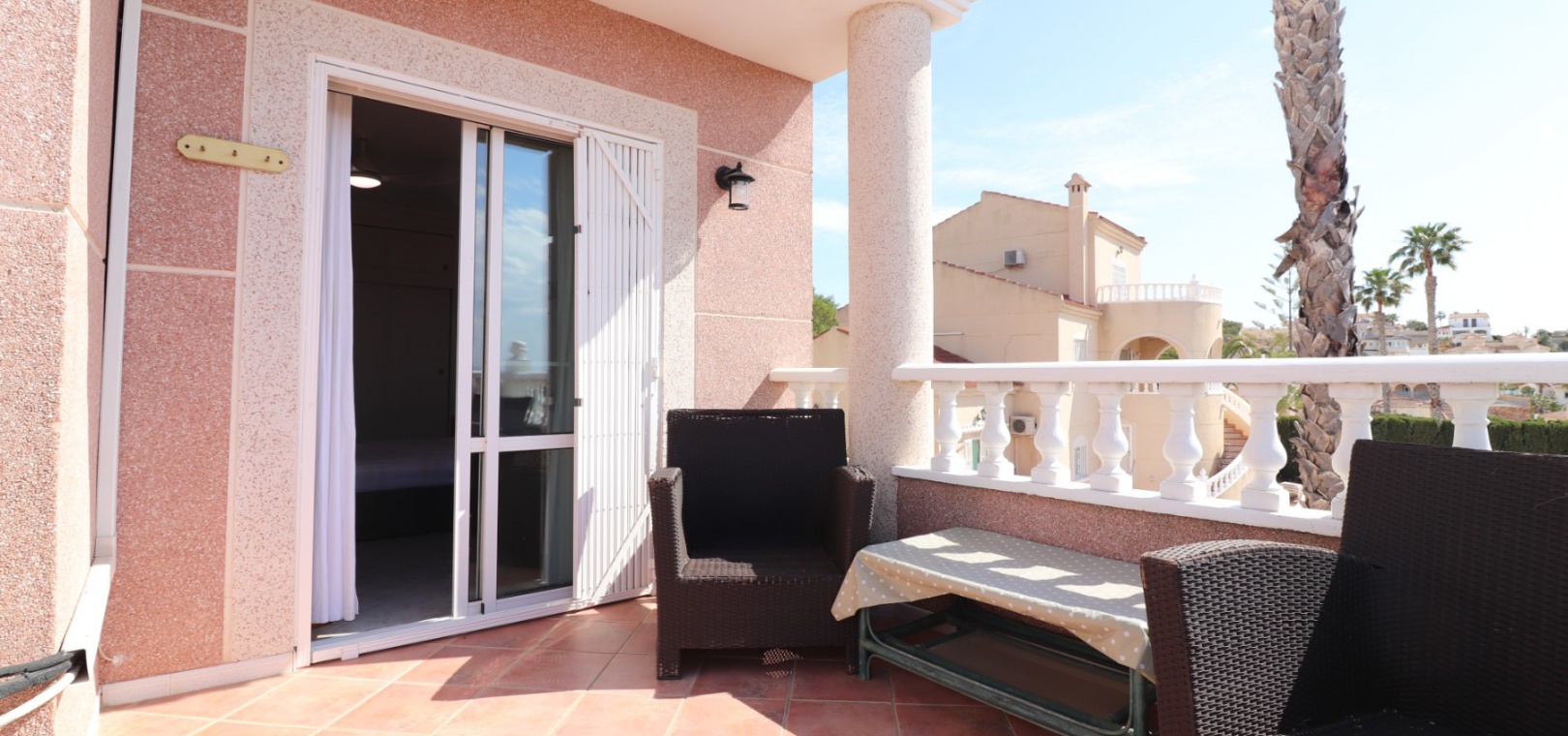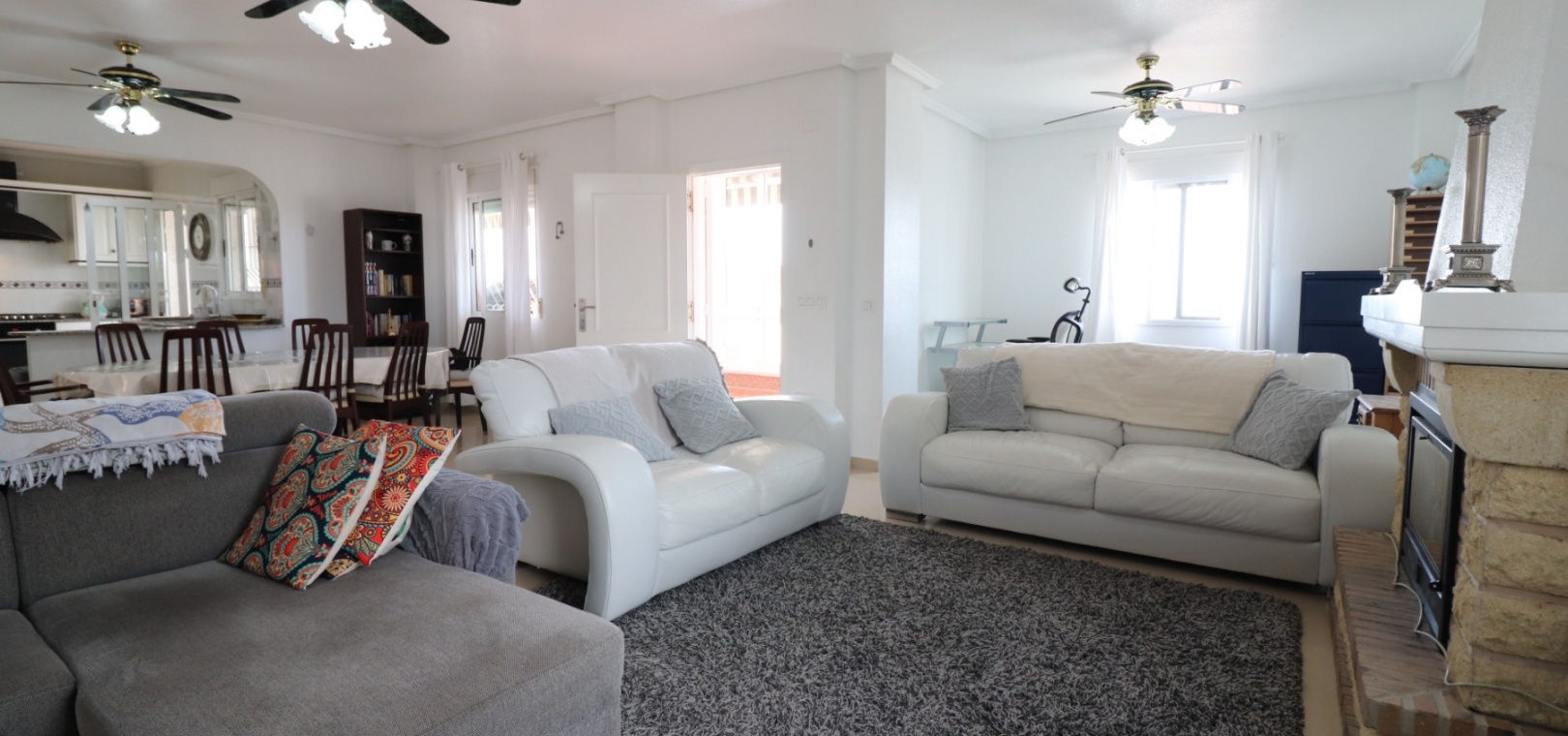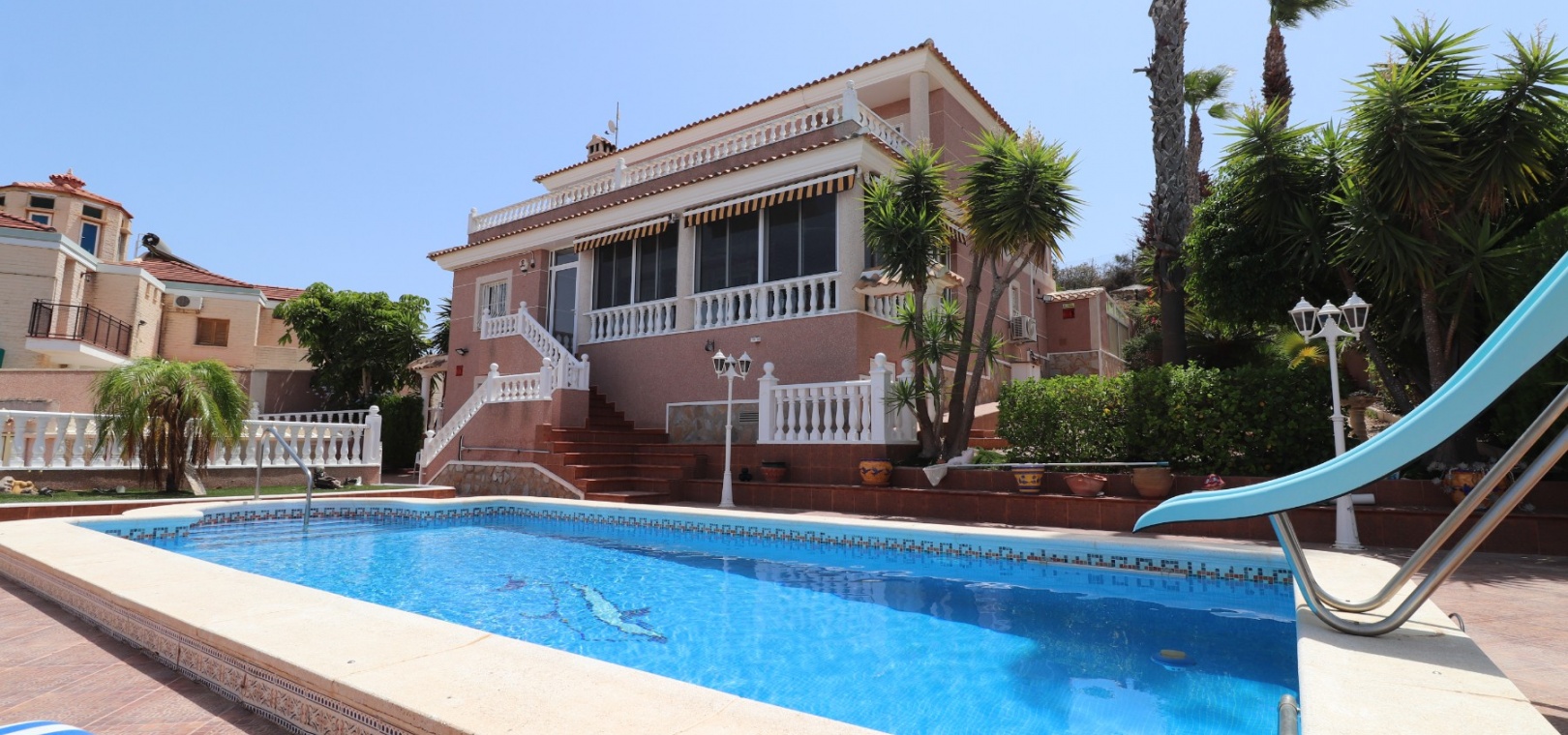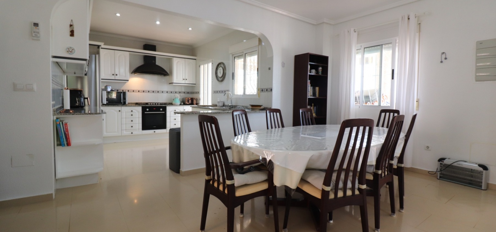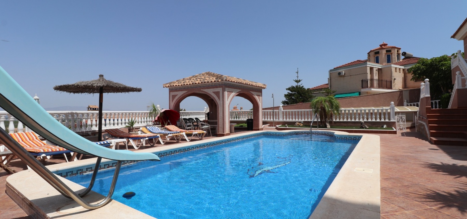 Diese äußerst geräumige, nach Westen ausgerichtete, freistehende Villa mit vier Schlafzimmern in Lomas de La Juliana befindet sich in einer prestigeträchtigen Urbanisation zwischen Algorfa Village und La Finca Golf Resort auf einem großzügigen Grundstück von 1251 m². Dieses atemberaubende Anwesen verfügt über vier Schlafzimmer und drei Badezimmer, darunter ein luxuriöses Hauptschlafzimmer mit eigenem Badezimmer, das über eine Eckbadewanne und eine Dusche verfügt. Sowohl das Hauptschlafzimmer als auch das vierte Schlafzimmer haben direkten Zugang zur Terrasse im ersten Stock. Darüber hinaus gibt es eine Toilette, einen Parkplatz abseits der Straße, einen Carport und eine Garage. Die Villa bietet eine verglaste Terrasse an der Vorderseite, von der Sie einen atemberaubenden Panoramablick auf die Landschaft, die Berge und den Sonnenuntergang genießen können. Der Wintergarten an der Rückseite bietet zusätzlichen Wohnraum, während die offene, voll ausgestattete Küche mit einem angrenzenden Hauswirtschaftsraum für zusätzlichen Komfort ausgestattet ist. Der geräumige Wohnbereich ist durchgehend mit Klimaanlage, Grills, einem Kamin und Einbauschränken für reichlich Stauraum ausgestattet. Das Äußere des Anwesens ist ebenso beeindruckend und verfügt über einen privaten beheizten Swimmingpool und einen festen Pavillon für schattige Mahlzeiten im Freien, perfekt für die Unterhaltung von Gästen. Es gibt auch einen Grillplatz und einen wunderschön angelegten Garten hinter dem Haus mit Terrassen, Bäumen, Sträuchern und Pflanzen. Das Anwesen verfügt über 8 Sonnenkollektoren und 1 Solar-Wasserkollektor, was zu seiner Energieeffizienz beiträgt. Sicherheit hat Priorität, da CCTV und ein Alarmsystem installiert sind. Die Lage dieser Villa bietet das Beste aus beiden Welten – eine ruhige Umgebung mit einem Tennisclub am Anfang der Urbanisation, aber nur 5 Autominuten von den nächsten Geschäften und Annehmlichkeiten und 15 Autominuten von den nächsten Stränden entfernt. Dieses Anwesen repräsentiert wahrhaftig einen luxuriösen Lebensstil im Herzen der Costa Blanca Süd. 412 m2 Baufläche, einfach Wow!!!