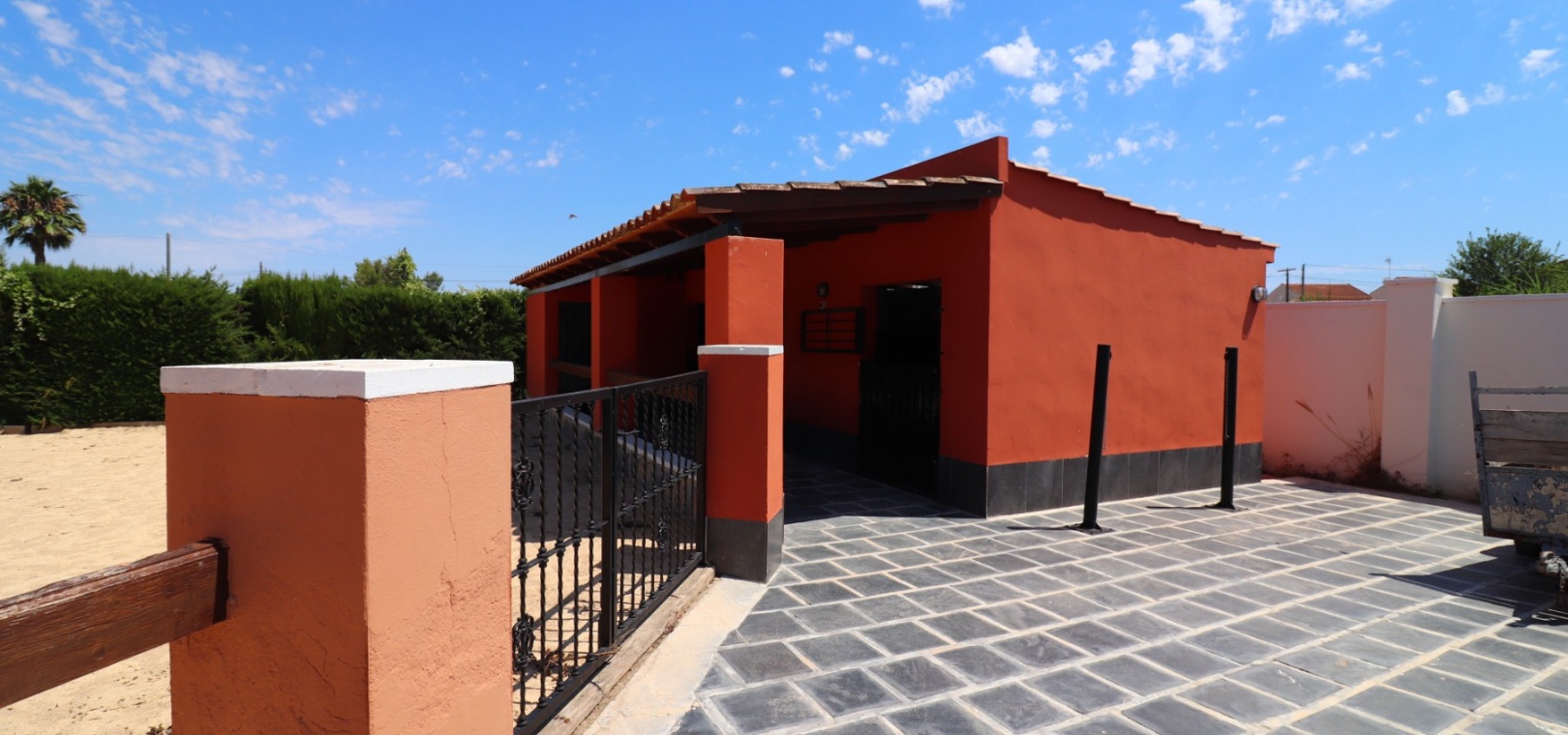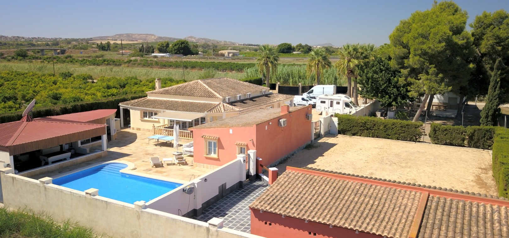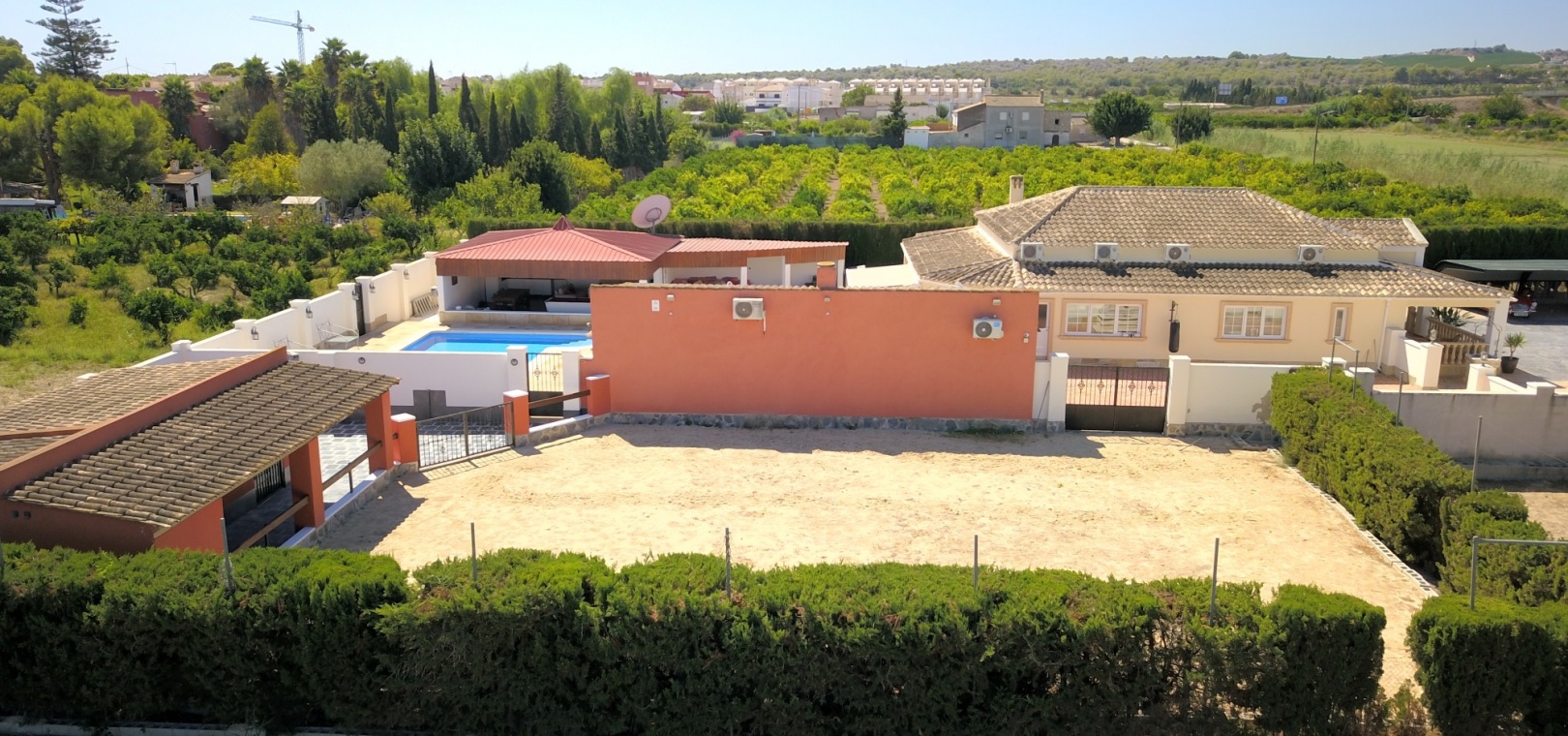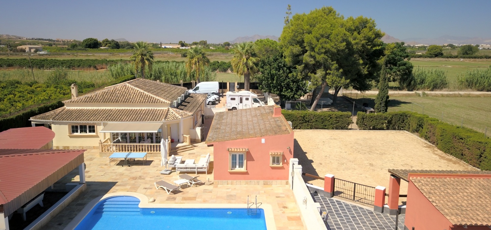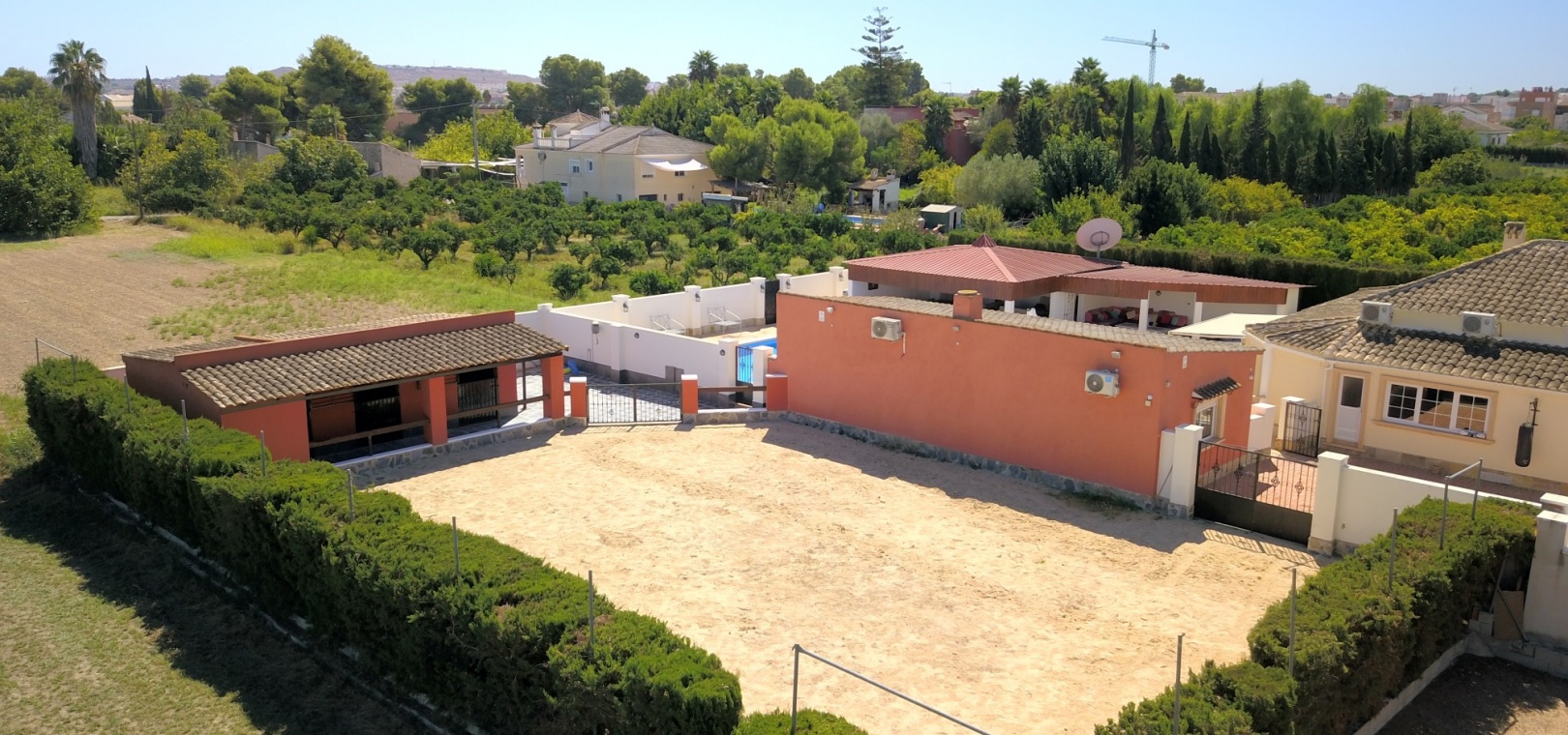 Diese wirklich begehrenswerte, nach Osten und Westen ausgerichtete, freistehende Landvilla mit vier/sechs Schlafzimmern, Ställen und Koppel steht auf einem 2000 m² großen Grundstück in Las Heredades zwischen Formentera del Segura und Almoradi in malerischer Umgebung, nur 6–7 Gehminuten von dem charmanten spanischen Dorf und nur 5 Autominuten von Formentera del Segura, Rojales und Benijofar entfernt. Die atemberaubenden Strände und die beliebte Promenade von Guardamar sind nur 15 Autominuten entfernt. Die Hauptvilla verfügt über 4 Schlafzimmer und 3 Badezimmer sowie 1 Garderobe. Eines der Schlafzimmer wird derzeit als Golfsimulatorraum genutzt, während das Hauptschlafzimmer über einen begehbaren Kleiderschrank und ein atemberaubendes Bad mit Badewanne und Dusche verfügt. Zwei der übrigen Schlafzimmer haben auch ein eigenes Bad. Die Villa umfasst eine fabelhafte, moderne Küche im Landhausstil mit fantastischen Türen, die vom Essbereich auf eine Außenterrasse mit Aussicht auf den privaten Pool führen. Der Außenbereich eignet sich perfekt für die Unterhaltung mit einer Außenküche, einem Grill und einem Unterhaltungsbereich. Die separate Gästeunterkunft bietet zwei zusätzliche Schlafzimmer, einen Nassraum, eine Küche und ein Wohnzimmer und ist somit perfekt für Besucher oder die Großfamilie. Das Anwesen umfasst Ställe und eine Koppel, ein Büro im Wohnzimmer der Hauptvilla, Klimaanlage im gesamten Gebäude, Heizpaneele, Einbauschränke und einen separaten Hauswirtschaftsraum. Der Außenbereich verfügt über atemberaubende Fliesen rund um den Swimmingpool, ausreichend Parkplätze abseits der Straße unter dem Carport und einen Springbrunnen. Diese Villa verbindet meisterhaft moderne und traditionelle Elemente und ist damit ein wirklich einzigartiges und begehrenswertes Zuhause an der Costa Blanca Süd.