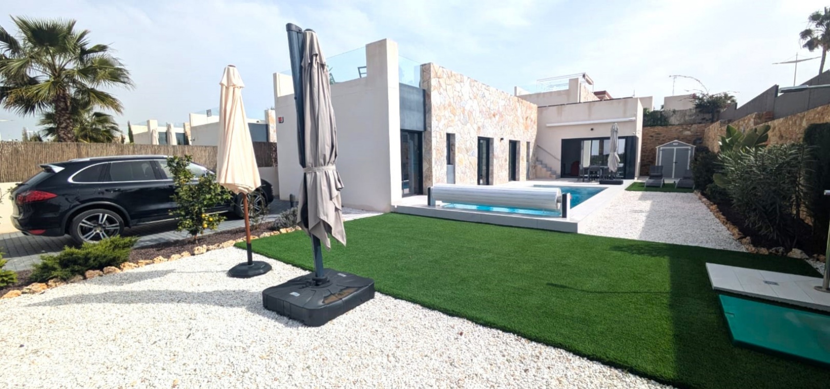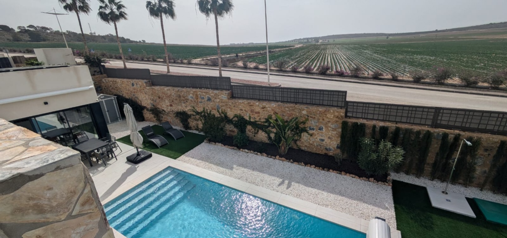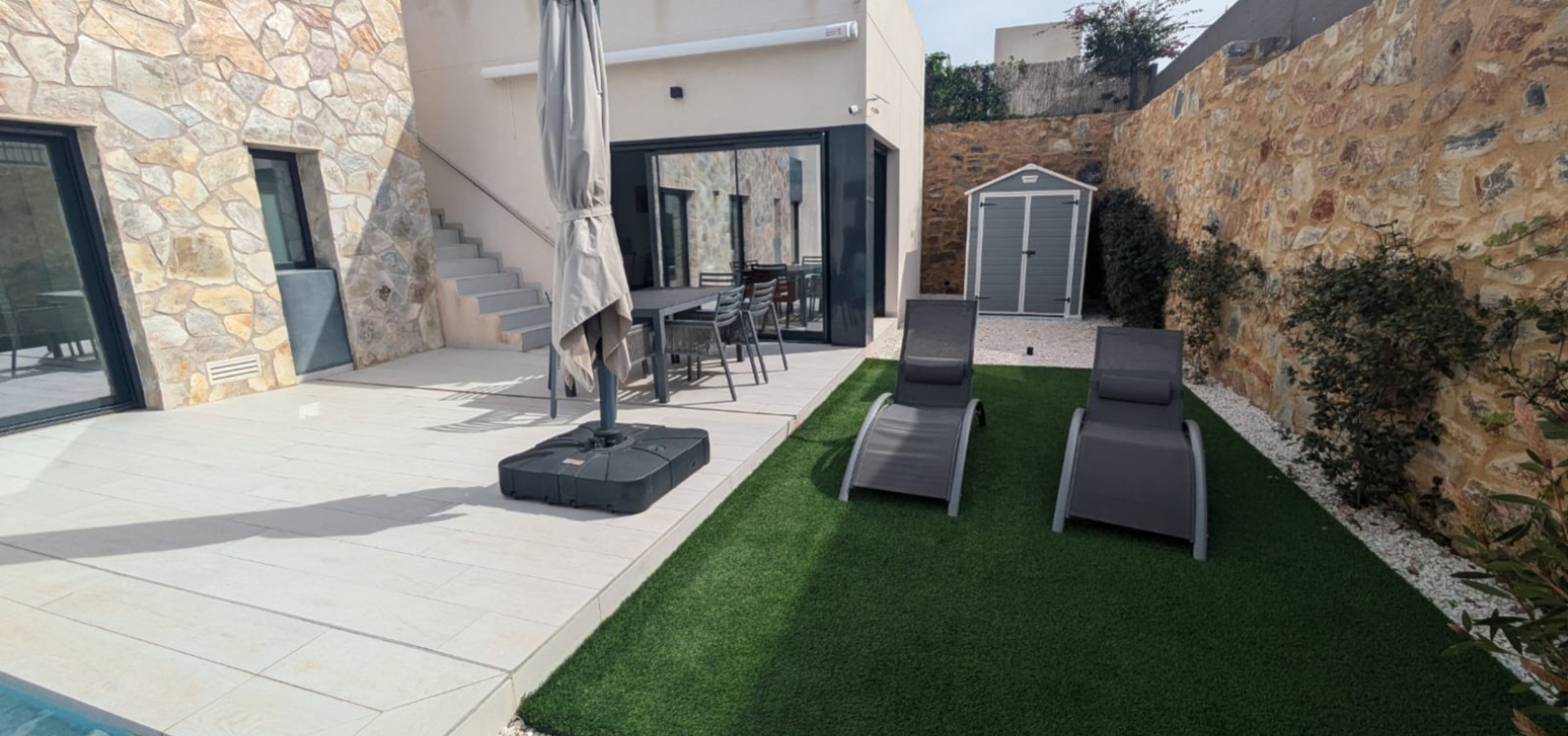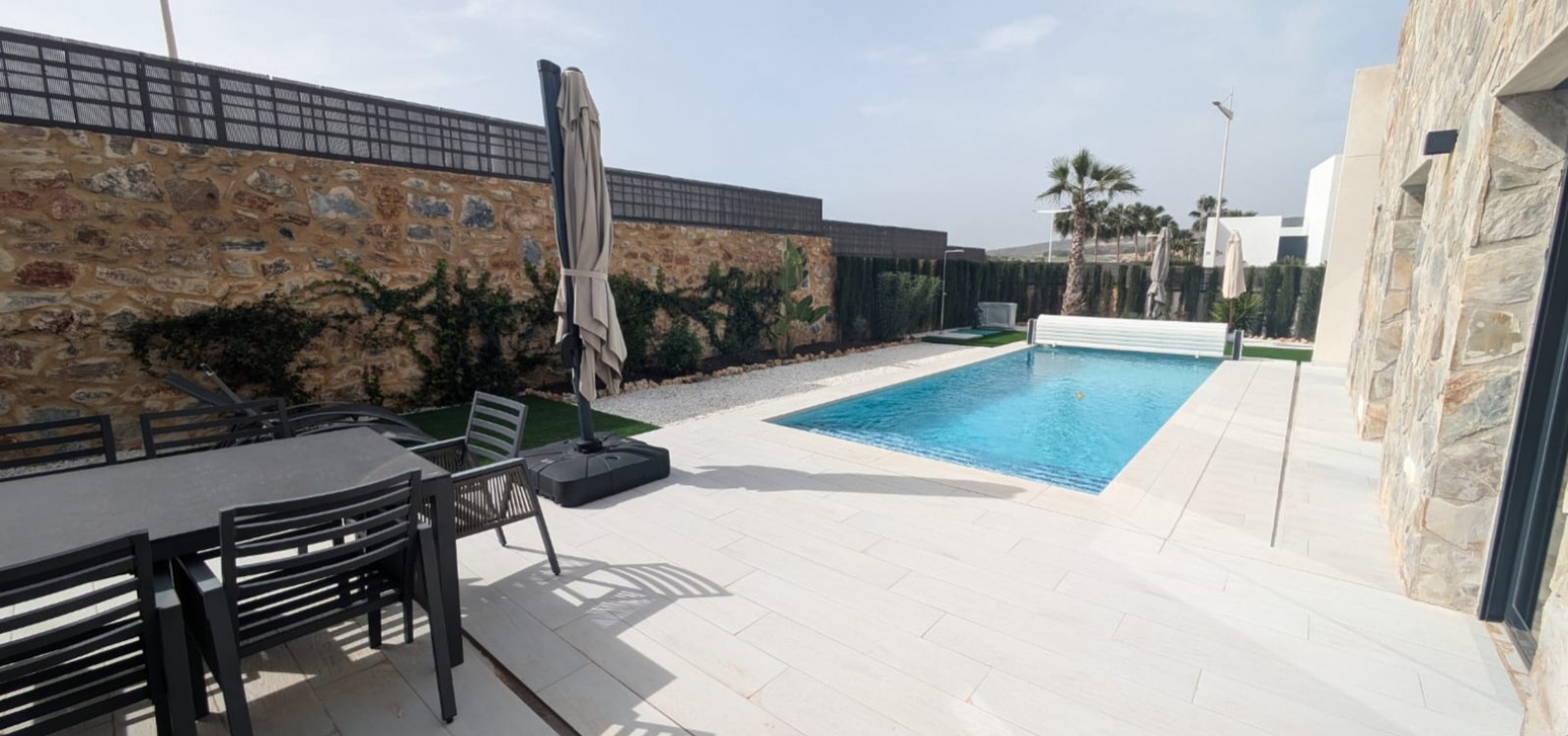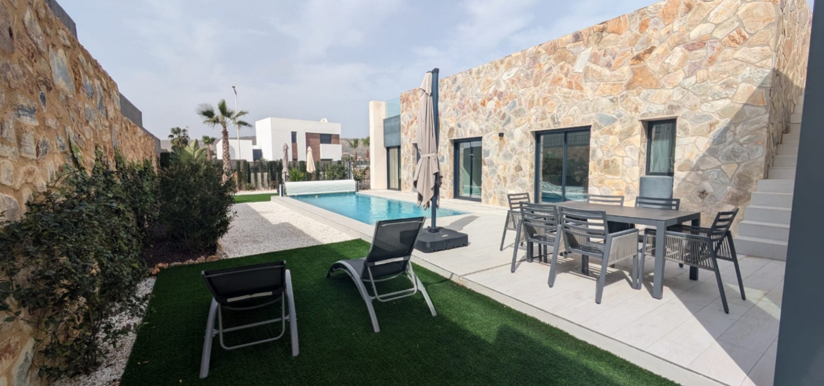 Das Anwesen verfügt über zahlreiche Außenbereiche, darunter einen großen, pflegeleichten Garten mit Ess- und Entspannungsmöglichkeiten in der Sonne. Außerdem gibt es eine große Sonnenterrasse mit herrlichem Blick auf den Golfplatz La Finca.