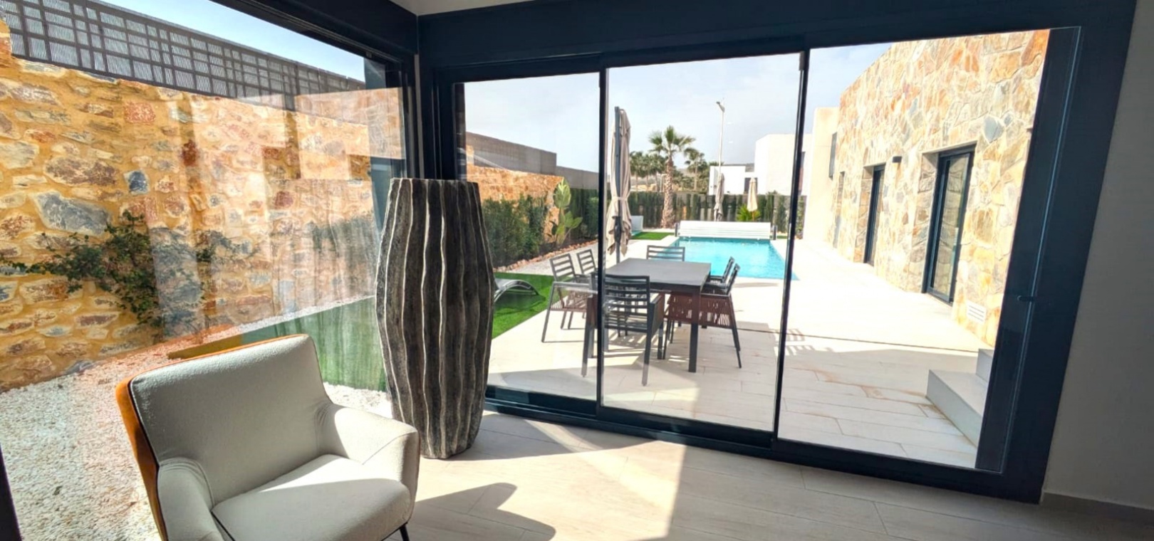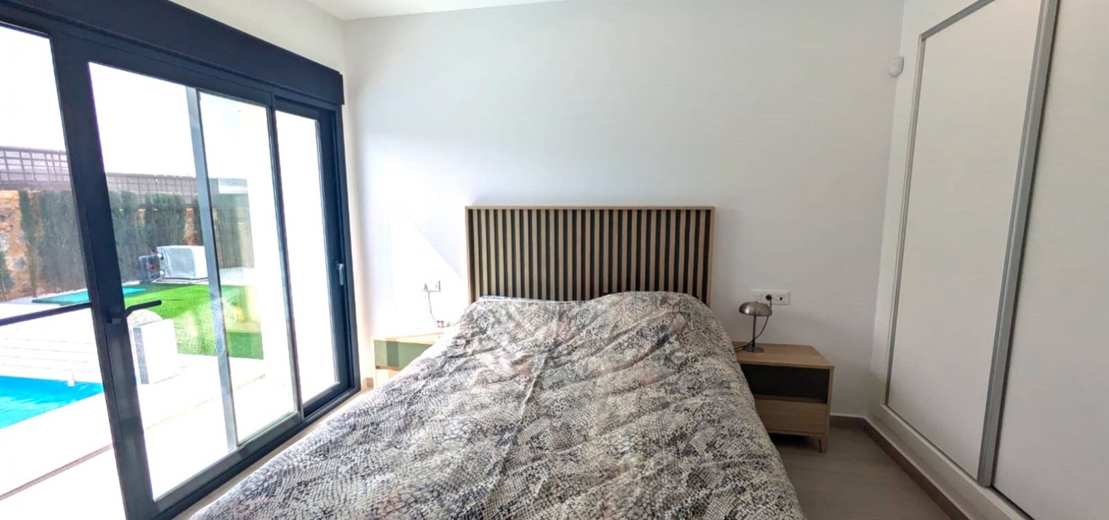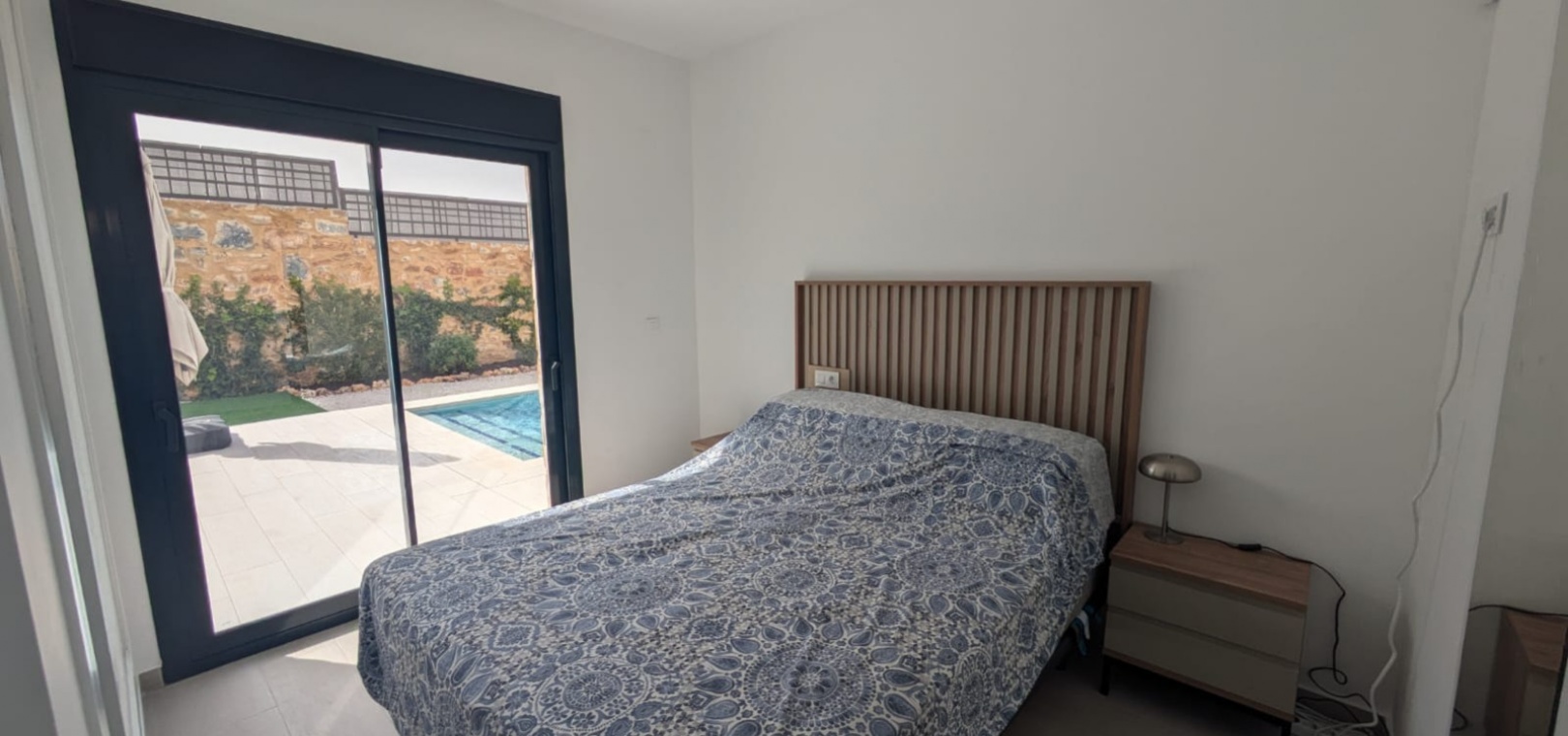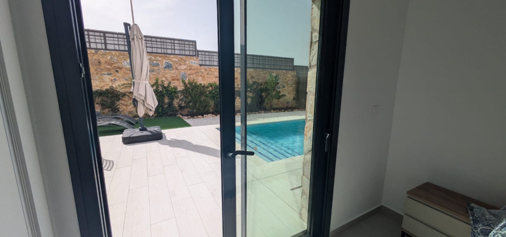 Die geräumige, 120 m² große Villa erstreckt sich über eine Ebene und verfügt über drei Schlafzimmer, zwei Badezimmer (eines davon ensuite), ein geräumiges Wohn-/Esszimmer, eine moderne offene Küche und einen Abstellraum. Ein weiterer Vorteil dieser Immobilie ist der Blick auf den Garten und den Pool von jedem Zimmer der Villa aus.