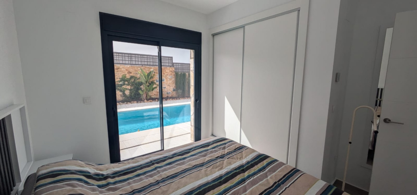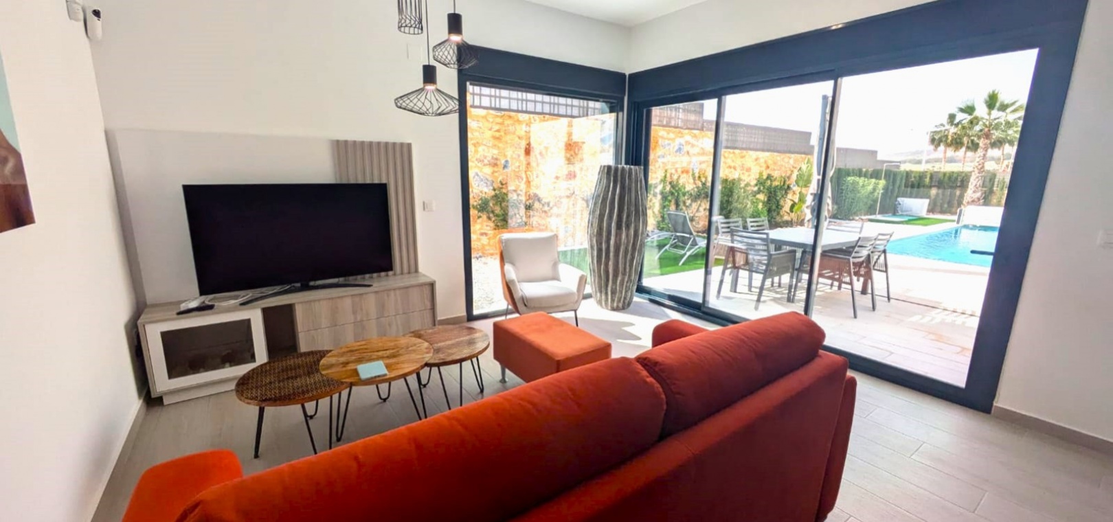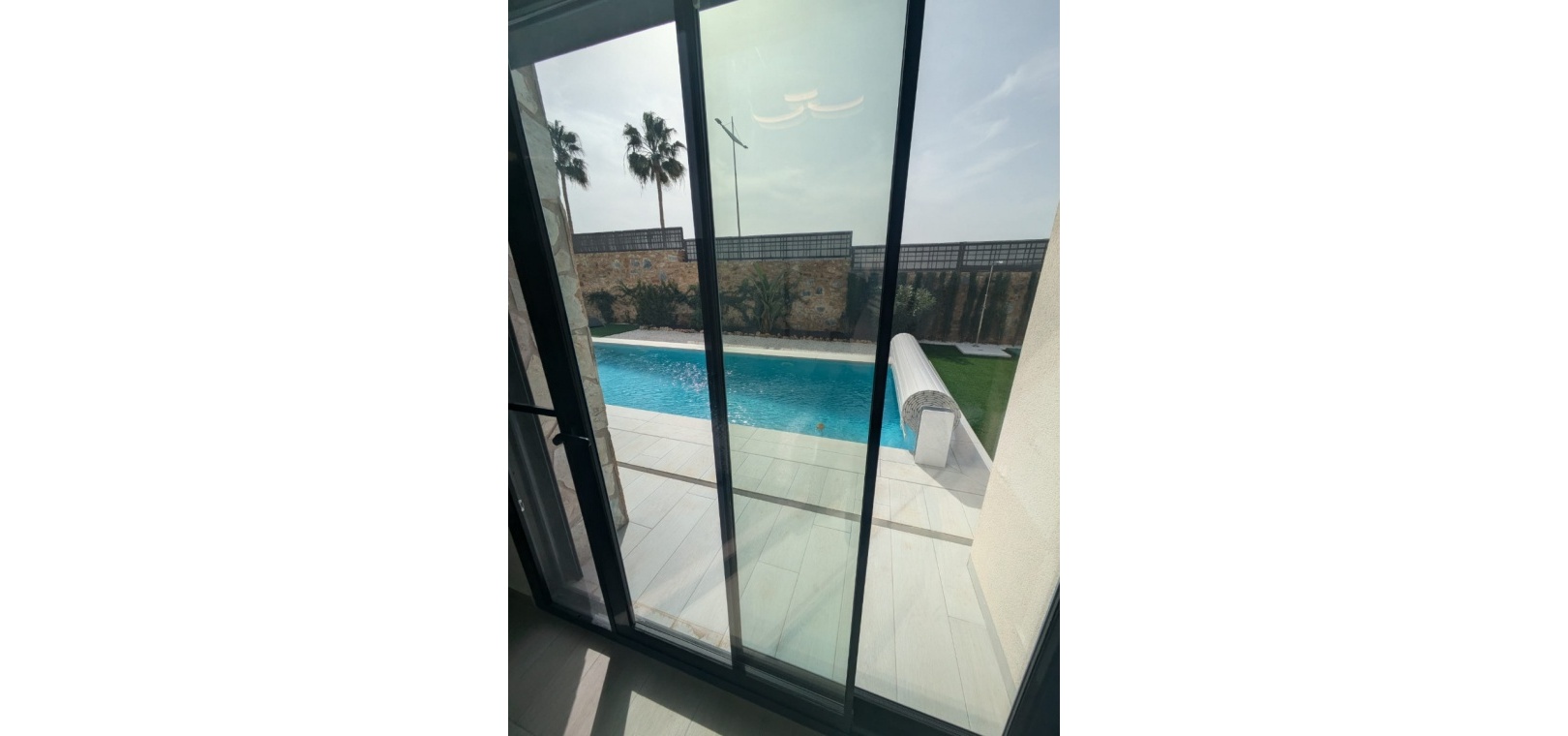 Die geräumige, 120 m² große Villa erstreckt sich über eine Ebene und verfügt über drei Schlafzimmer, zwei Badezimmer (eines davon ensuite), ein geräumiges Wohn-/Esszimmer, eine moderne offene Küche und einen Abstellraum. Ein weiterer Vorteil dieser Immobilie ist der Blick auf den Garten und den Pool von jedem Zimmer der Villa aus.