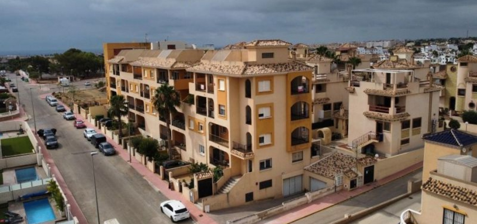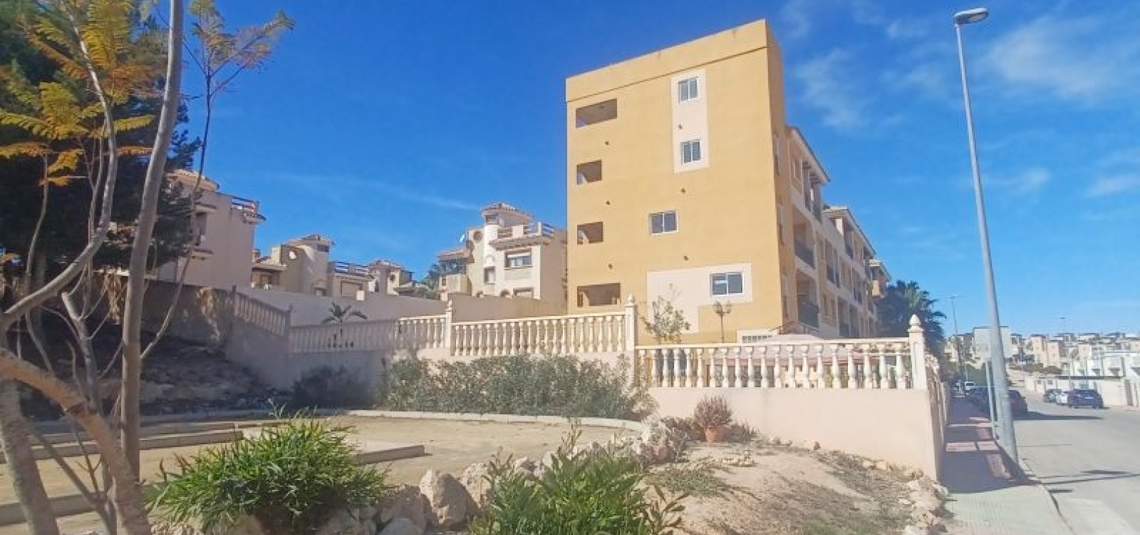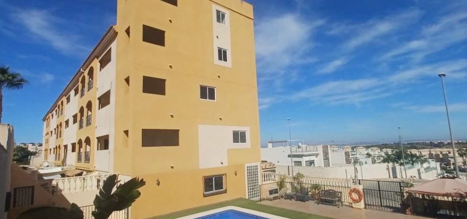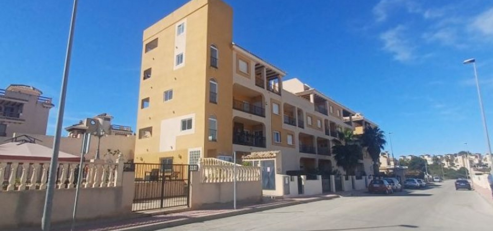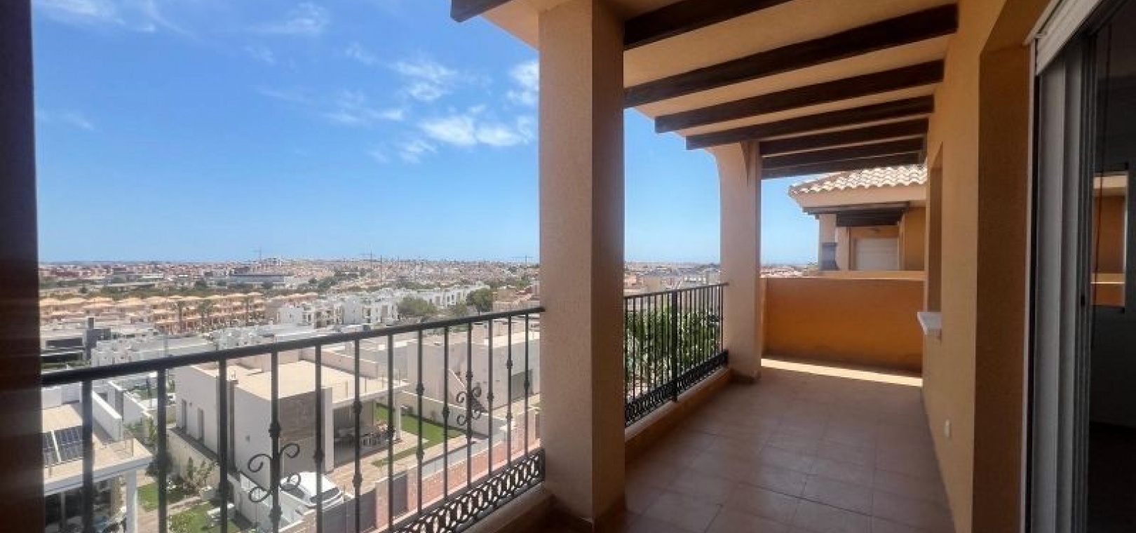 GERÄUMIGES PENTHOUSE MIT TERRASSE UND PRIVATEM SOLARIUM MIT AUSSICHT UND POOL EINFACHE MÖGLICHKEIT ZUR ERWEITERUNG AUF 3 SCHLAFZIMMER Das Hotel liegt in einer ruhigen Wohngegend, neben einer geschützten Grünfläche, 1 km von Dienstleistungen wie Bushaltestelle, Supermärkten wie ALDI, Consum, ..., 2 km vom Golfplatz Villamartin und 5 km von den Stränden von Orihuela Costa, wie Punta Prima, Playa Flamenca, La Zenia, ... entfernt. Das Haus ist ein Penthouse im dritten Stock und verfügt über einen Aufzug. Das geräumige, quadratisch gestaltete Wohnzimmer bietet Zugang zu einer Terrasse mit freiem Blick auf das Meer und die Grünflächen. Es verfügt über ein zusätzliches Zimmer, das leicht in ein drittes Schlafzimmer oder ein separates Arbeitszimmer umgewandelt werden kann. Gemeinschaftspool. Sehr wenig genutzt.