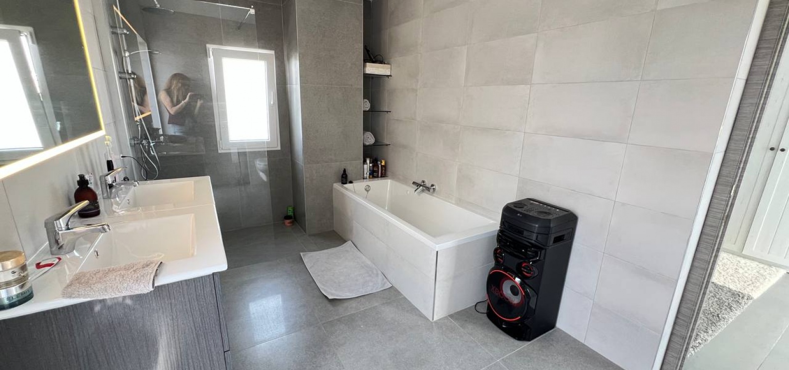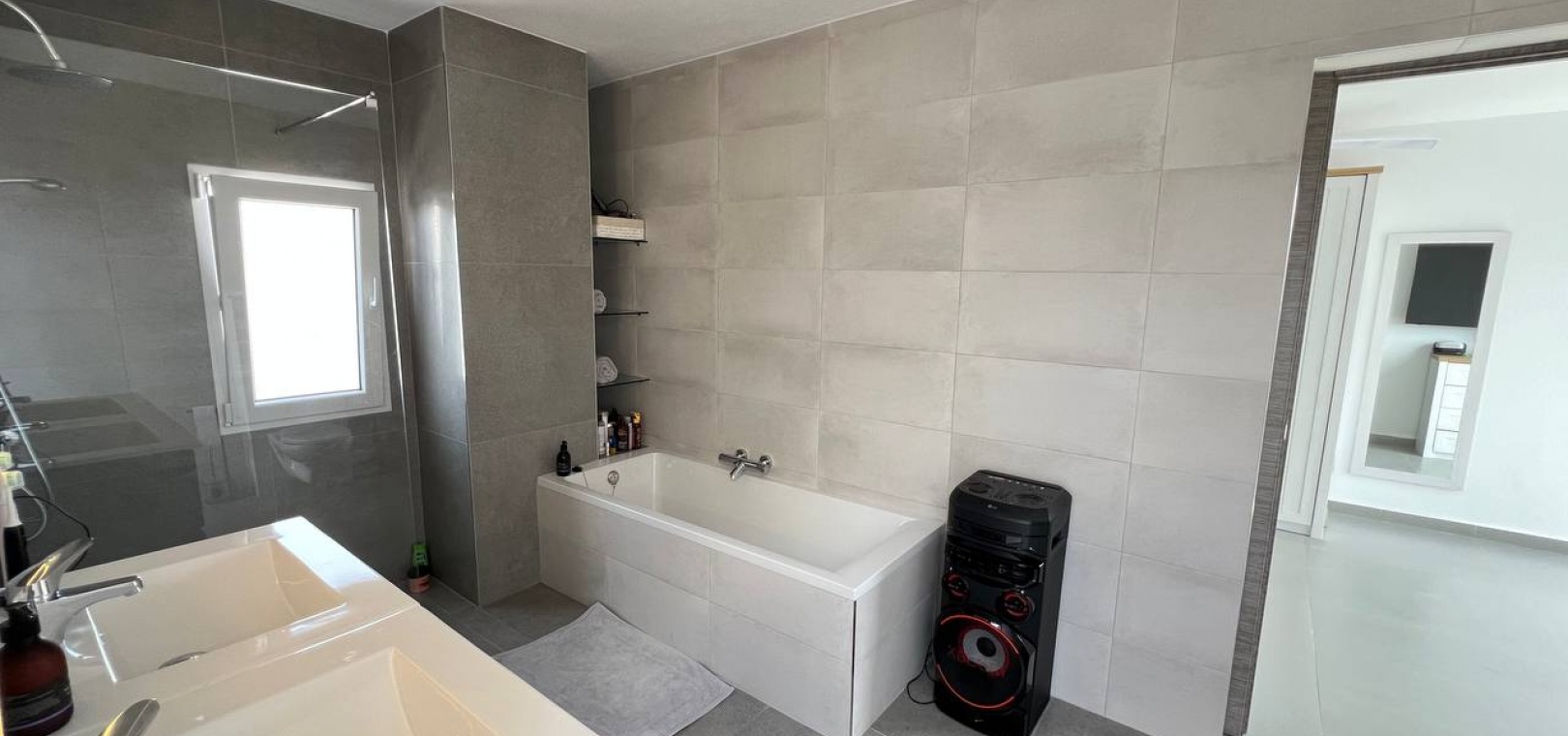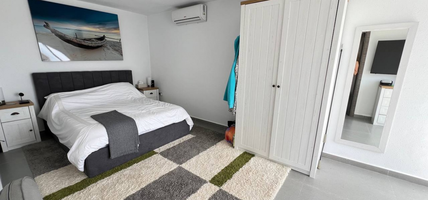 Im ersten Stock gibt es ein Wohn-/Esszimmer mit Klimaanlage (warm/kalt), einem Deckenventilator und Türen zum Balkon im 1. Stock, eine offene, neu eingerichtete Küche mit einer Kochinsel, 1 Doppelzimmer mit eigenem Bad und Türen zum Balkon im 1. Stock, 2 Doppelzimmer und 1 neu eingerichtetes Duschbad.