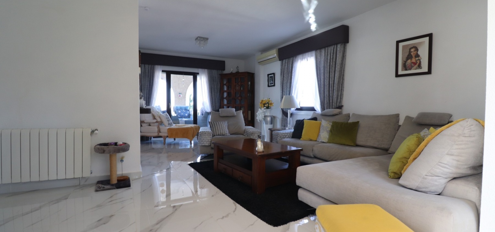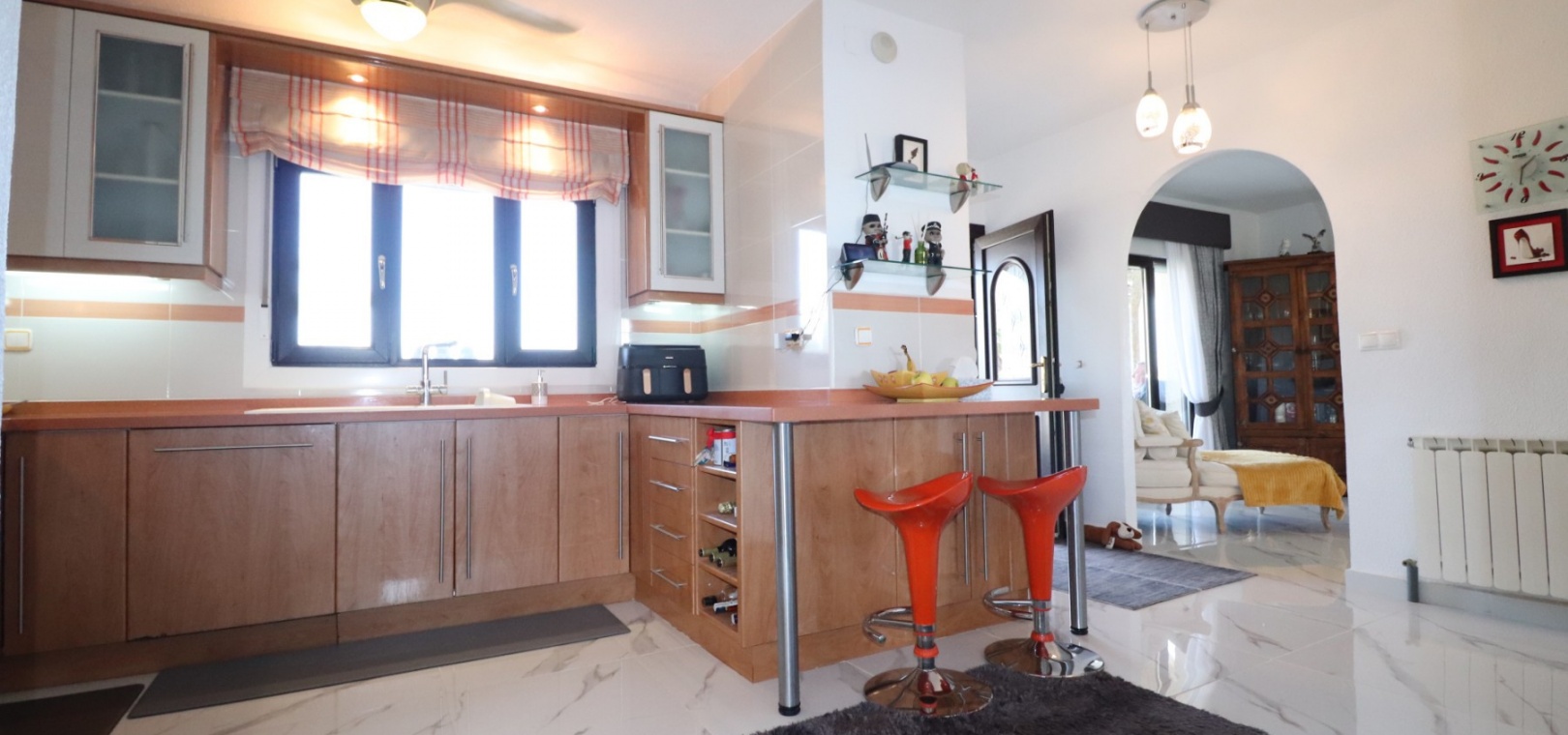 Das Anwesen liegt auf einem großzügigen Grundstück von 1.149 m² und verfügt über eine Wohnfläche von 375 m². Es verbindet moderne Elemente mit zeitlosem Charakter und Charme. Die Hauptvilla verfügt über drei Schlafzimmer und drei Badezimmer , die alle sorgfältig und hochwertig renoviert wurden. Beim Betreten des Hauses empfängt Sie ein heller Flur, der zu einer offenen, voll ausgestatteten Küche mit Frühstücksbar, einem geräumigen Wohnzimmer mit gemütlichem Kamin und direktem Zugang zu einer großen überdachten Terrasse führt – dem perfekten Aussichtspunkt für einen herrlichen Blick auf die Landschaft, die Berge und den Sonnenuntergang.