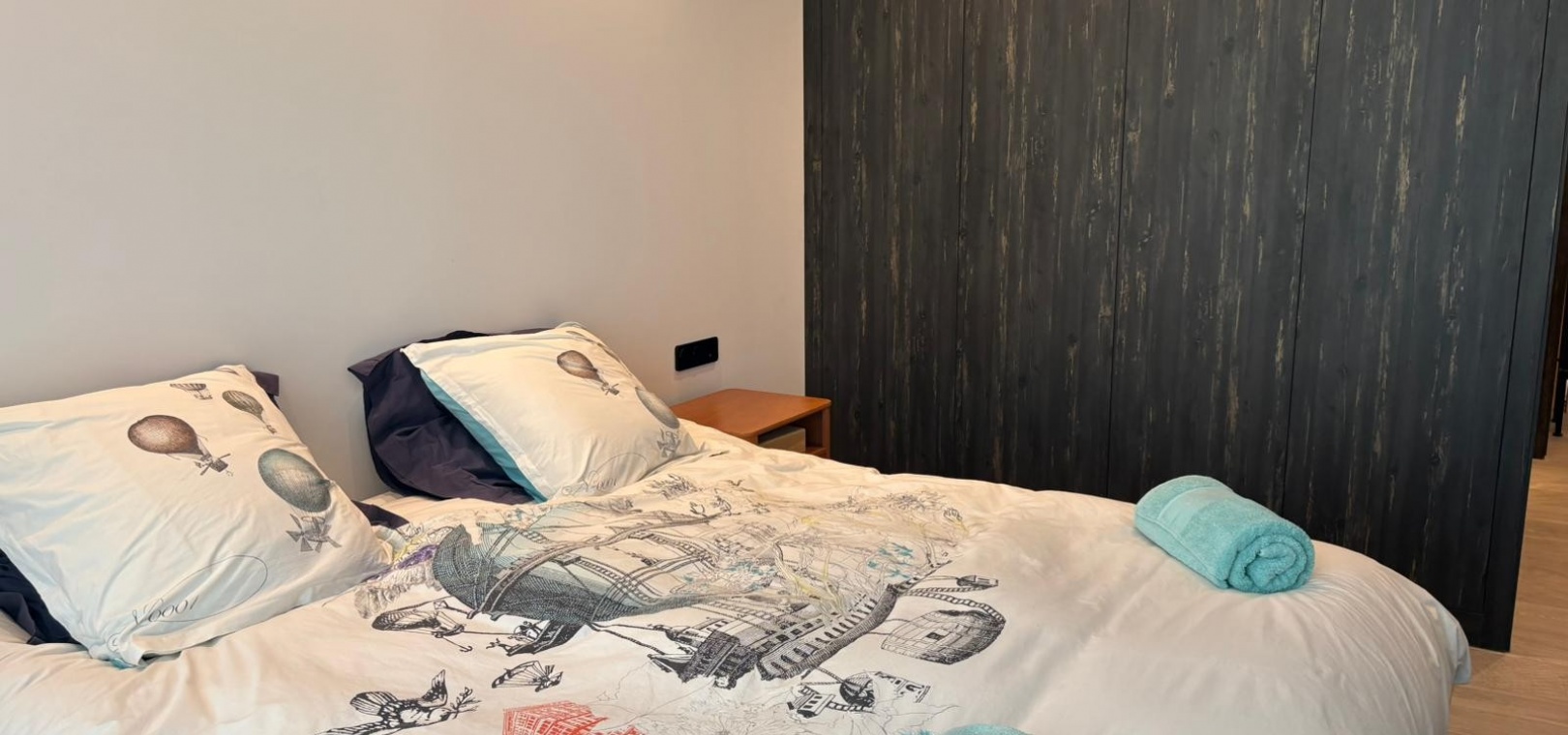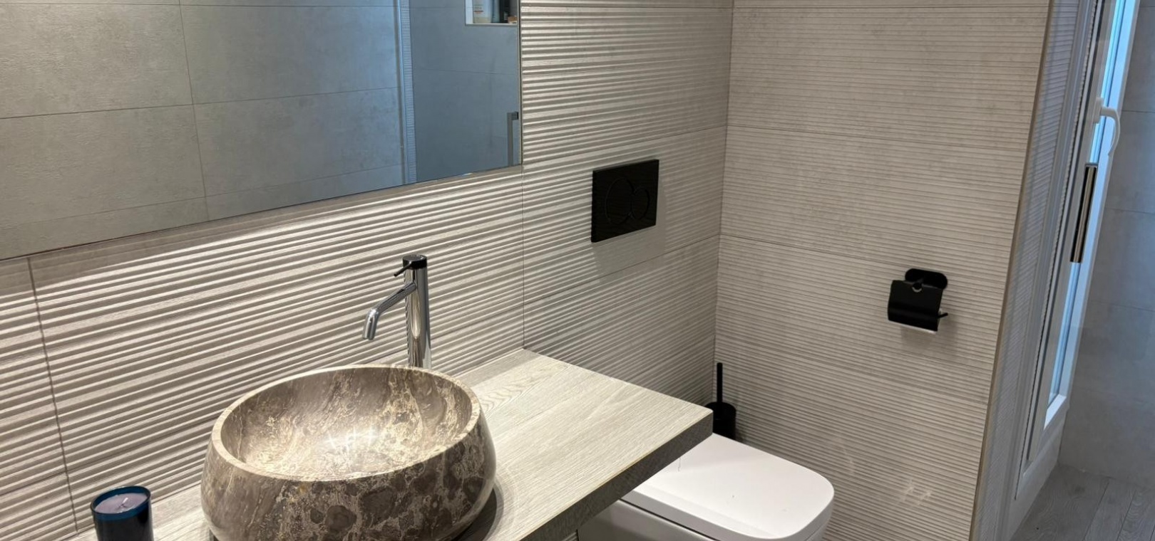 Das Haus verfügt über zwei geräumige Schlafzimmer, zwei elegante Badezimmer mit Fußbodenheizung, ein Gäste-WC und einen hellen, offenen Wohnbereich. Ein dritter Raum wird derzeit als Ankleidezimmer/Büro genutzt, kann aber problemlos in ein zusätzliches Schlafzimmer umgewandelt werden.