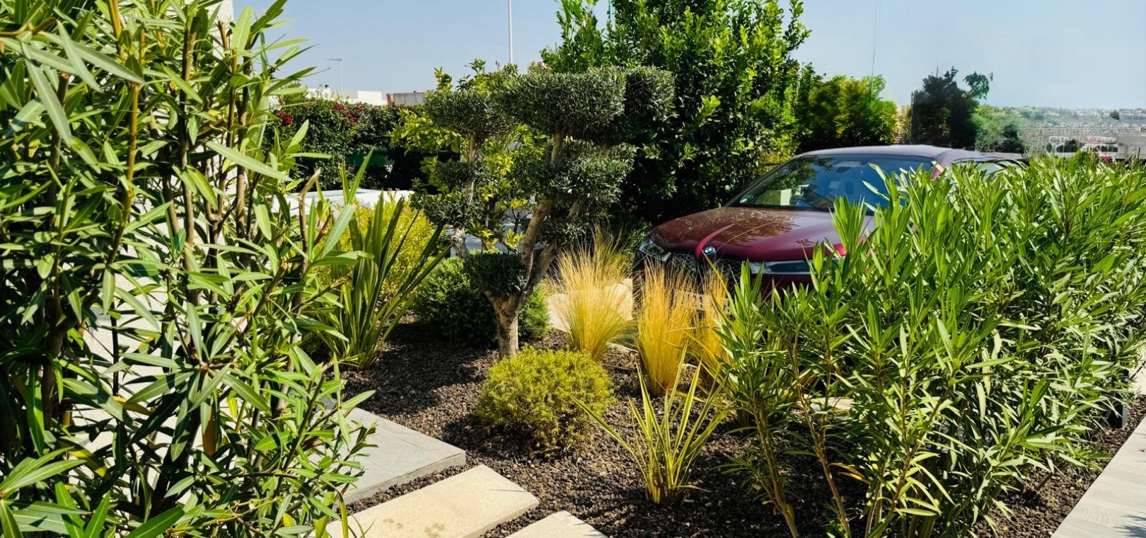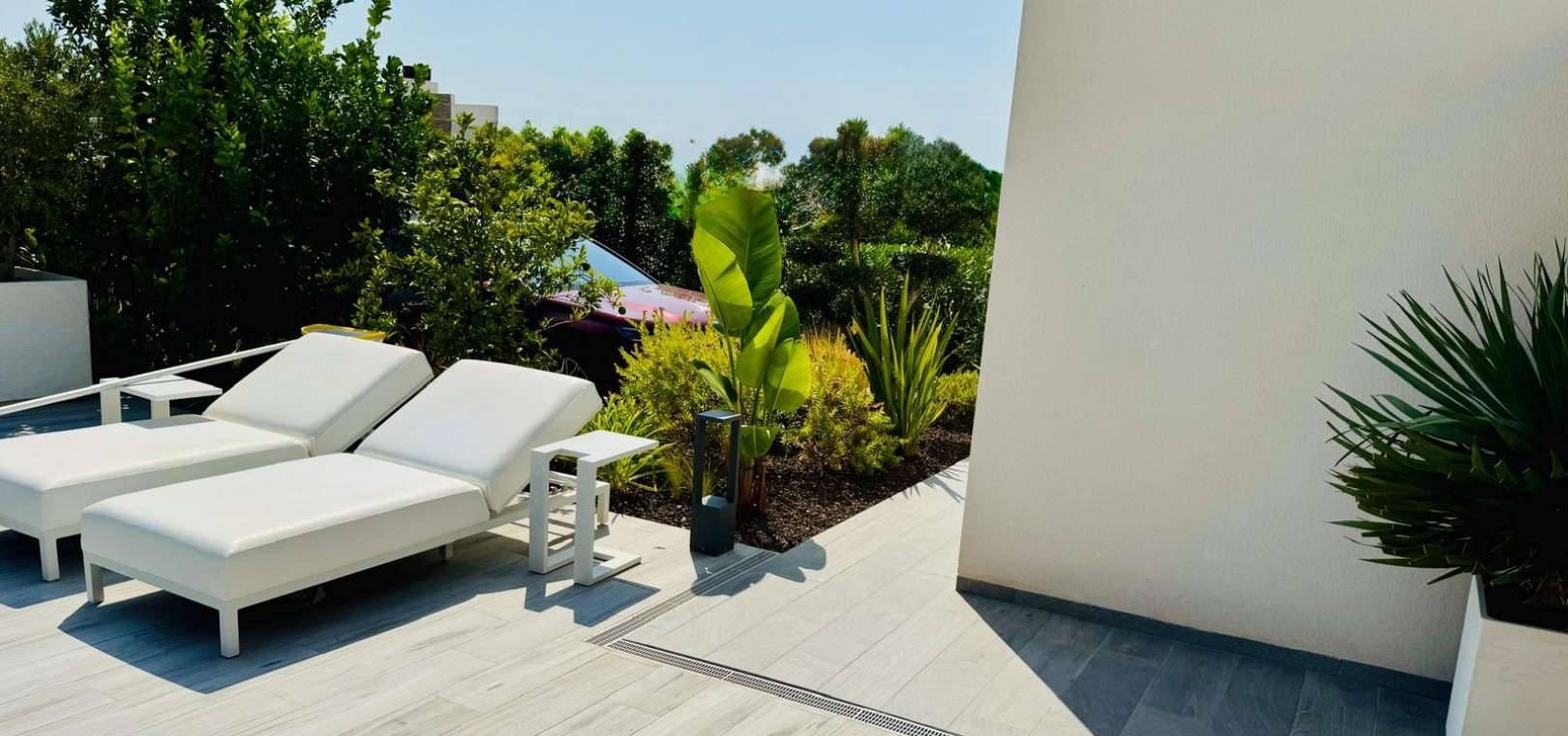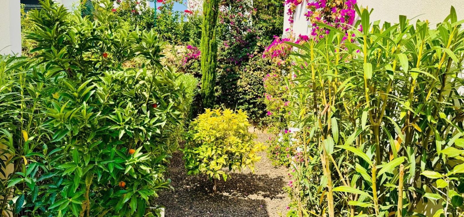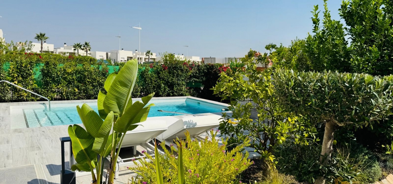 Der wunderschön angelegte Garten mit Palmen, Blumen und Obstbäumen bietet Privatsphäre und Komfort. Eine nach Osten ausgerichtete Terrasse mit eingebautem Grill lädt zum Essen im Freien ein, während der private Pool mit breiten Einstiegsstufen zum Entspannen einlädt. Den Bewohnern steht außerdem ein großer Gemeinschaftspool innerhalb des Resorts zur Verfügung.