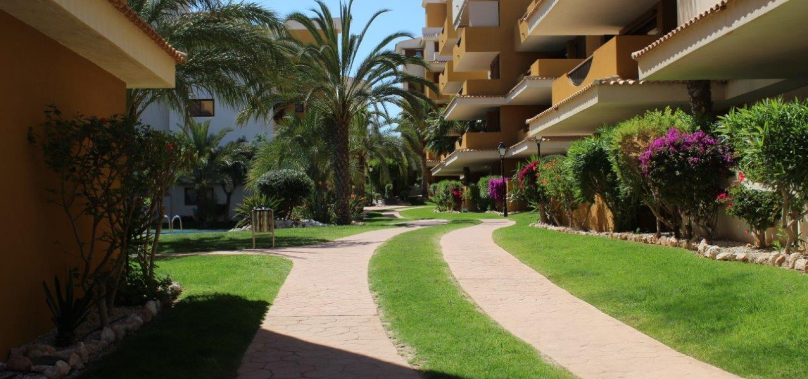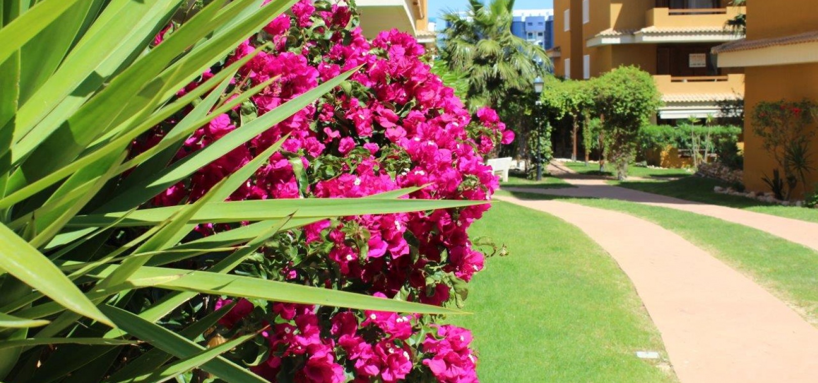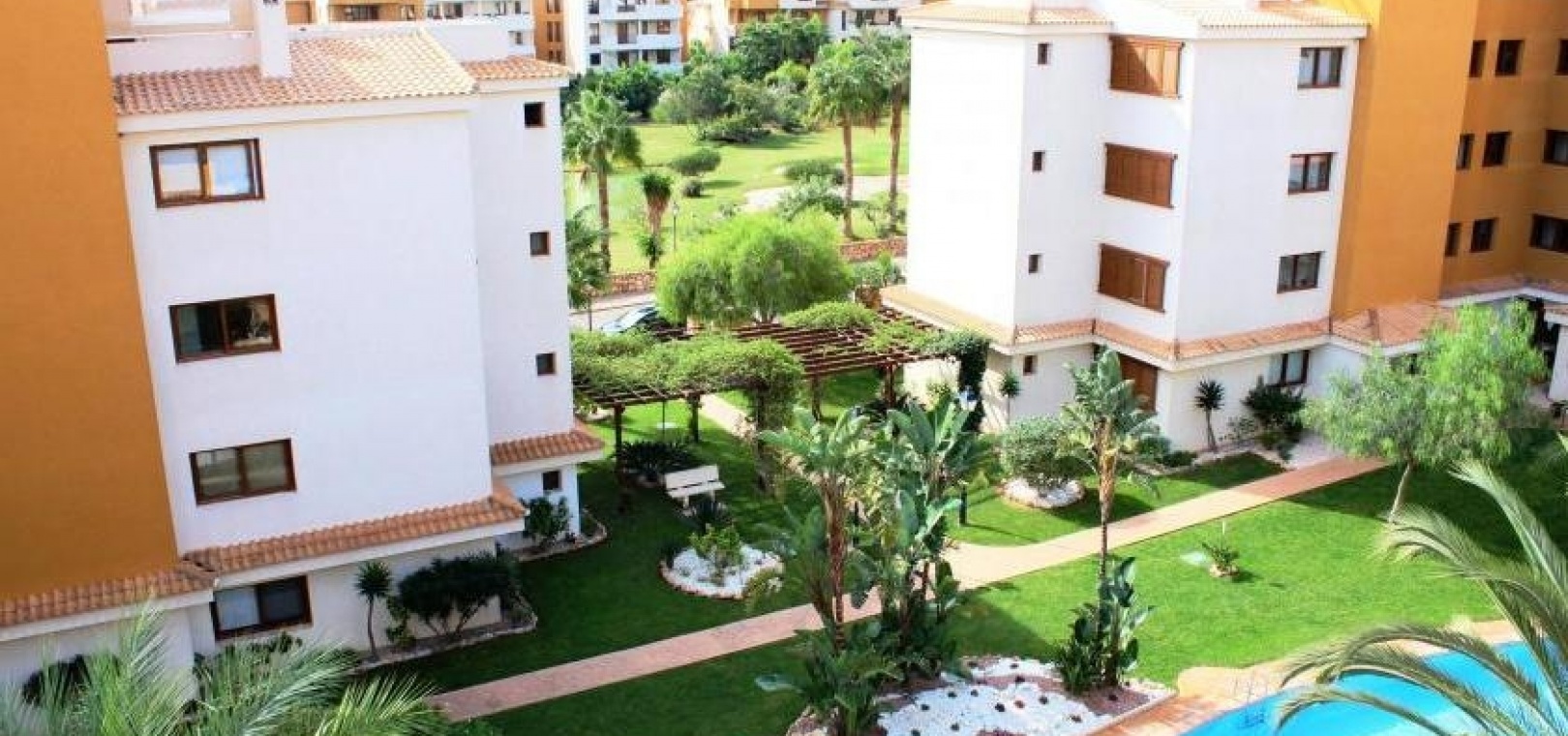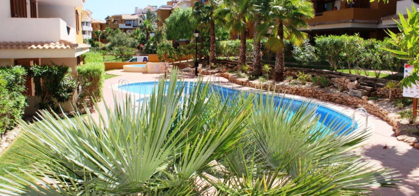 Der Komplex La Entrada bietet große Grünflächen, mehrere Gemeinschaftspools und liegt nur wenige Meter vom Strand entfernt.