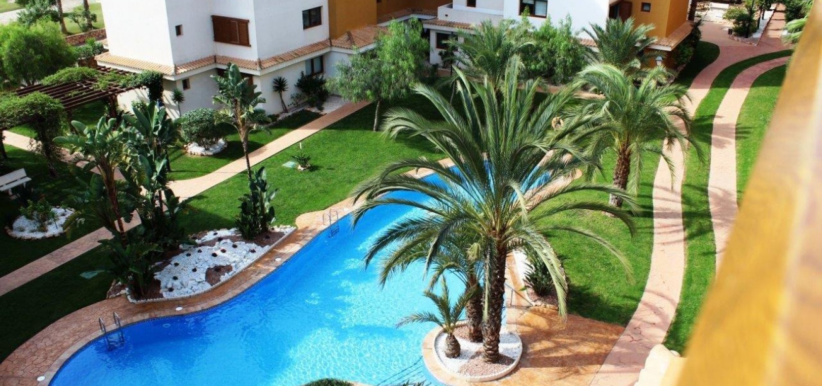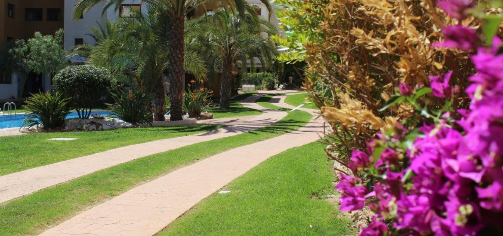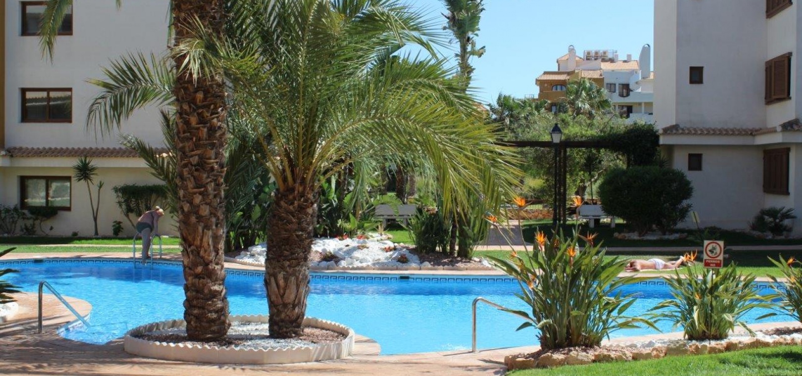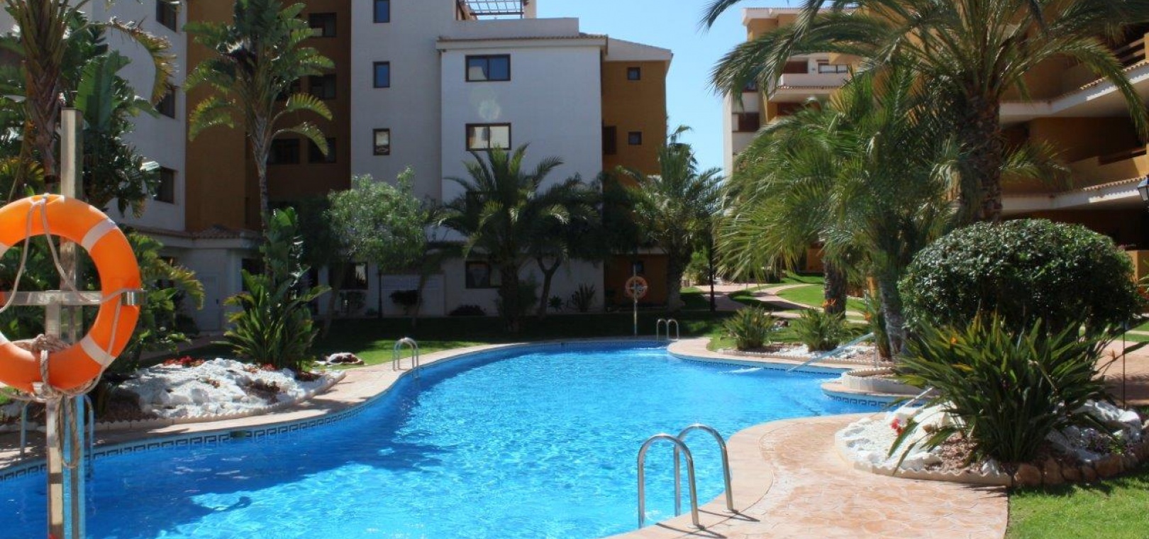 Der Komplex La Entrada bietet große Grünflächen, mehrere Gemeinschaftspools und liegt nur wenige Meter vom Strand entfernt.