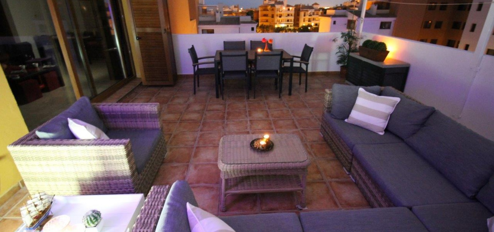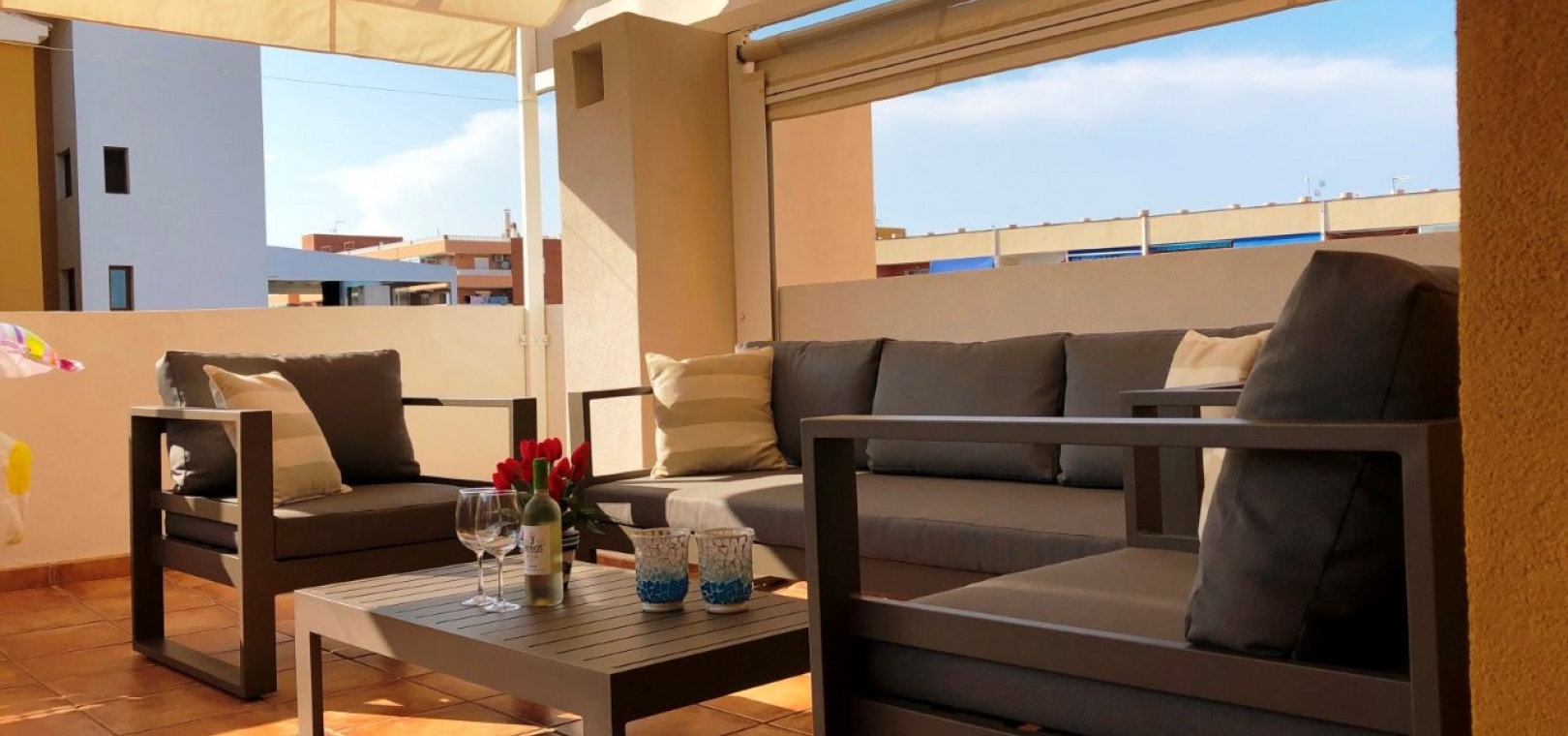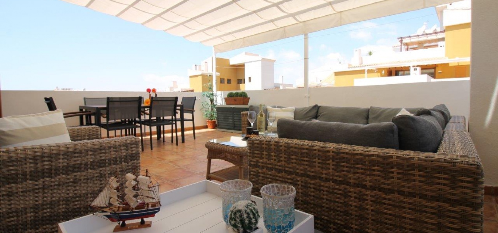 Ein Highlight ist die große private Dachterrasse mit Sonnenmarkise, die sich perfekt zum Leben im Freien eignet. Das Penthouse wird teilmöbliert verkauft und verfügt über eine zentrale Klimaanlage, eine Garage und einen Abstellraum.