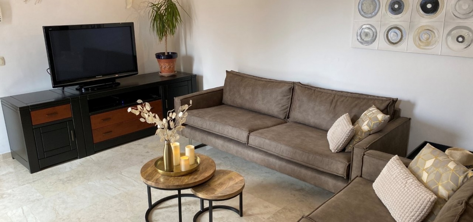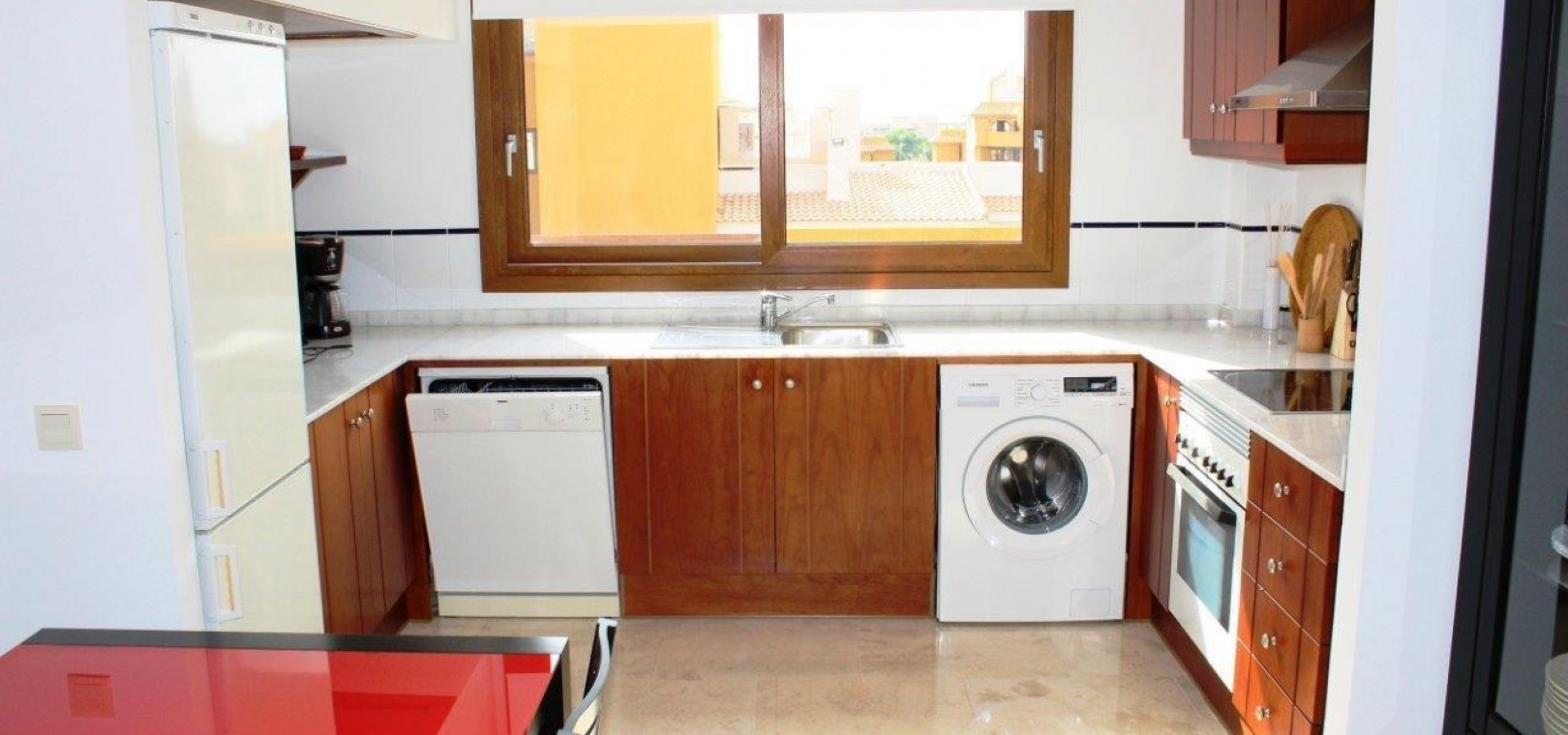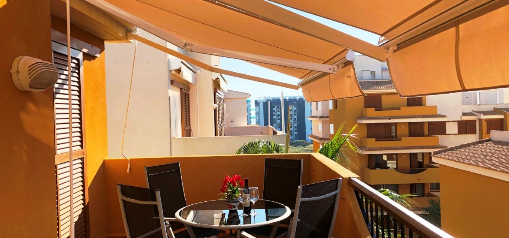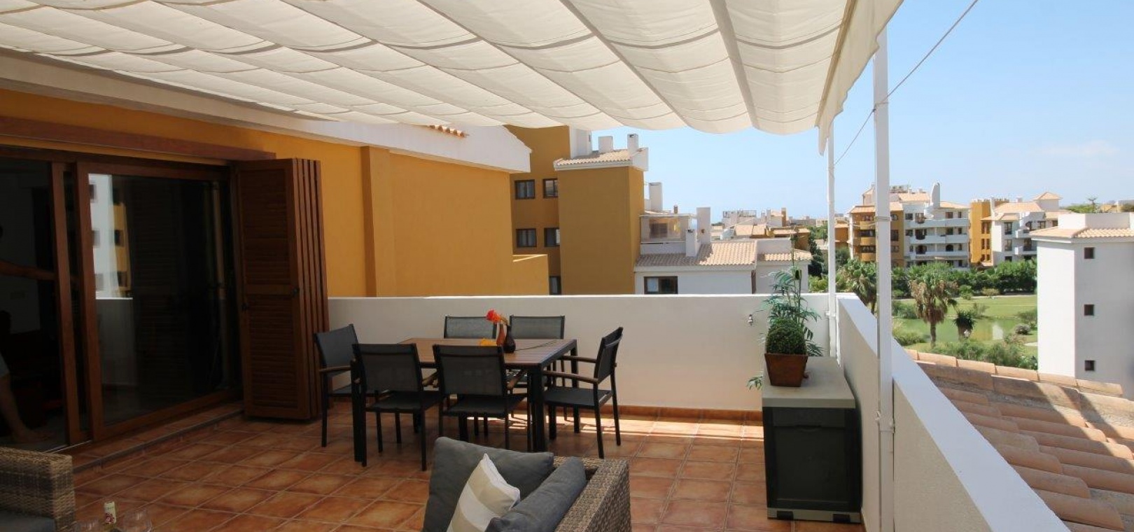 Ein Highlight ist die große private Dachterrasse mit Sonnenmarkise, die sich perfekt zum Leben im Freien eignet. Das Penthouse wird teilmöbliert verkauft und verfügt über eine zentrale Klimaanlage, eine Garage und einen Abstellraum.