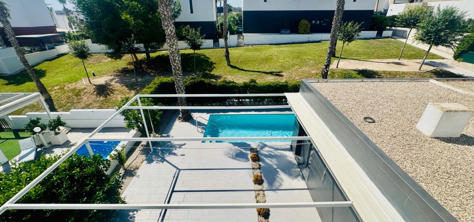 Einstöckige Villa mit 70 m² auf einem 250 m² großen Privatgrundstück Privater Pool und angelegter Garten Helles Wohn-Esszimmer mit direktem Terrassenzugang Voll ausgestattete offene Küche 2 Doppelschlafzimmer mit Einbauschränken 2 komplette Badezimmer mit Glasduschwänden Klimaanlage im Wohnzimmer und Hauptschlafzimmer Große Terrasse mit Chill-out-Lounge und Essbereich im Freien Zugang zum Gemeinschaftspool zusätzlich zum privaten Pool