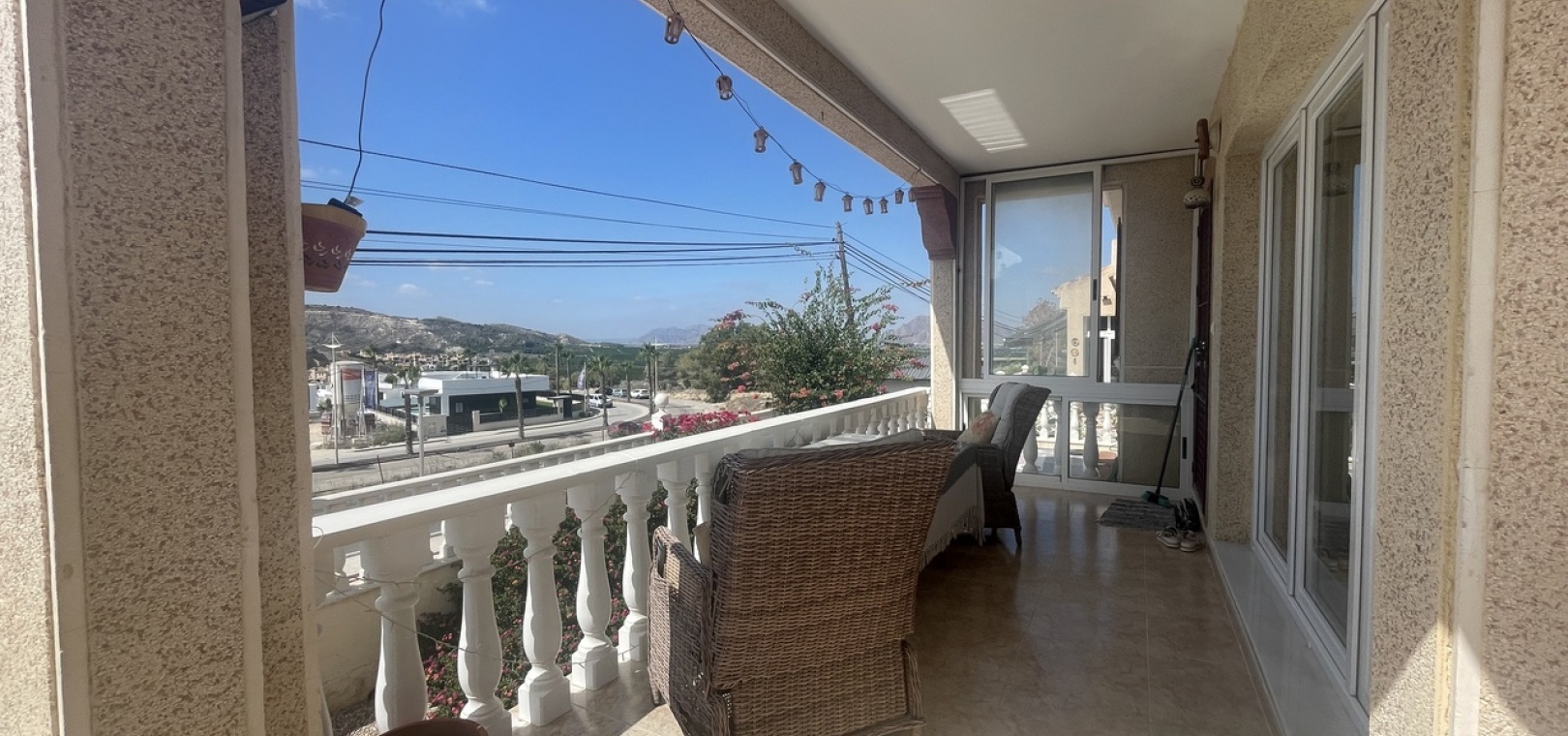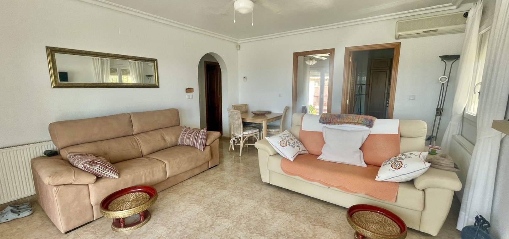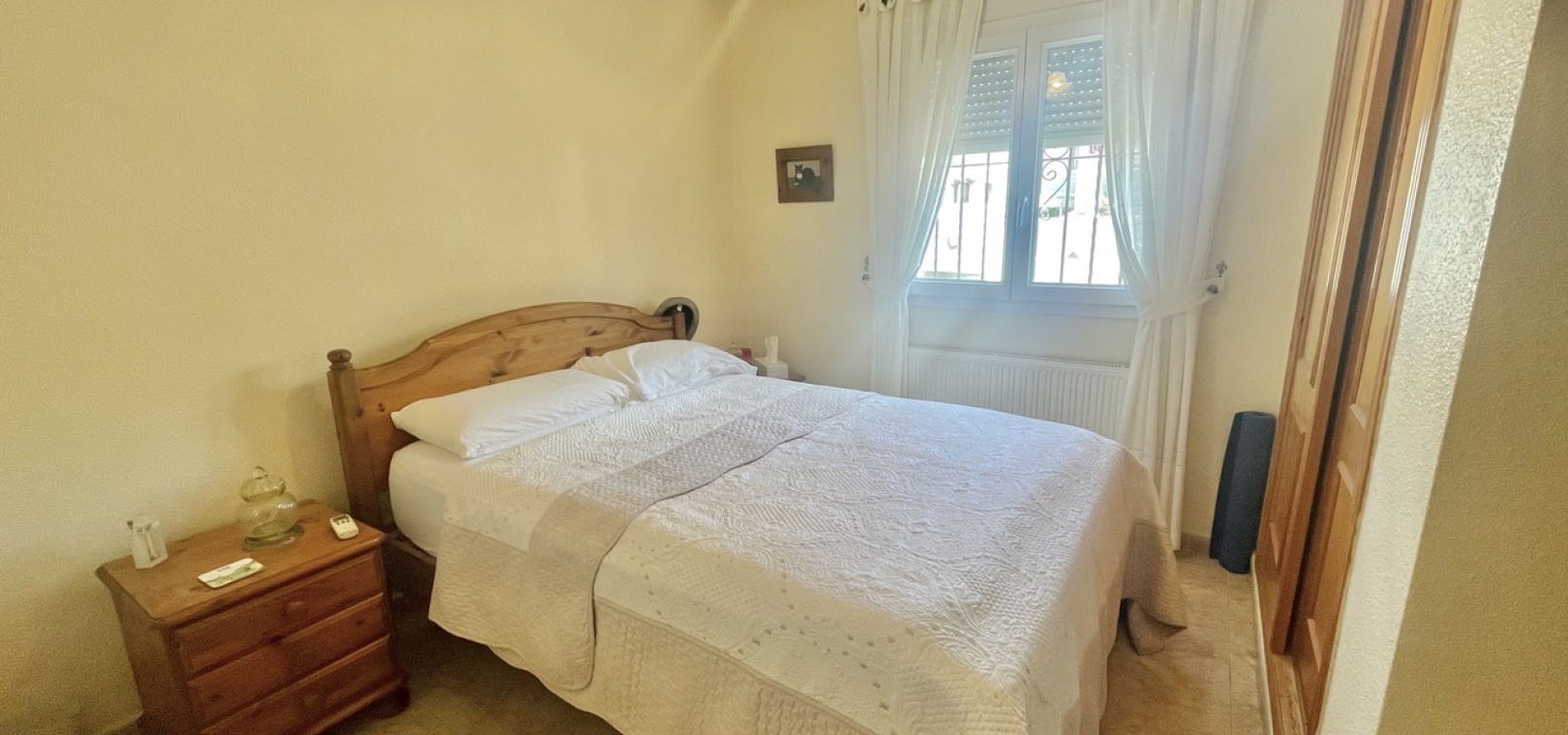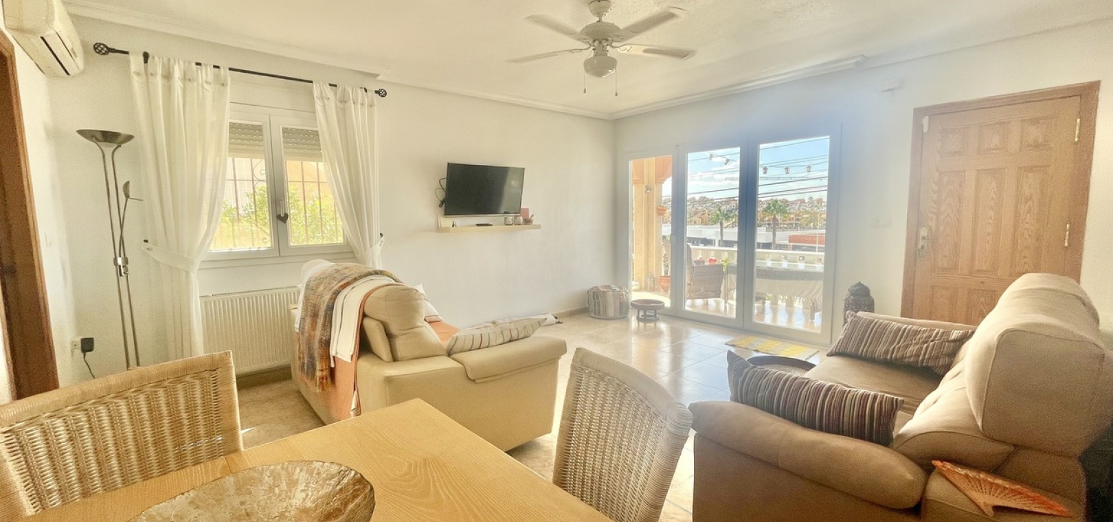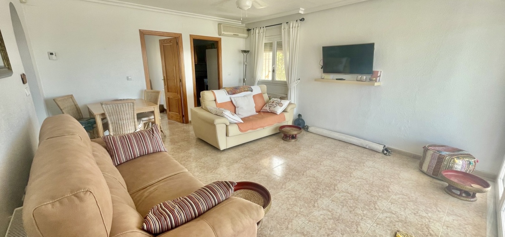 Im Inneren verfügt das Haus über ein geräumiges Wohnzimmer mit Falttüren, eine separate, voll ausgestattete Küche und drei gut proportionierte Schlafzimmer, darunter ein Hauptschlafzimmer mit eigenem Bad. Weitere Highlights sind Klimaanlage, Zentralheizung, viel Stauraum und ein privates Solarium mit atemberaubendem Blick auf den Callosa-Berg und die umliegende Landschaft.