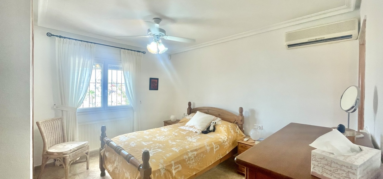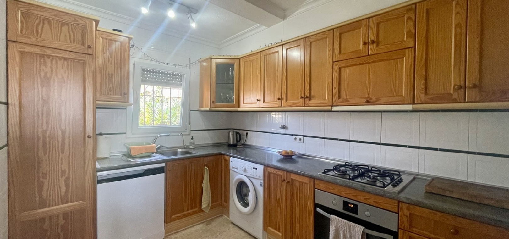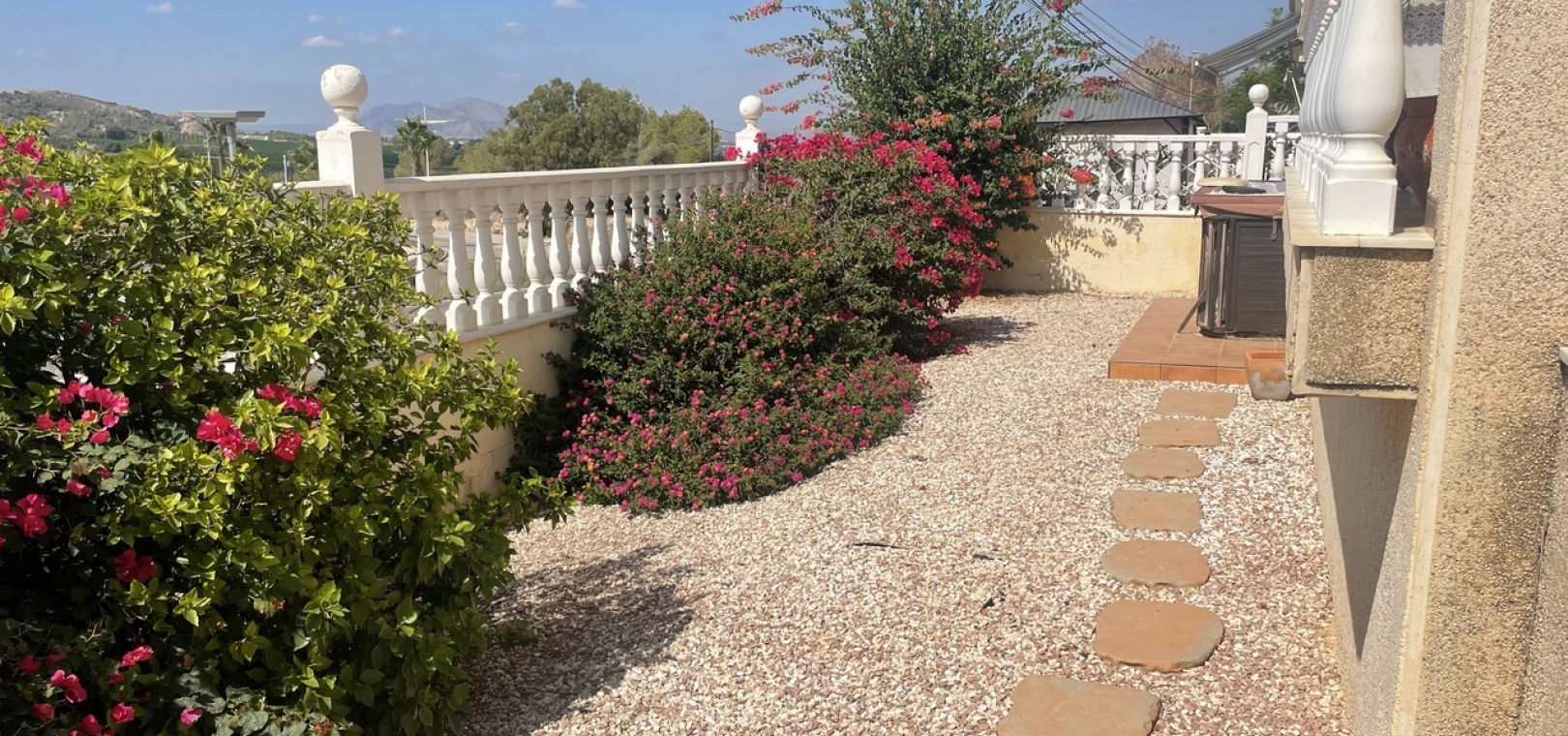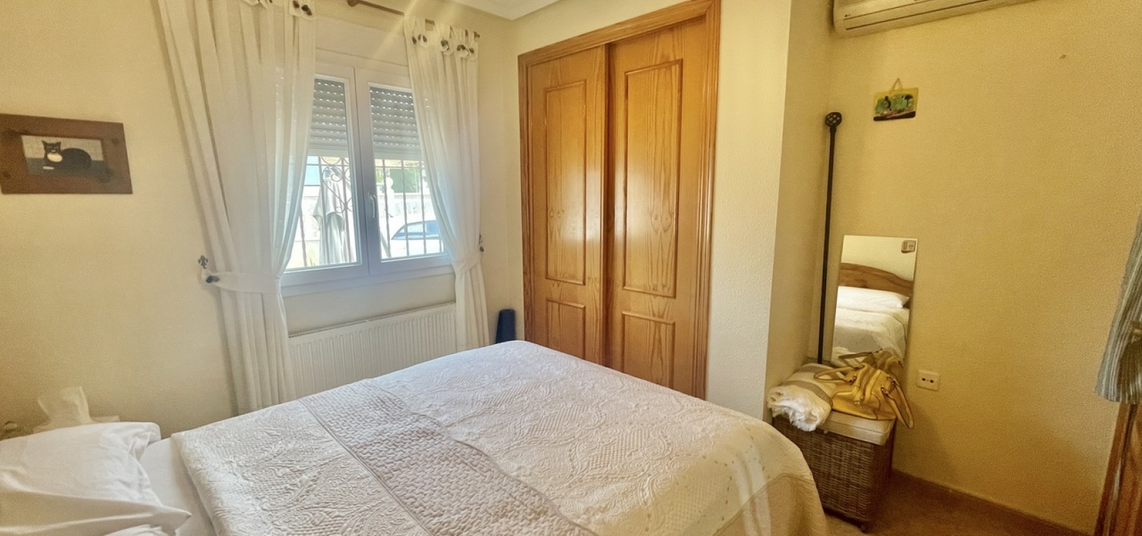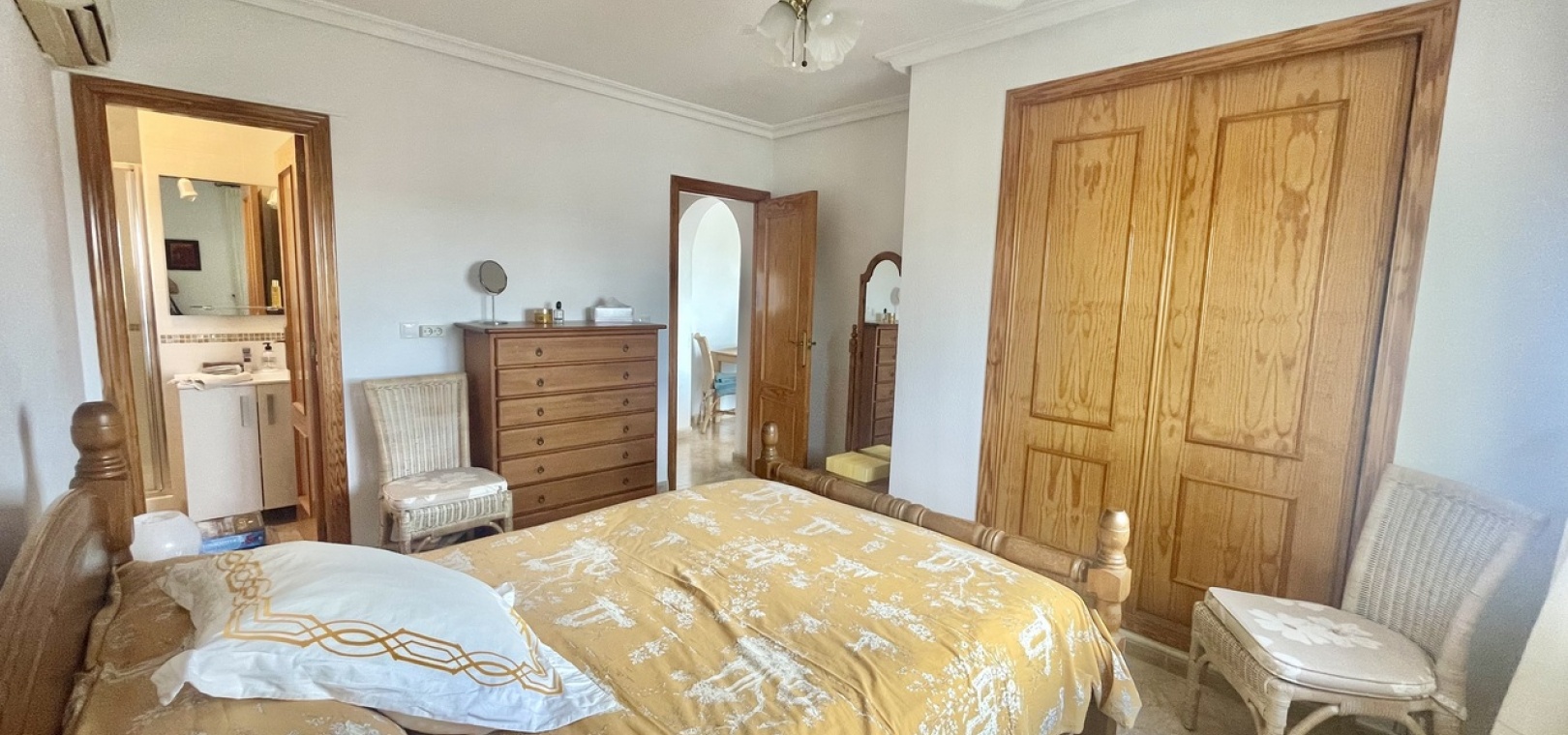 Im Inneren verfügt das Haus über ein geräumiges Wohnzimmer mit Falttüren, eine separate, voll ausgestattete Küche und drei gut proportionierte Schlafzimmer, darunter ein Hauptschlafzimmer mit eigenem Bad. Weitere Highlights sind Klimaanlage, Zentralheizung, viel Stauraum und ein privates Solarium mit atemberaubendem Blick auf den Callosa-Berg und die umliegende Landschaft.