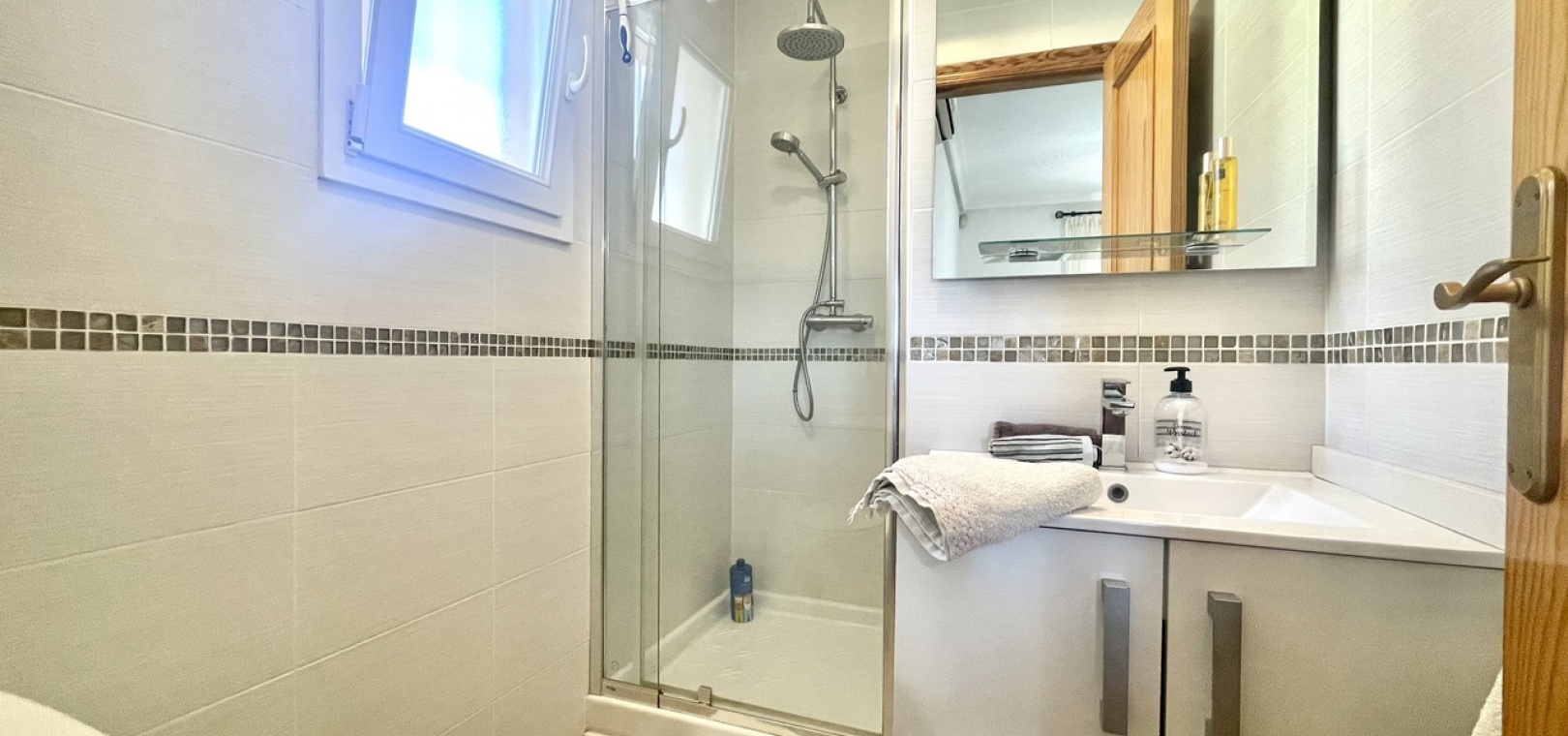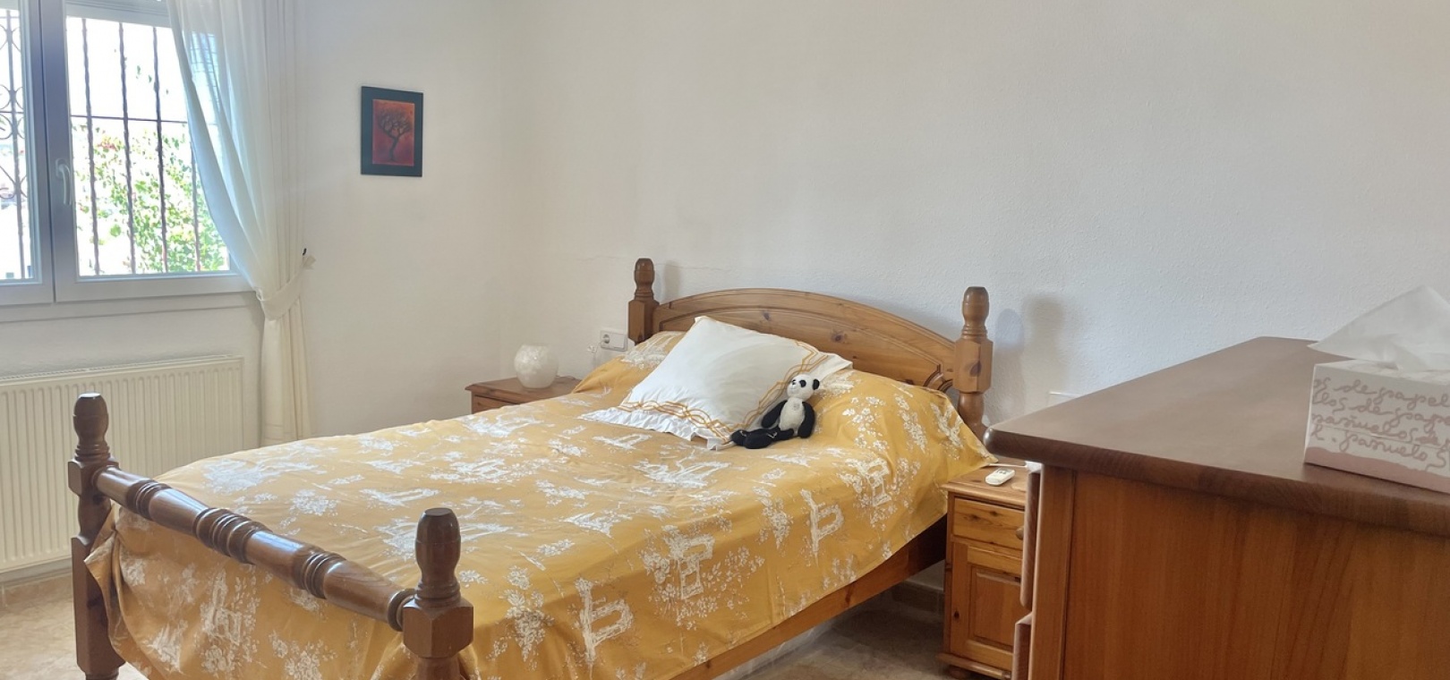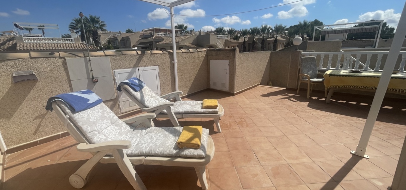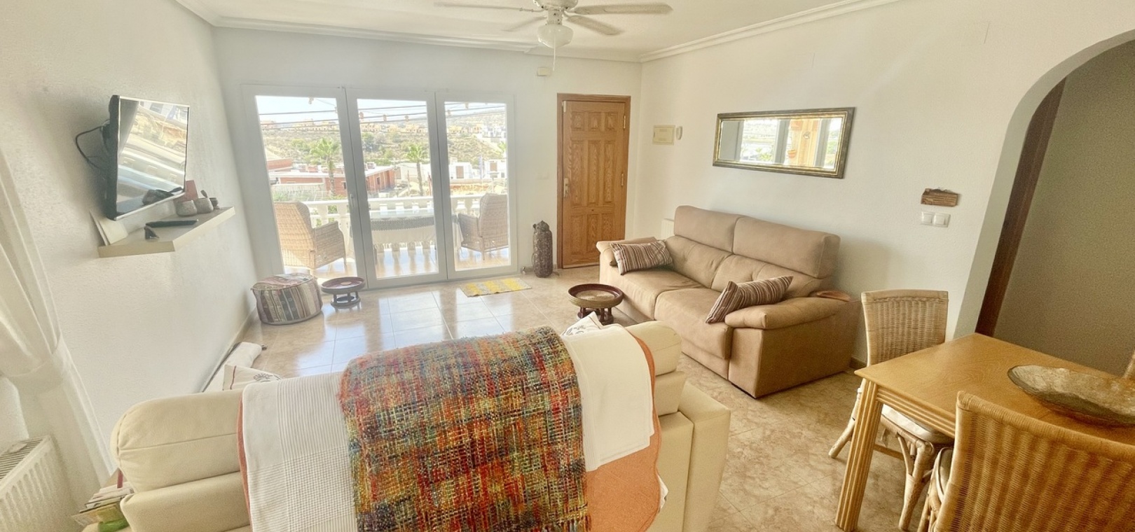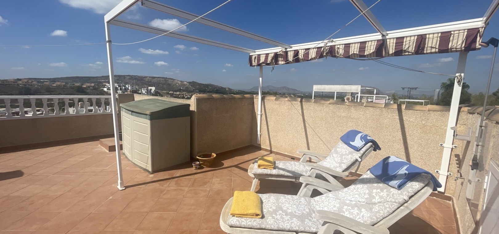 Im Inneren verfügt das Haus über ein geräumiges Wohnzimmer mit Falttüren, eine separate, voll ausgestattete Küche und drei gut proportionierte Schlafzimmer, darunter ein Hauptschlafzimmer mit eigenem Bad. Weitere Highlights sind Klimaanlage, Zentralheizung, viel Stauraum und ein privates Solarium mit atemberaubendem Blick auf den Callosa-Berg und die umliegende Landschaft.