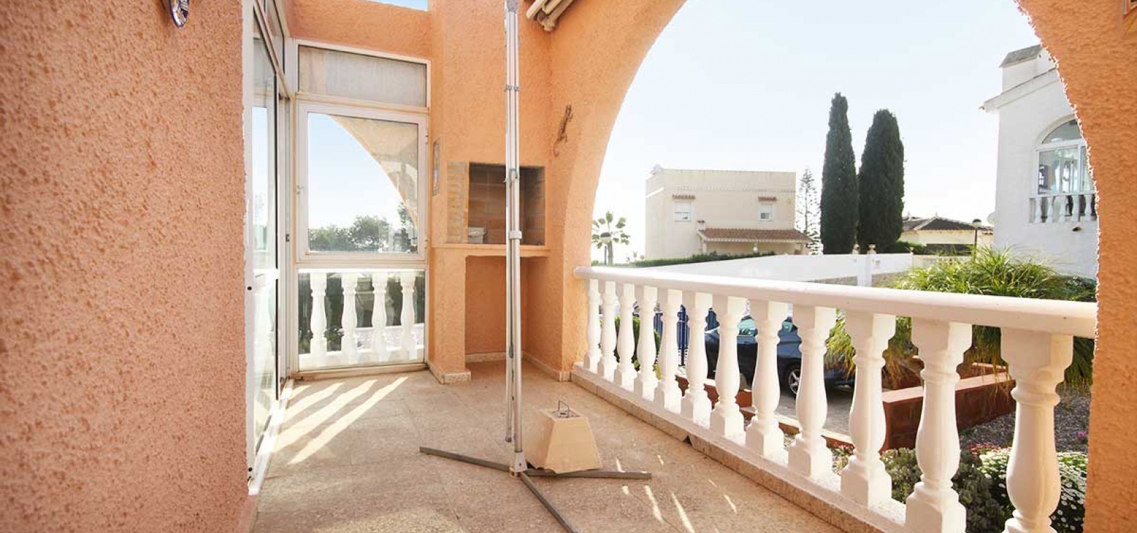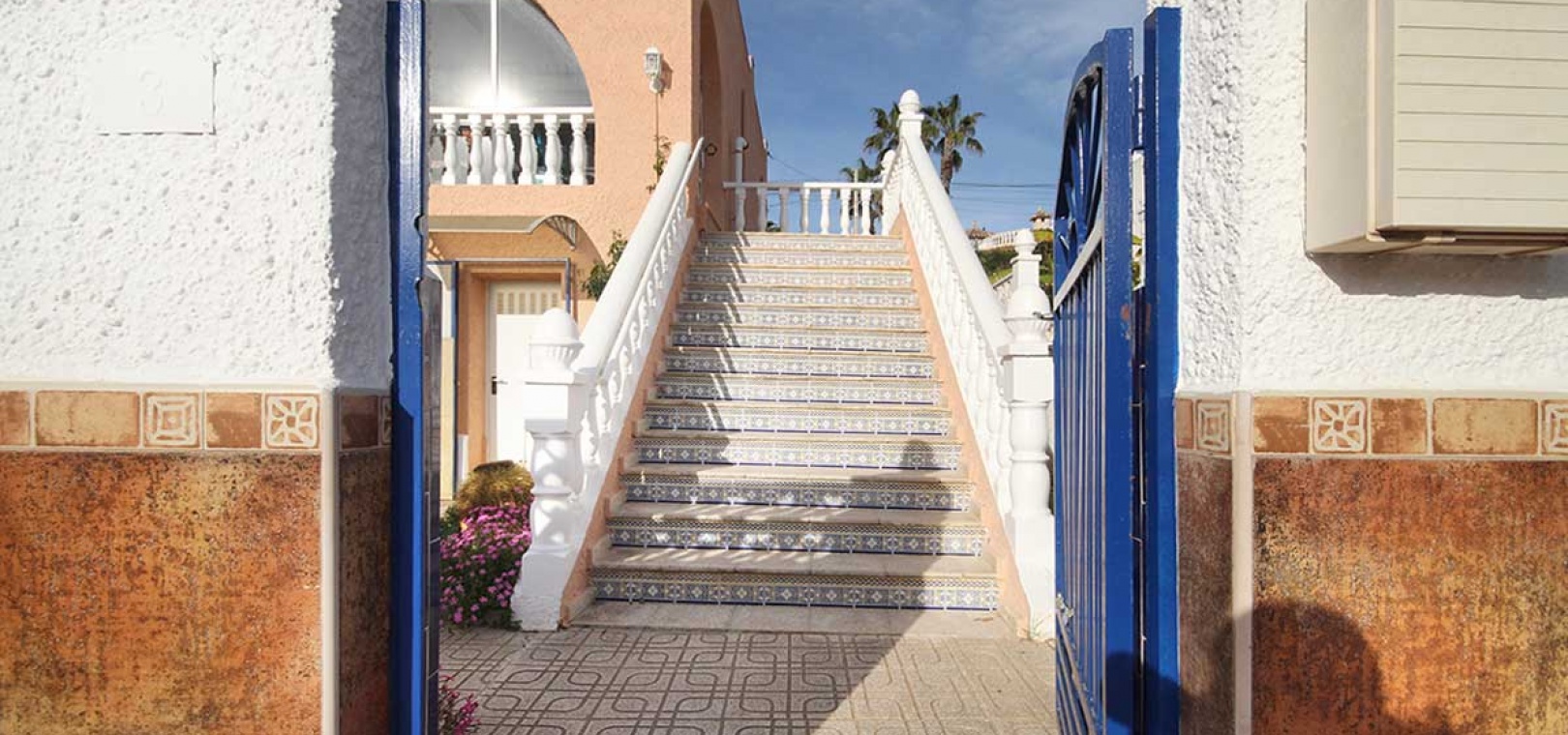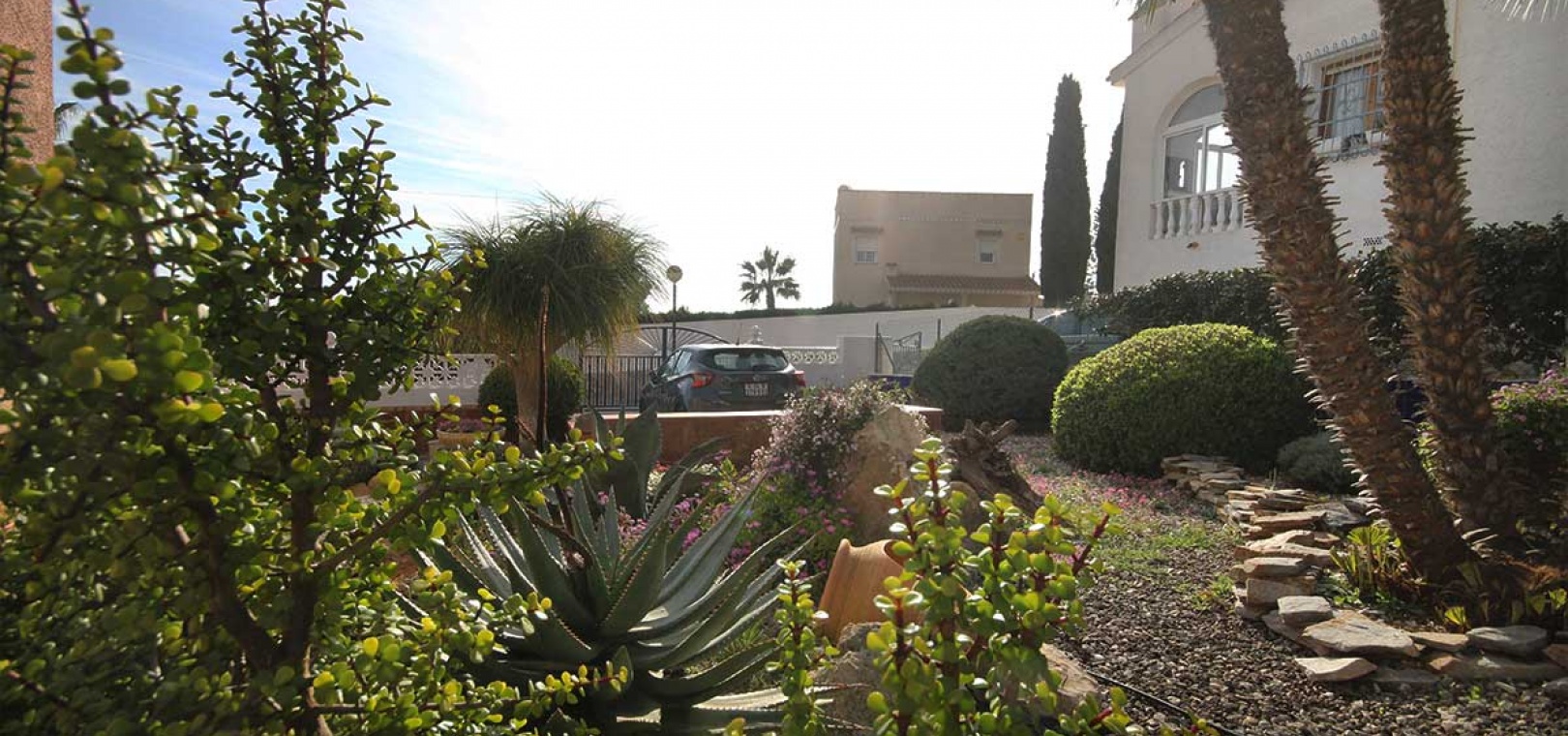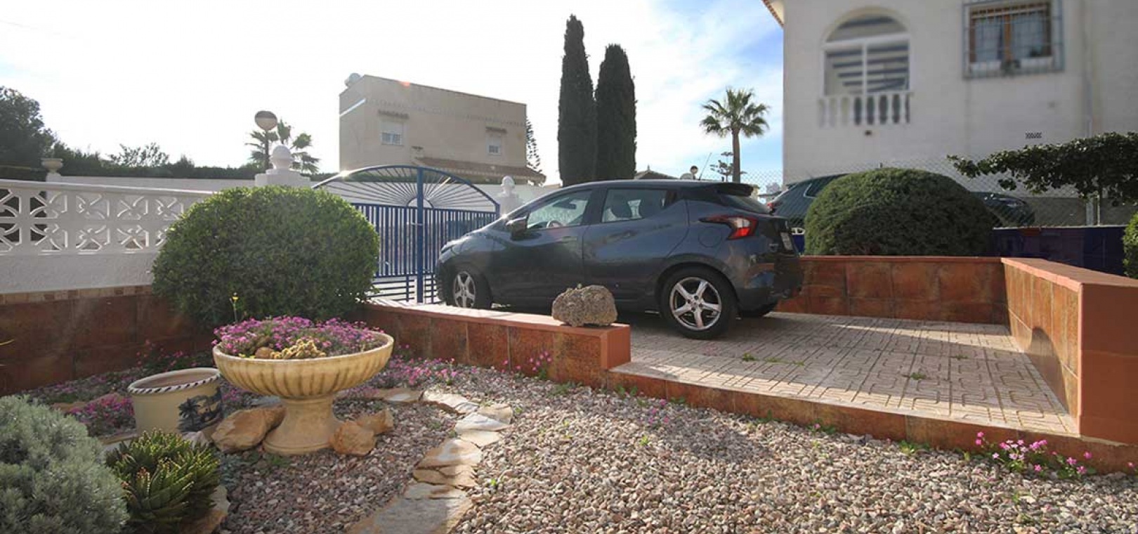 Der Zugang erfolgt über ein Fußgängertor an der Vorder- und Rückseite sowie eine Zufahrt zu einem privaten Parkplatz. Ein Weg vom Haupttor führt zu einer großen Terrasse und einem geschlossenen Wintergarten – ein heller, geräumiger Bereich, der sich ideal zum Entspannen das ganze Jahr über eignet und einen weiten Blick über die Nachbarschaft bietet.
