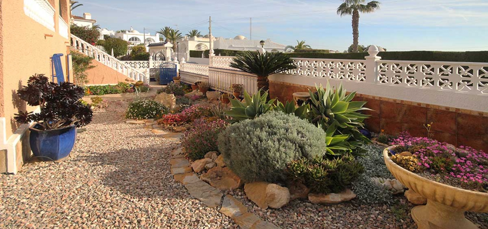 Diese charmante, freistehende Villa mit 2 Schlafzimmern liegt auf einem großzügigen 490 m² großen Grundstück in der ruhigen Wohngegend Blue Lagoon in Villamartin. Umgeben von einem üppigen Garten mit farbenprächtigen Blumen, Sträuchern und Bäumen bietet das Anwesen Privatsphäre, viel Platz und großes Potenzial.