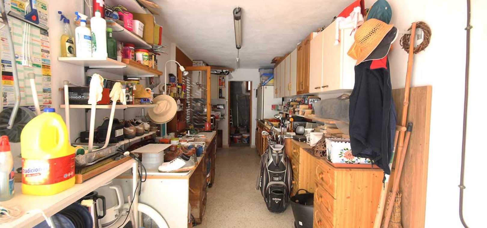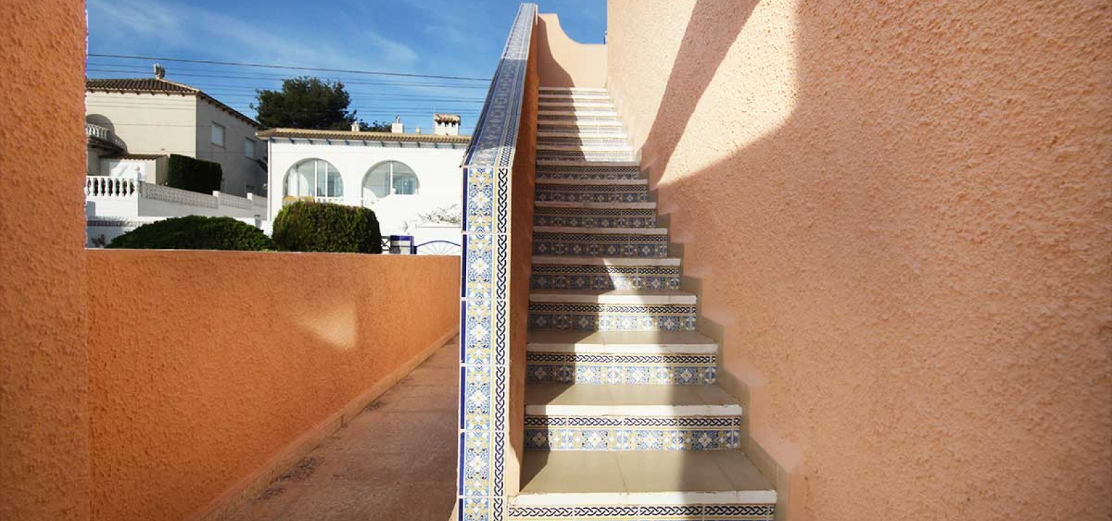 Eine Außentreppe führt hinauf zu einer großen Dachterrasse mit Solarium und beeindruckendem Panoramablick über die Umgebung bis hin zum Mittelmeer. Unterhalb der Terrasse befindet sich ein teilweise ausgebauter Keller, der derzeit als Lagerraum genutzt wird, aber Ausbaupotenzial bietet, sowie ein weiterer Abstellraum im hinteren Bereich.