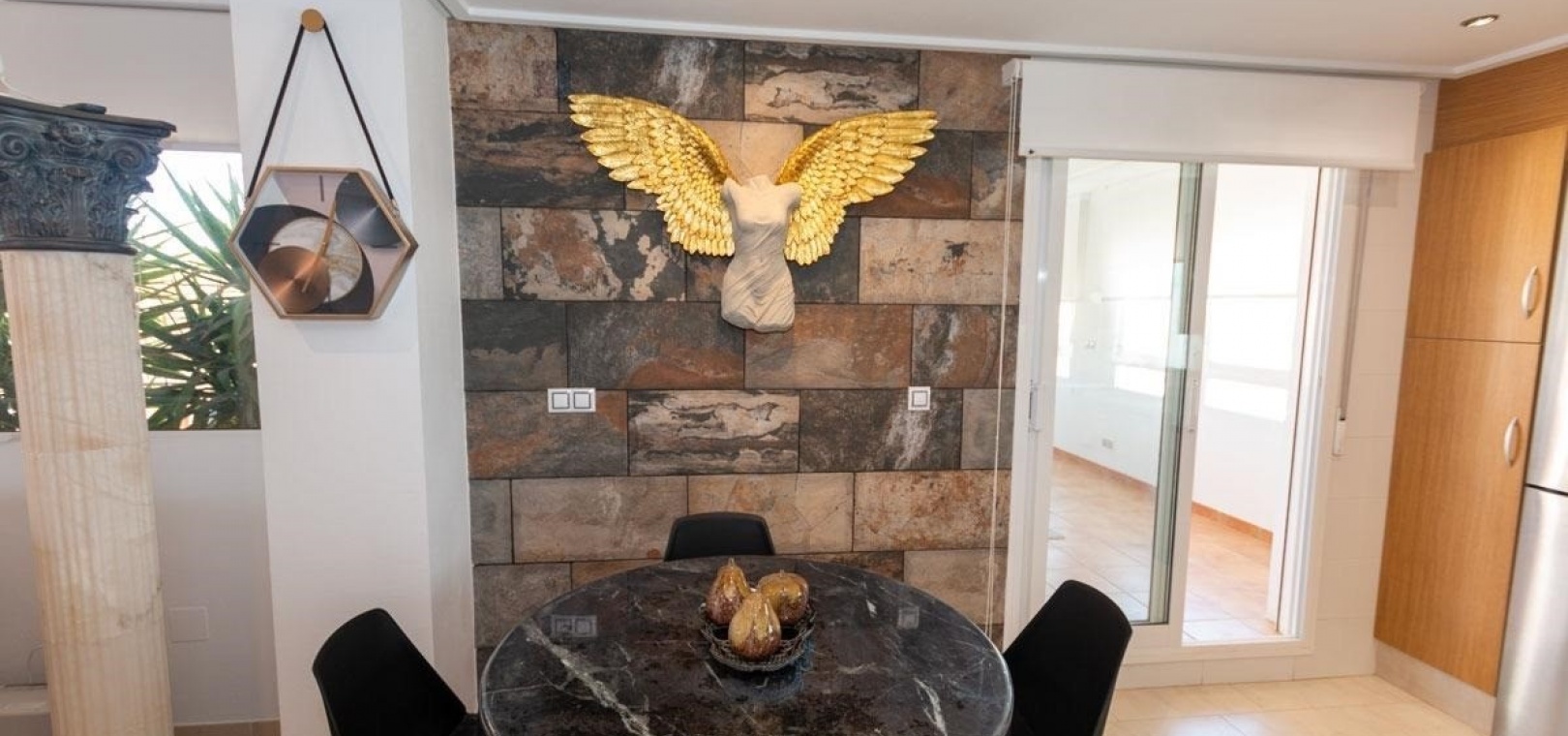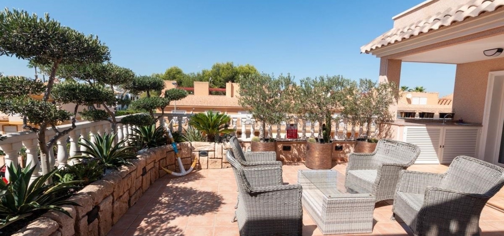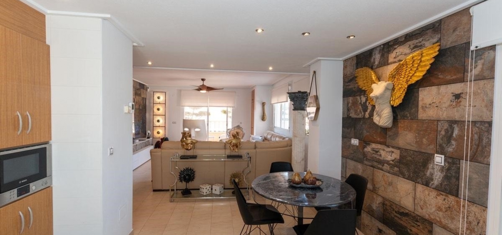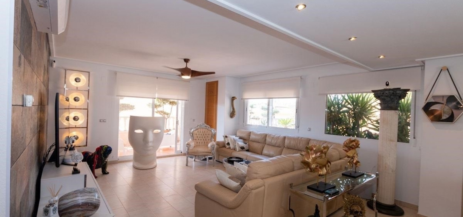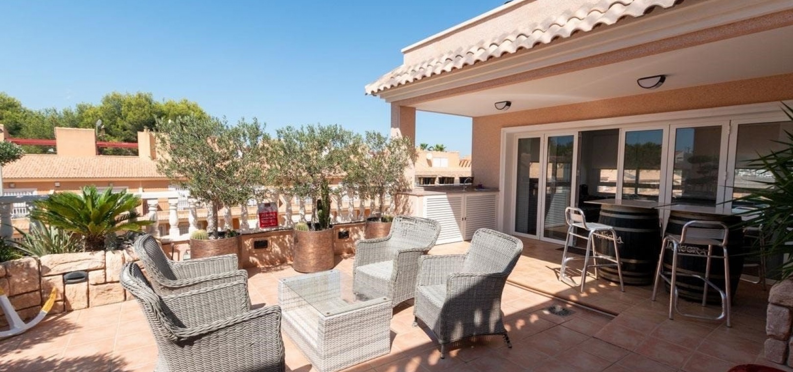 Das Anwesen wurde für modernes Wohnen konzipiert und verfügt über einen hellen, offenen Grundriss mit einer voll ausgestatteten Küche und einem geräumigen Wohn- und Essbereich, komplett mit Klimaanlage und direktem Zugang zu einer großen Eckterrasse – perfekt zum Entspannen oder für gesellige Stunden.