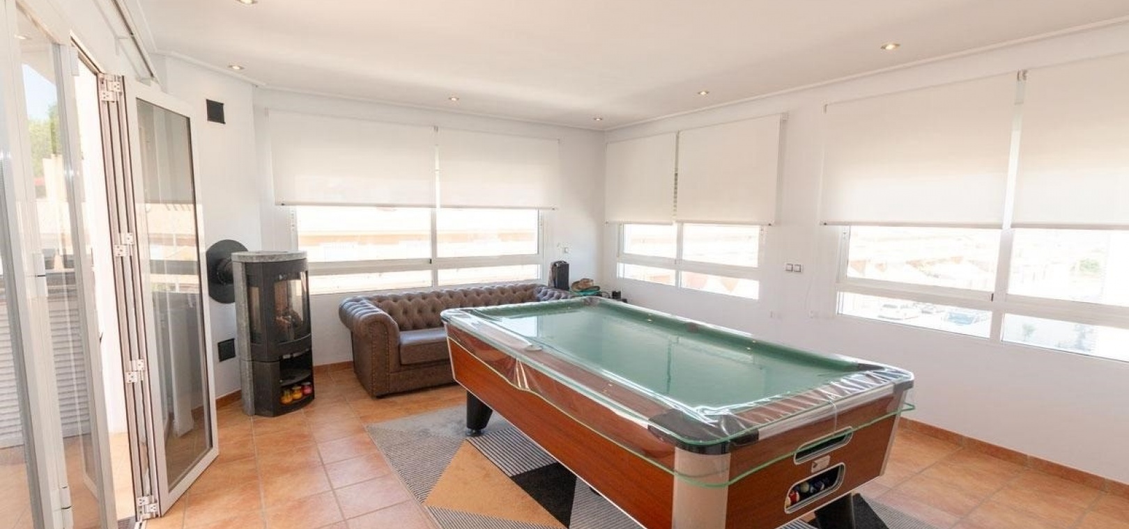 Ein zusätzlicher Loungebereich mit Pelletofen und Billardtisch bietet viel Platz zum Entspannen und geselligen Beisammensein und ermöglicht den direkten Zugang zur weitläufigen Terrasse. Diese ist mit einem Außenwaschbecken und einem praktischen Abstellraum ausgestattet – ideal für komfortables Wohnen im Freien.