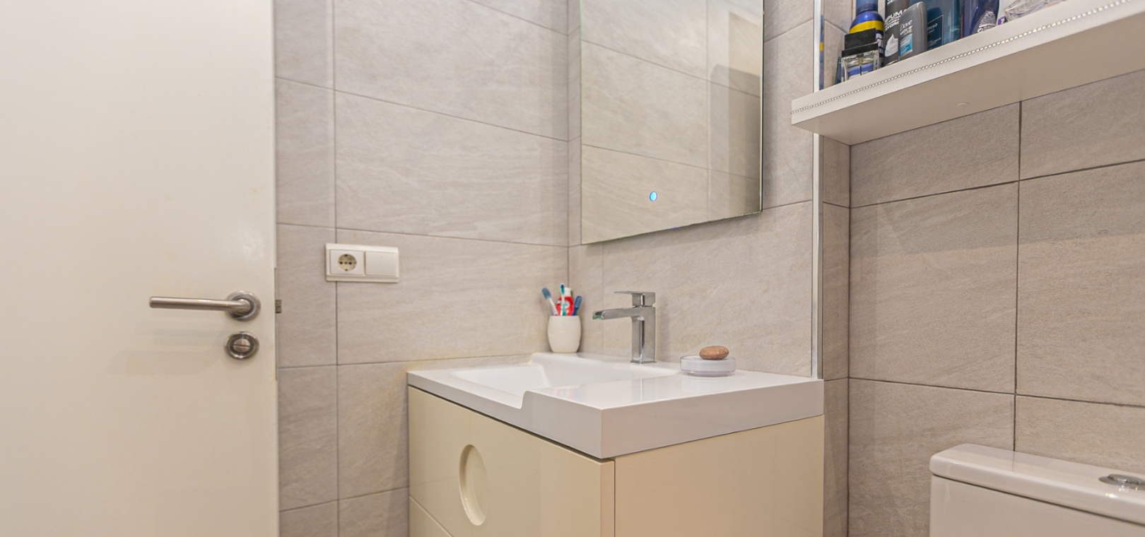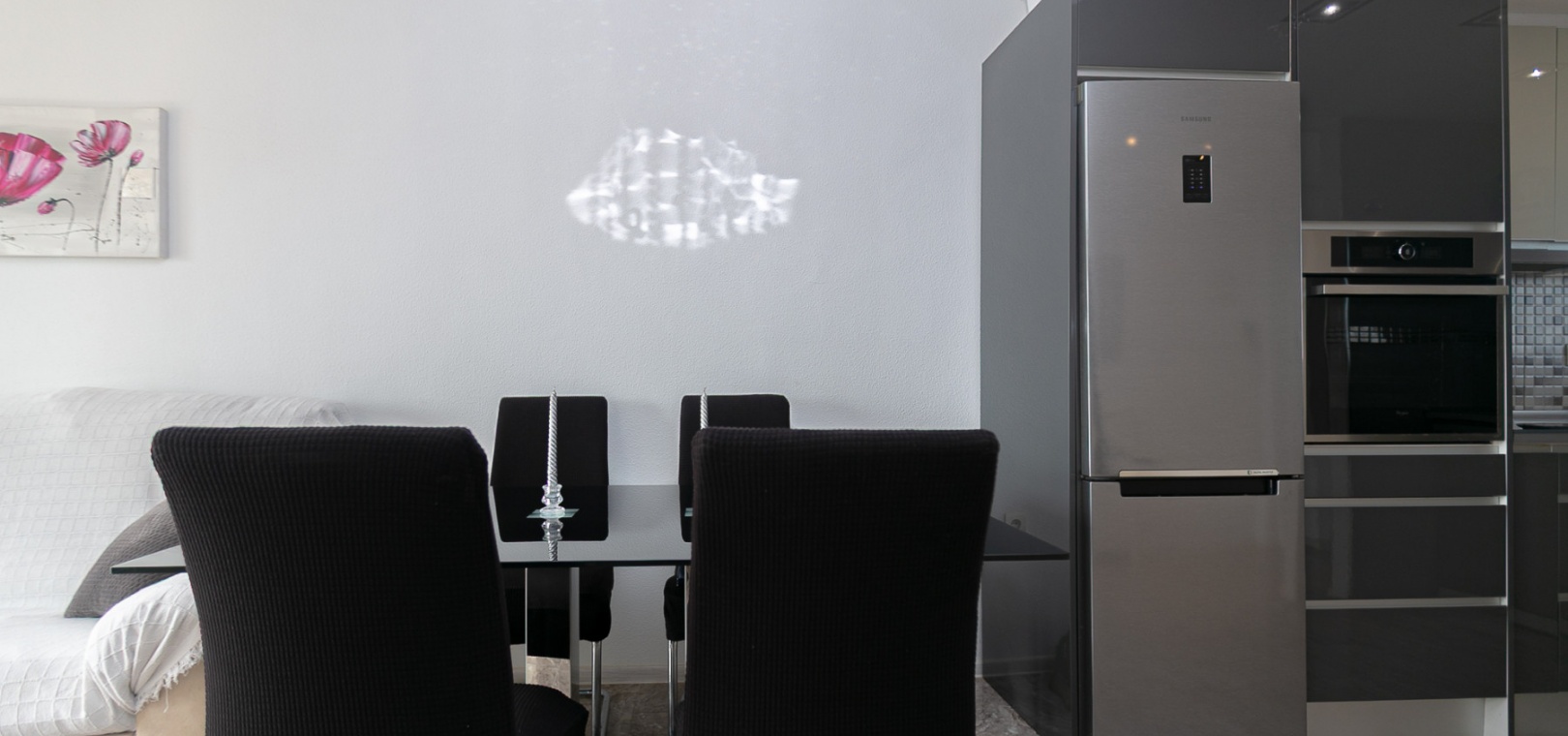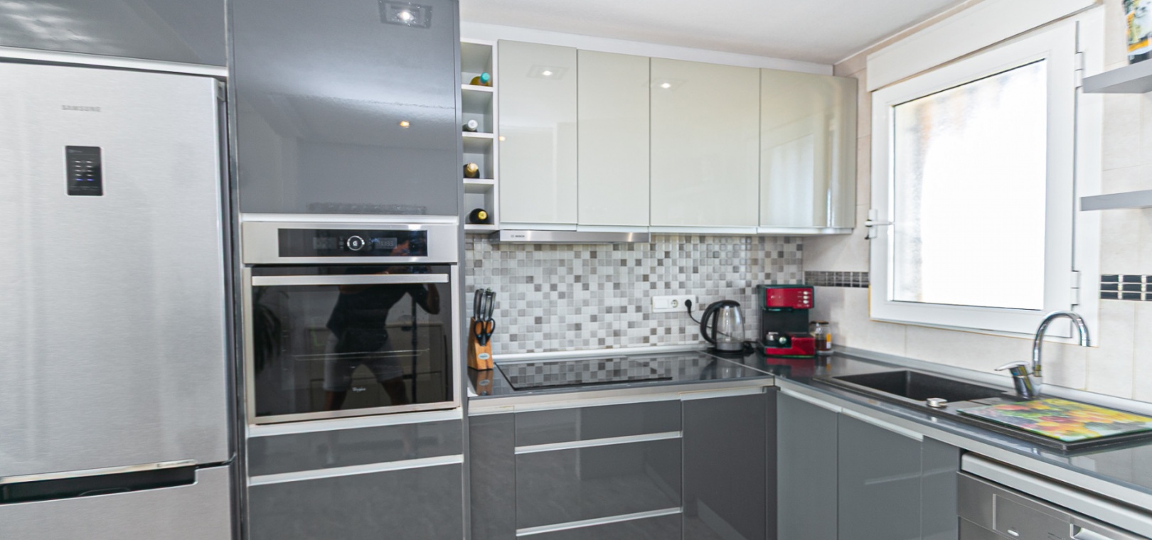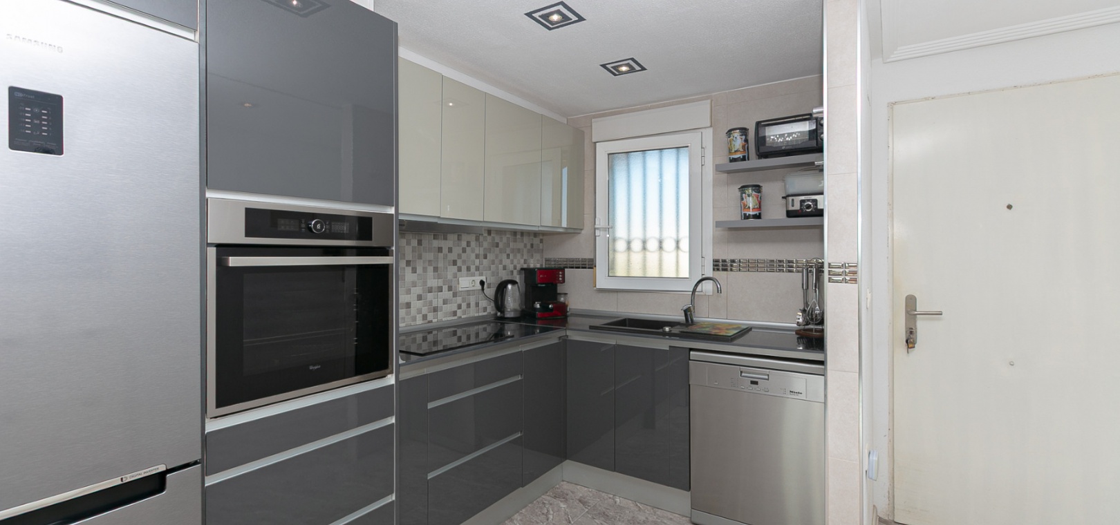 Die Immobilie verfügt über ein Wohn- und Esszimmer mit Zugang zur Terrasse, eine offene, komplett ausgestattete Küche, zwei geräumige Schlafzimmer mit Einbauschränken, sowie ein modernes Bad mit Dusche, in dem sich auch die Waschmaschine befindet.