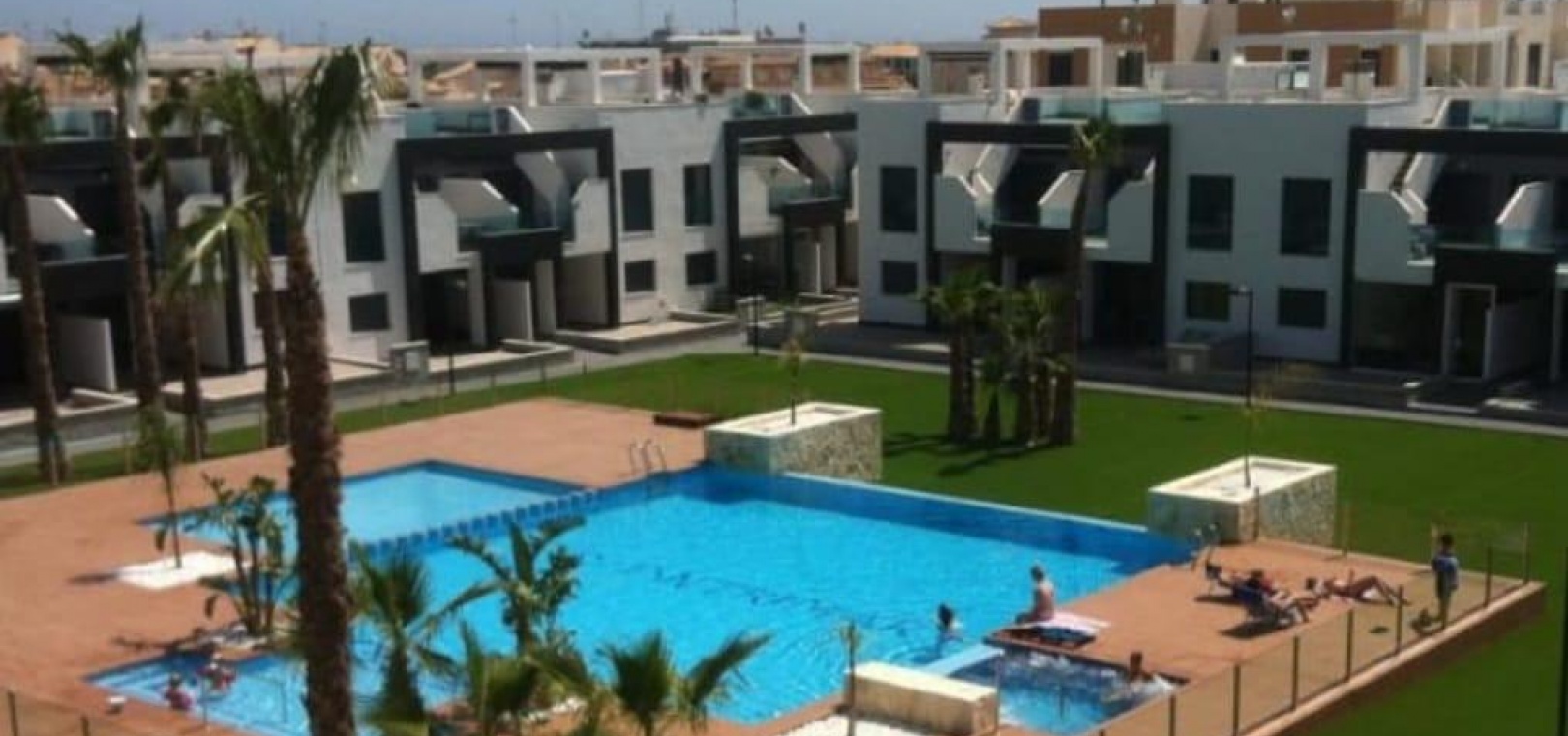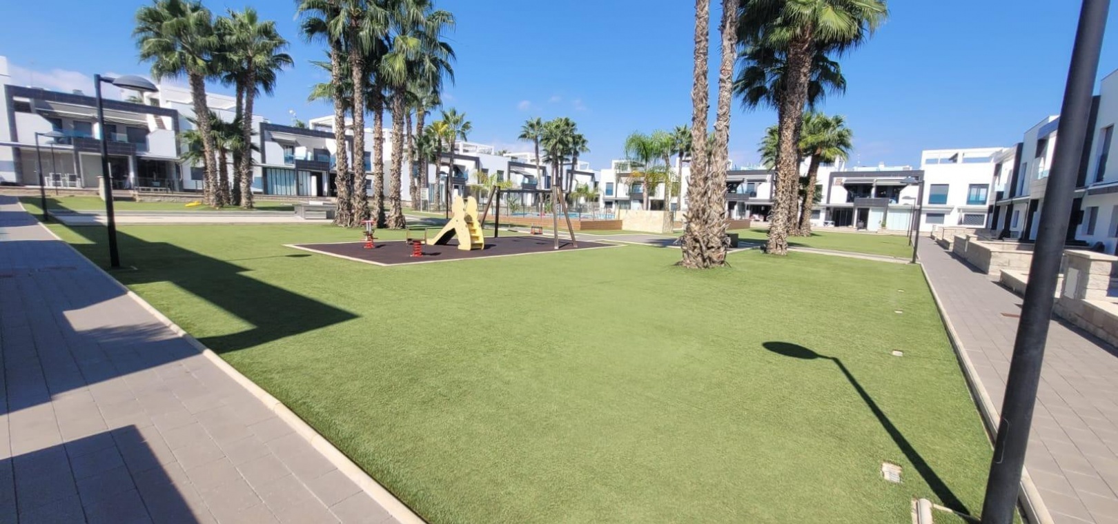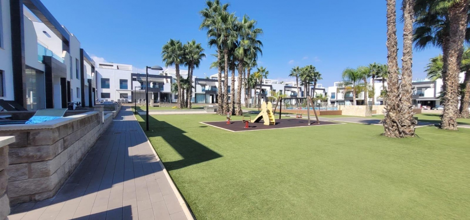 Die Wohnanlage bietet zwei große Gemeinschaftspools mit Liege- und Entspannungsbereichen, ein separates Kinderbecken, Spielplätze und tadellos gepflegte Gärten – alles in einer sicheren und ruhigen Umgebung neben einer grünen Parkanlage.