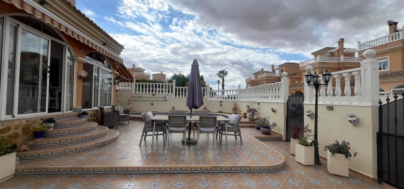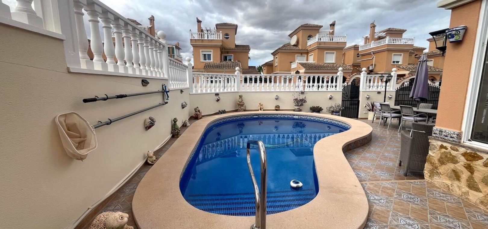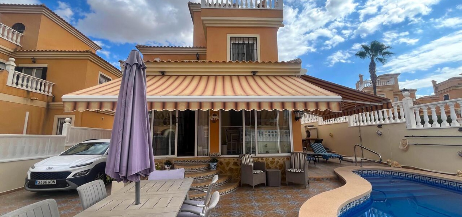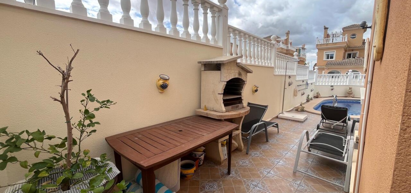 Der umlaufende Garten ist pflegeleicht und komplett gefliest und verfügt über einen privaten Swimmingpool, einen separaten Grillplatz sowie elektrische Markisen, die auf Knopfdruck angenehmen Schatten spenden. Dieser traumhafte Außenbereich ist perfekt zum Entspannen, für gesellige Stunden oder einfach zum Genießen der spanischen Sonne.